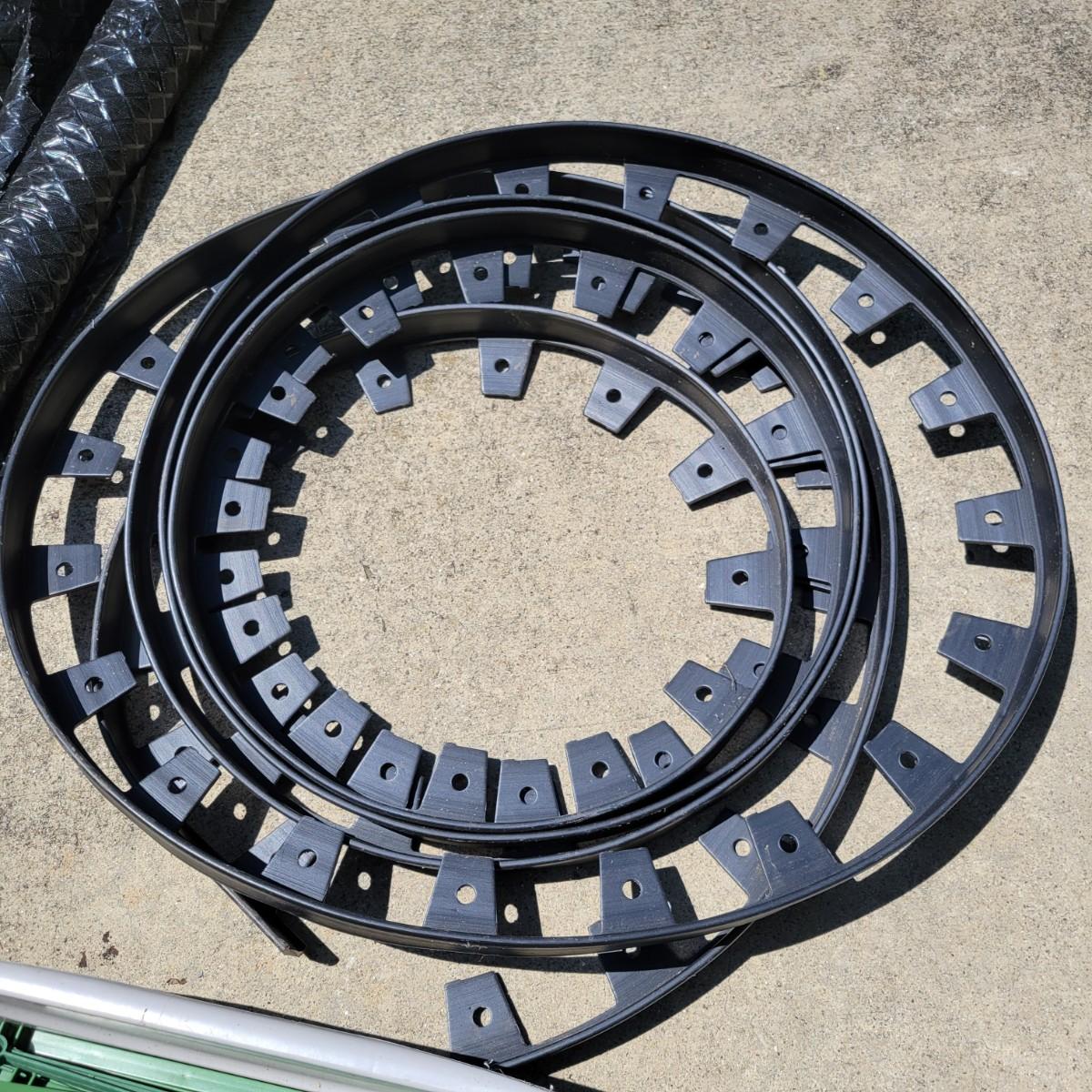 An assortment of garden accessories that includes a variety of plant stakes and connectors, flower bed edging, landscaping fabric with spikes and staples. The longest stakes measure approximately 6' in length. Local pickup only