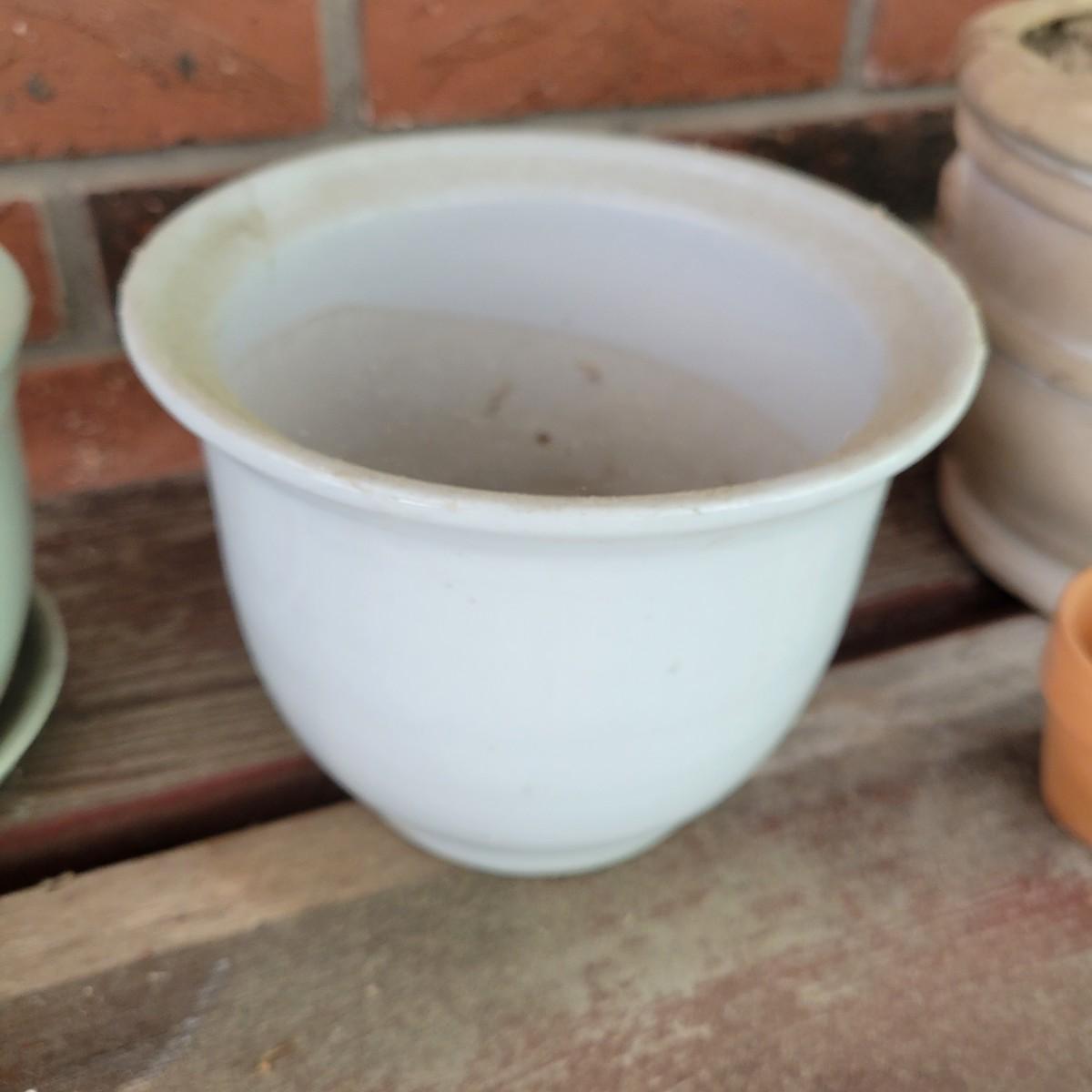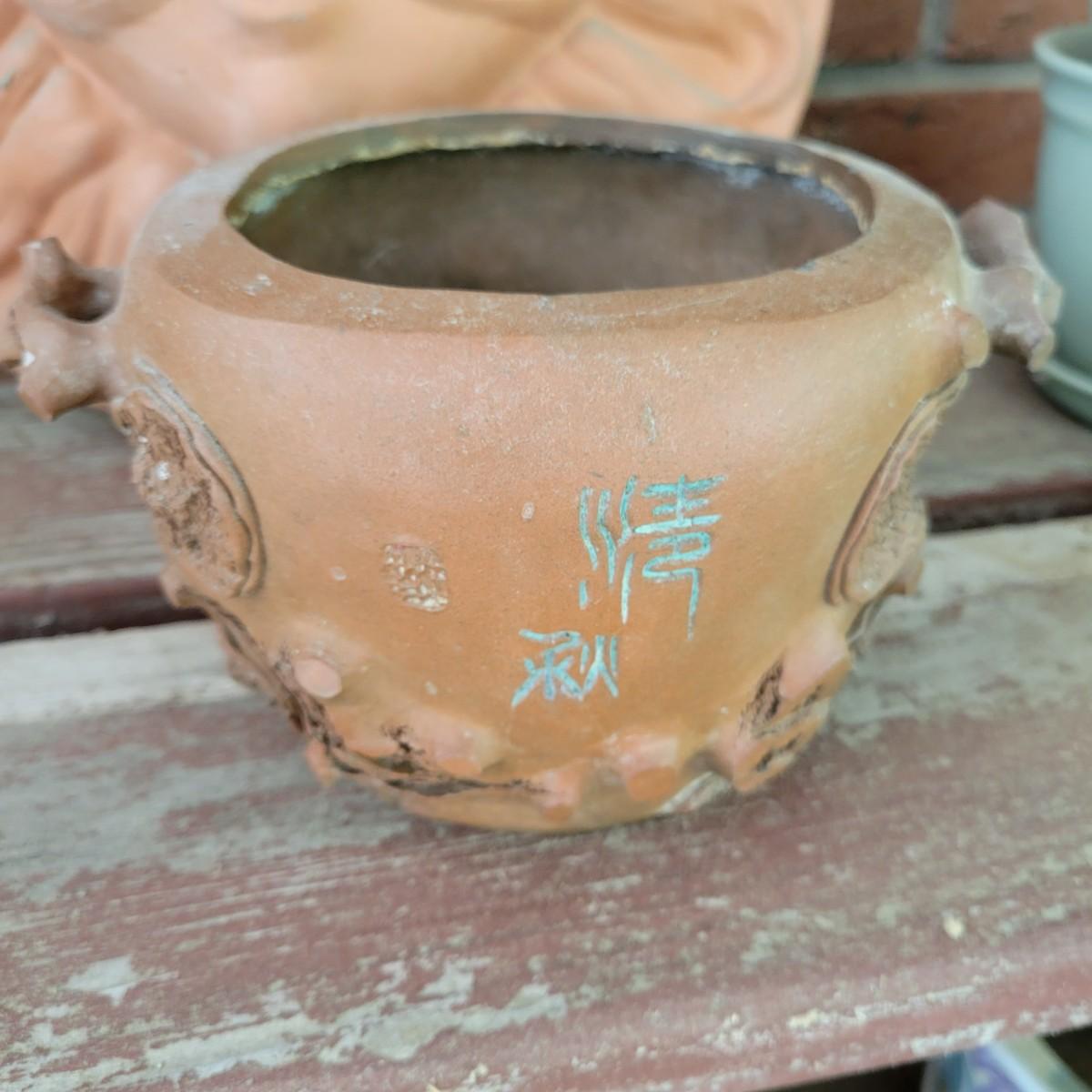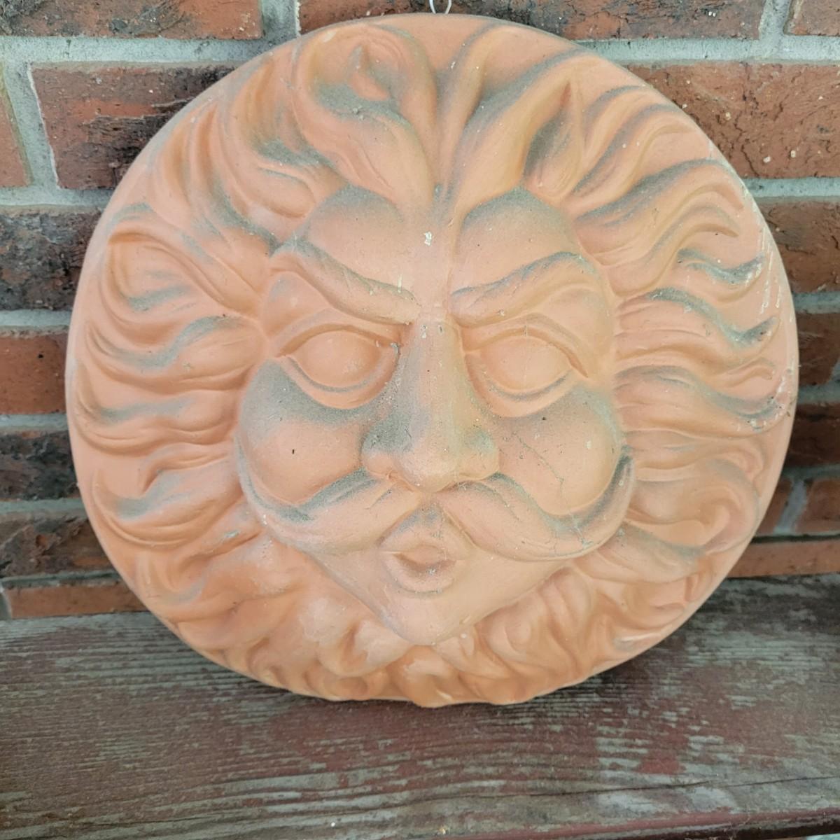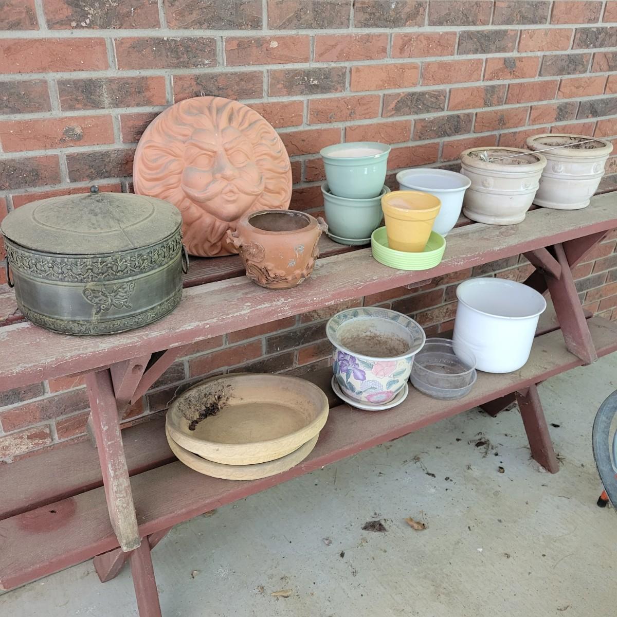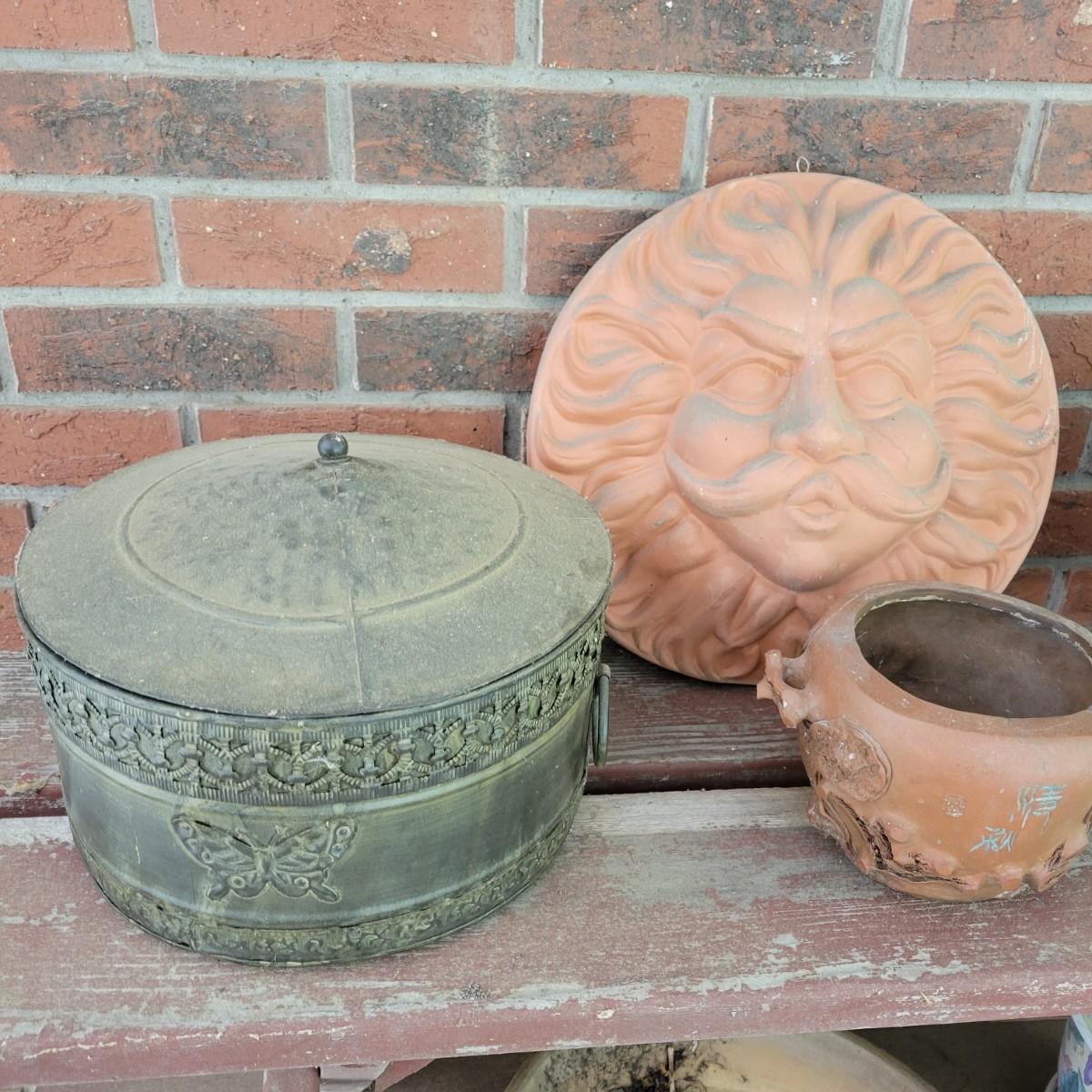 An assortment of planters, all of which is terracotta or ceramic, except for one piece that is metal. This lot also includes a terracotta sun and a small dragonfly. The decorative metal planter measures approximately 12"D x 7"H. Local pickup only