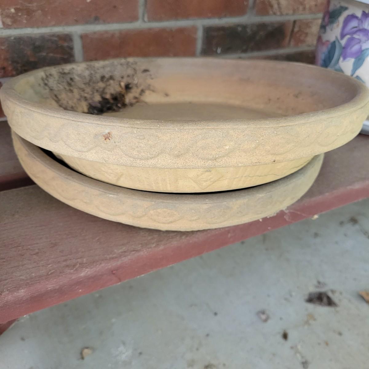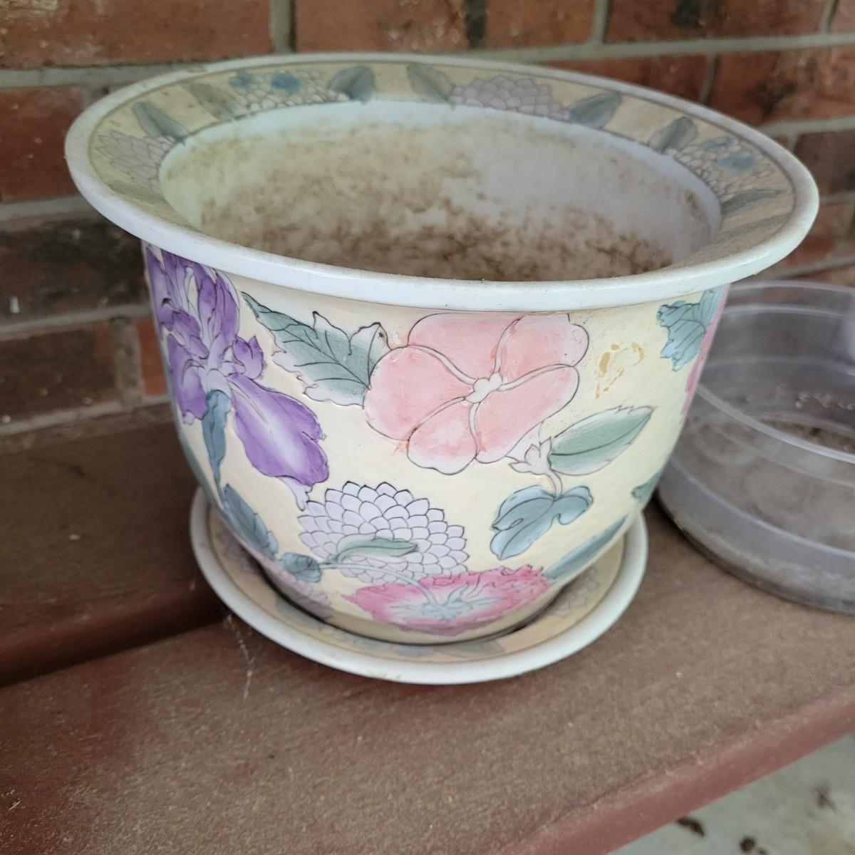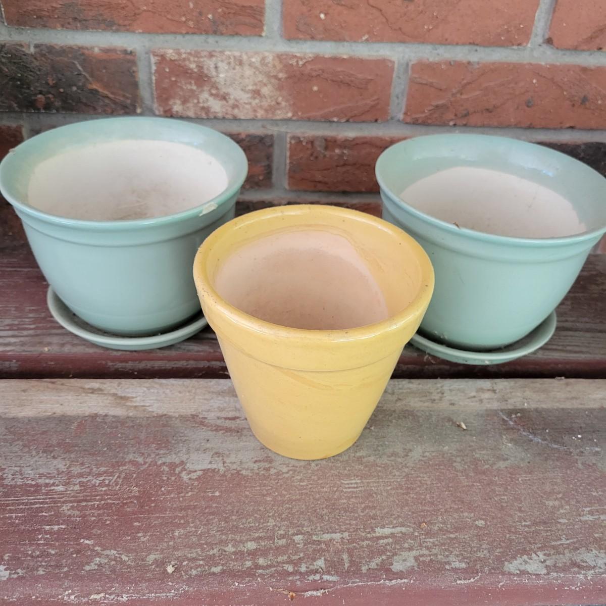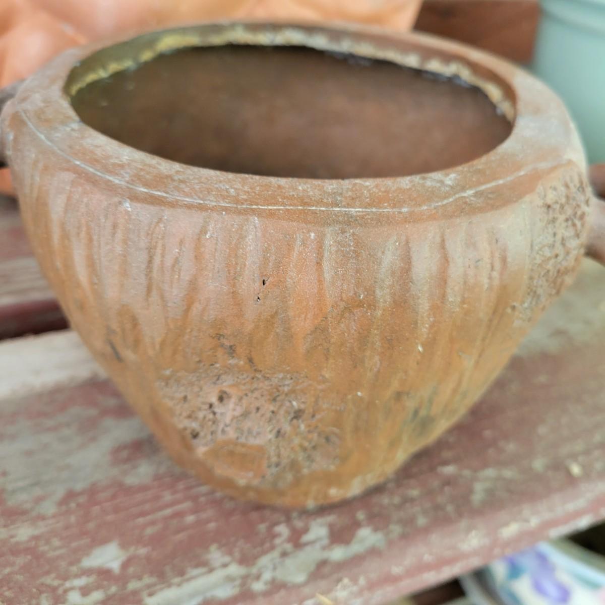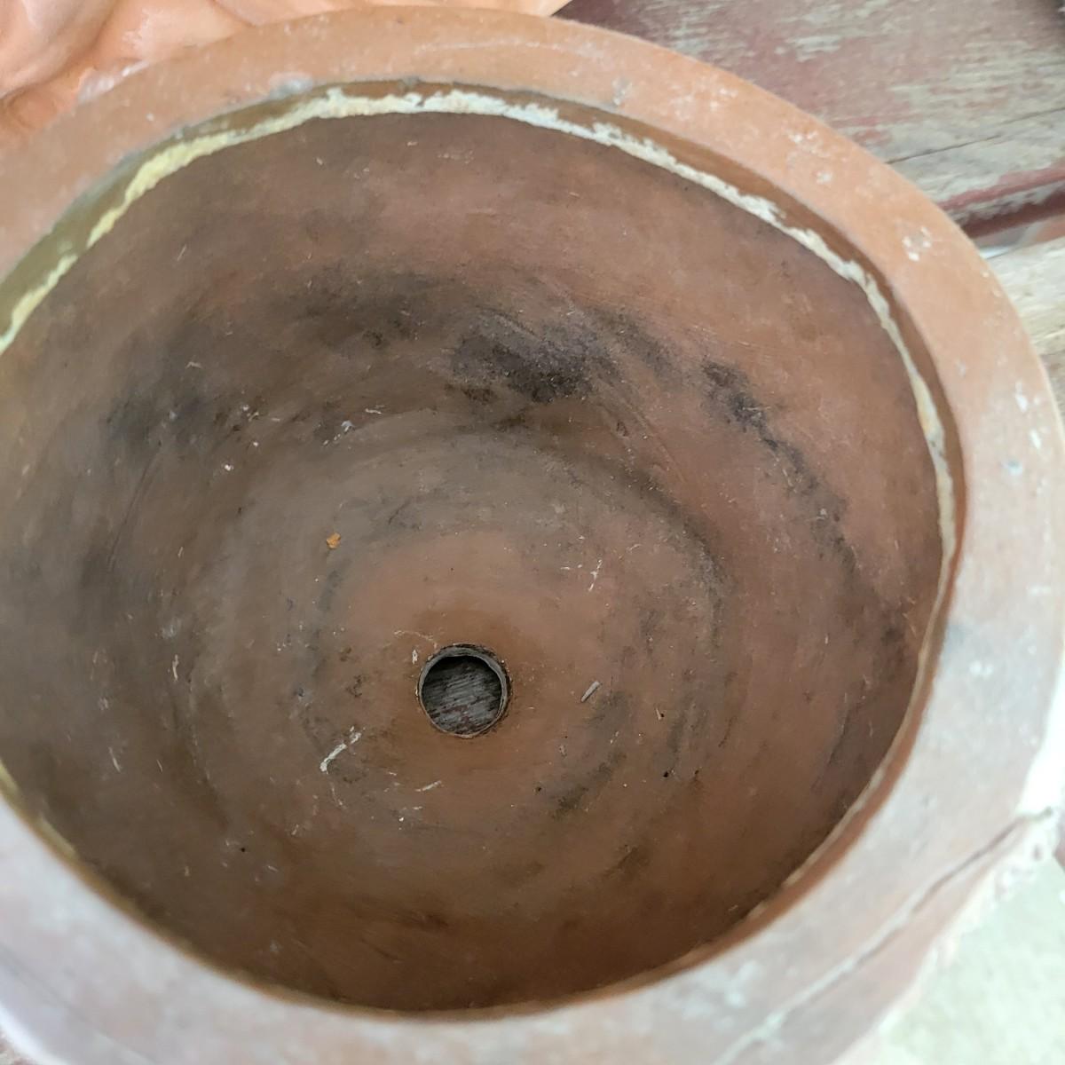 An assortment of planters, all of which is terracotta or ceramic, except for one piece that is metal. This lot also includes a terracotta sun and a small dragonfly. The decorative metal planter measures approximately 12"D x 7"H. Local pickup only