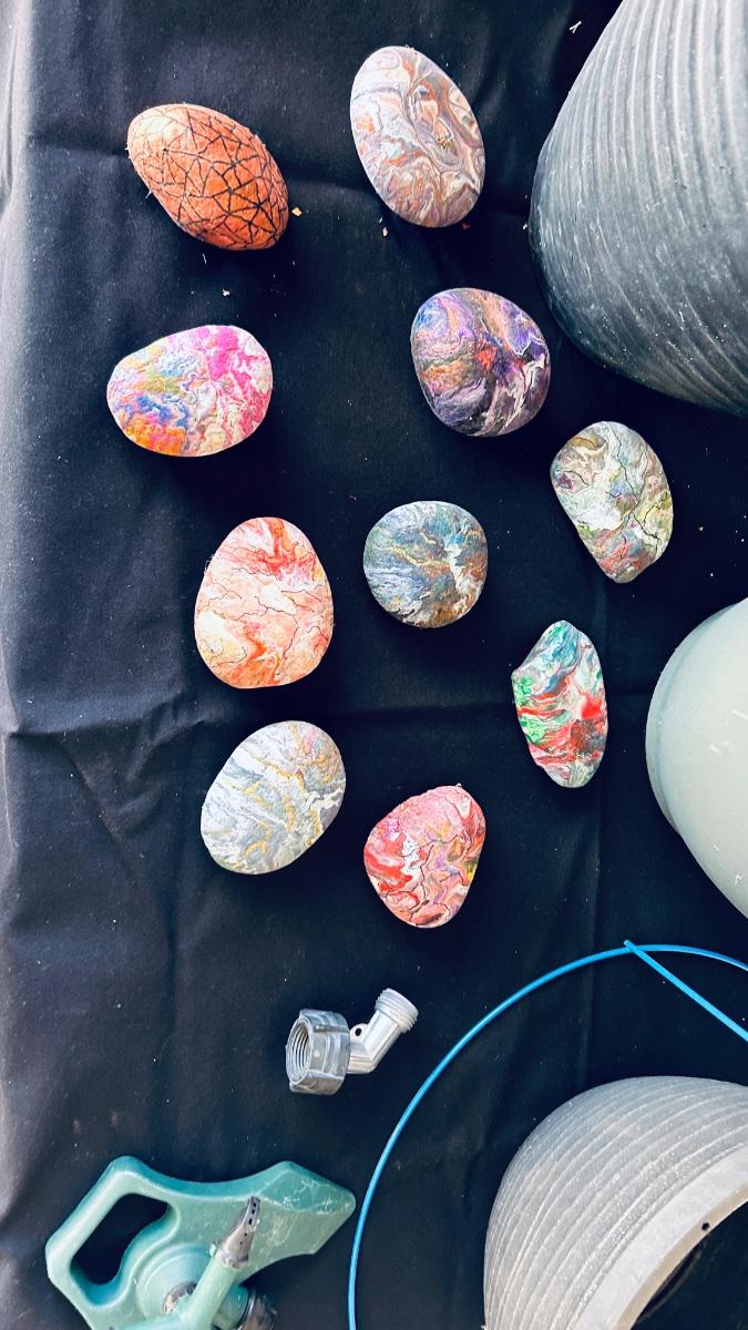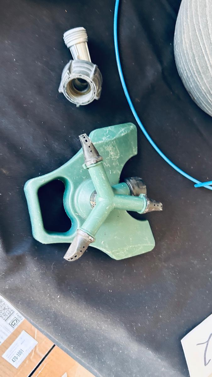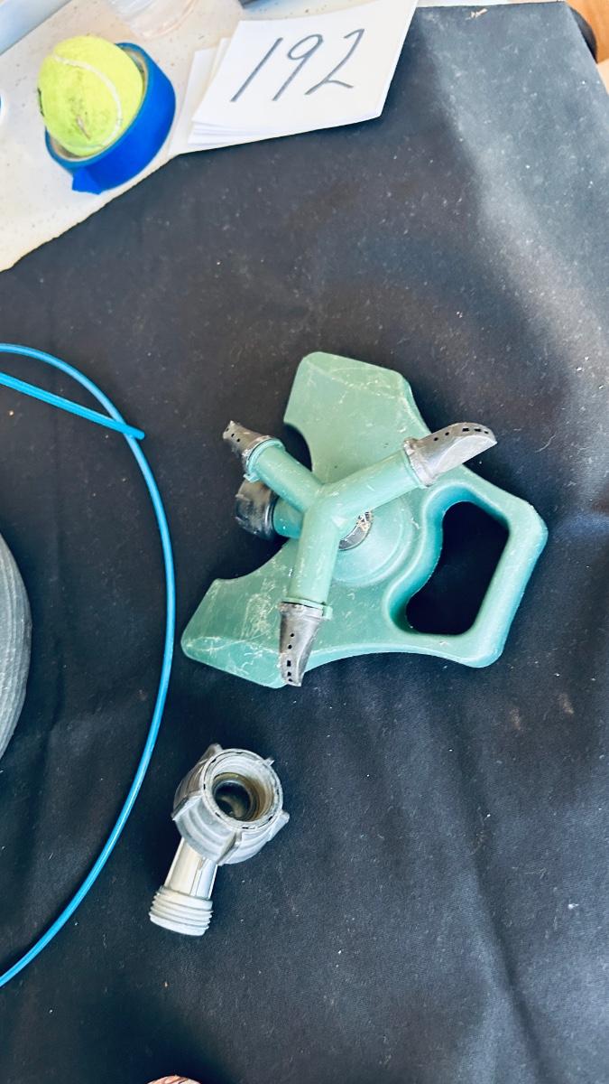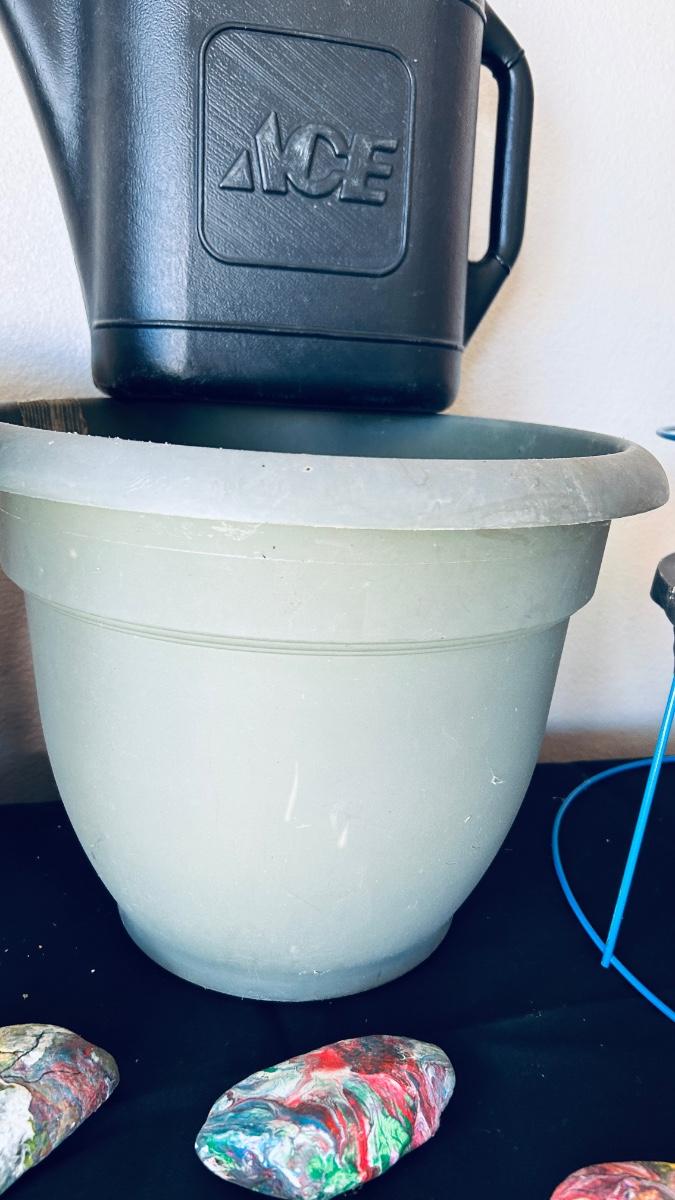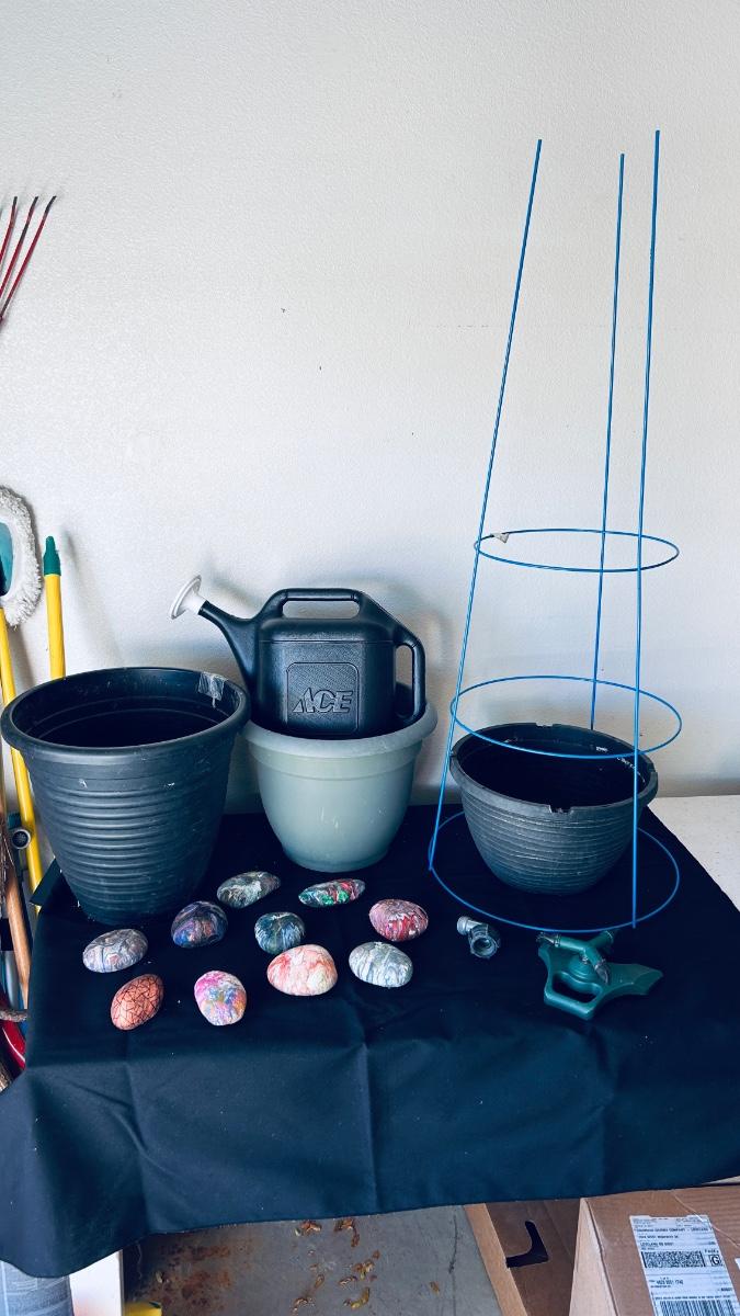 PLANTERS, PAINTED ROCKS, TOMATO CAGE AND SPRINKLER