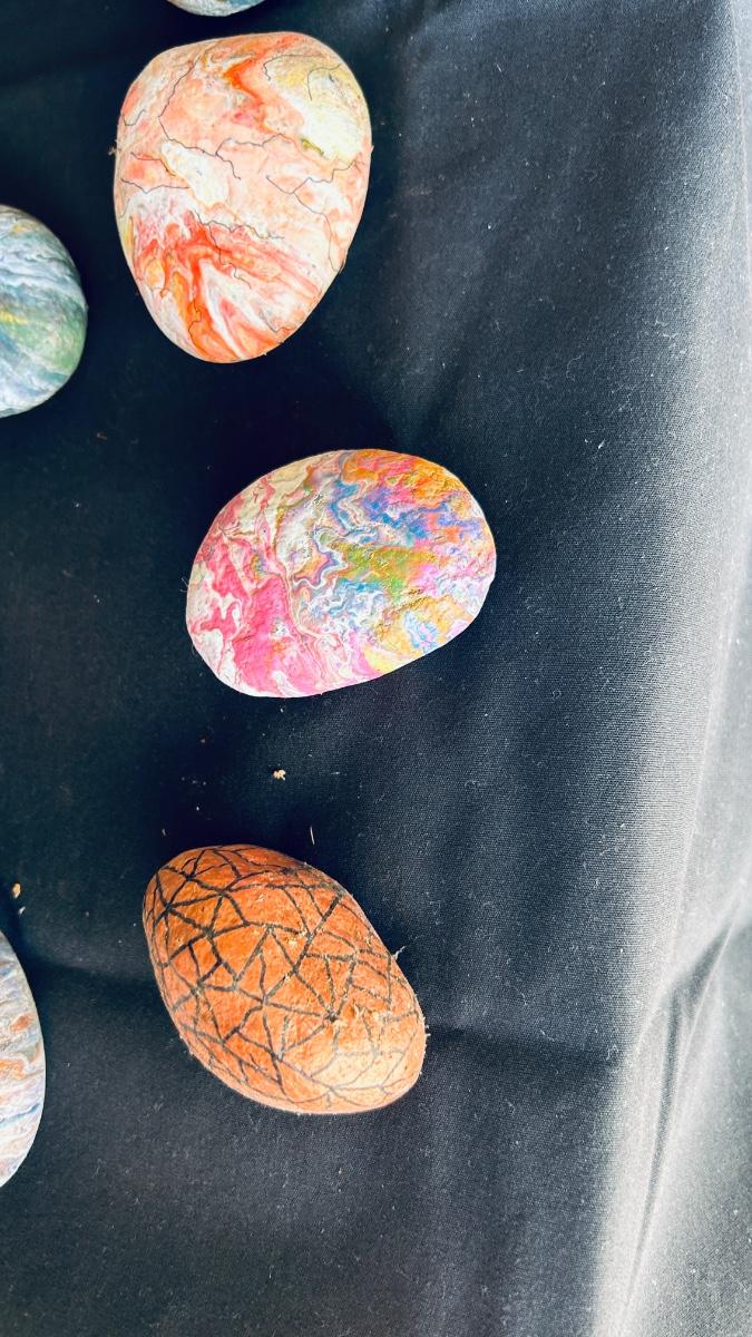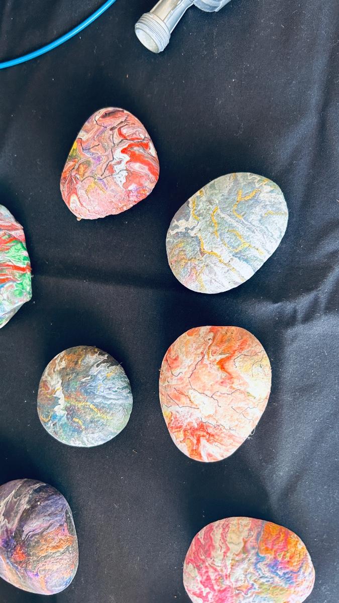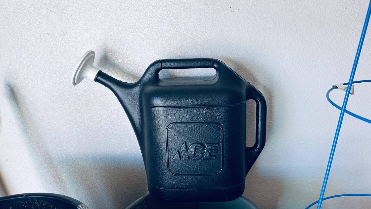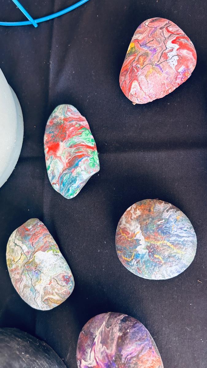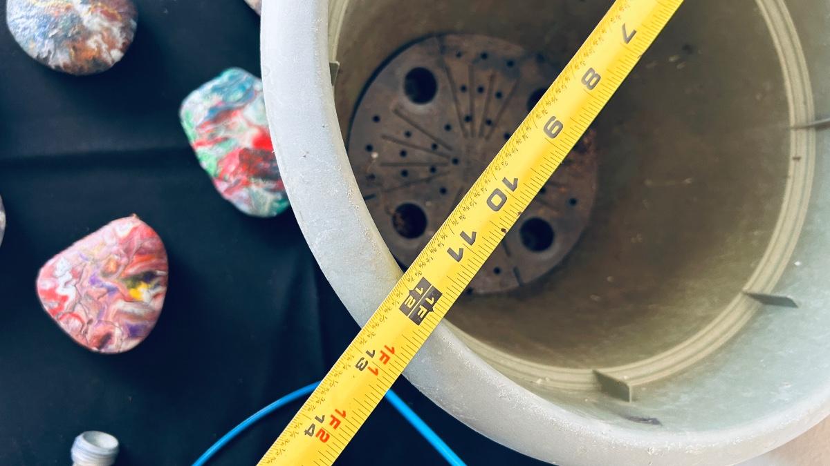PLANTERS, PAINTED ROCKS, TOMATO CAGE AND SPRINKLER