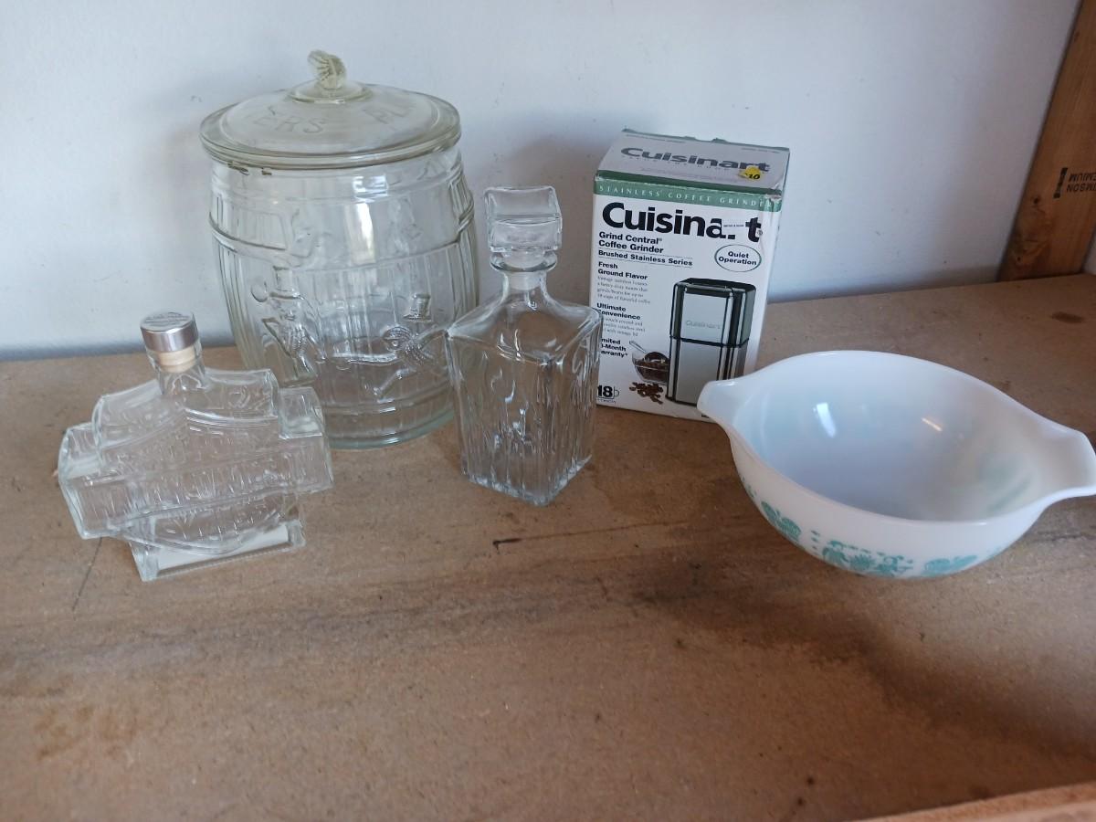 PLANTERS PEANUTS GLASS CANISTER, COFFEE GRINDER, PYREX BOWL AND MORE