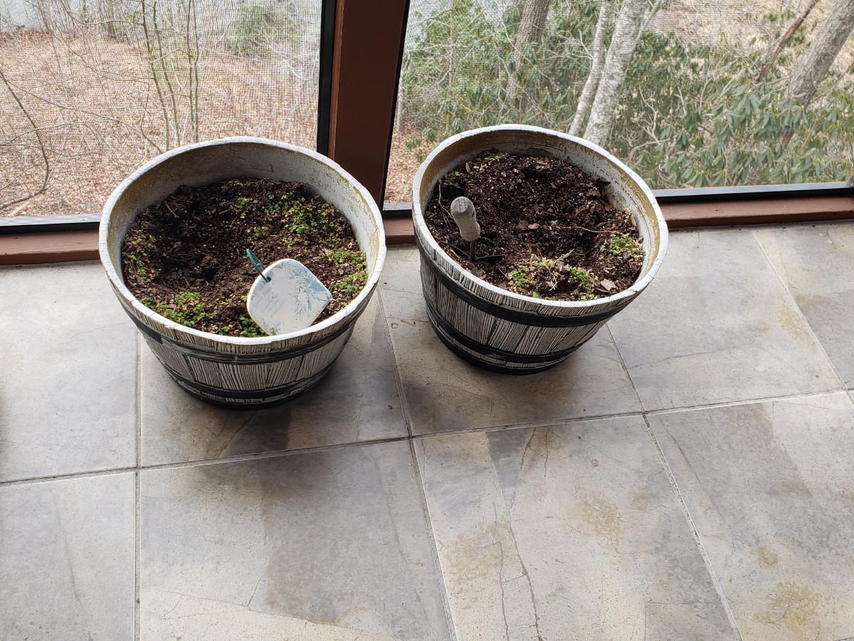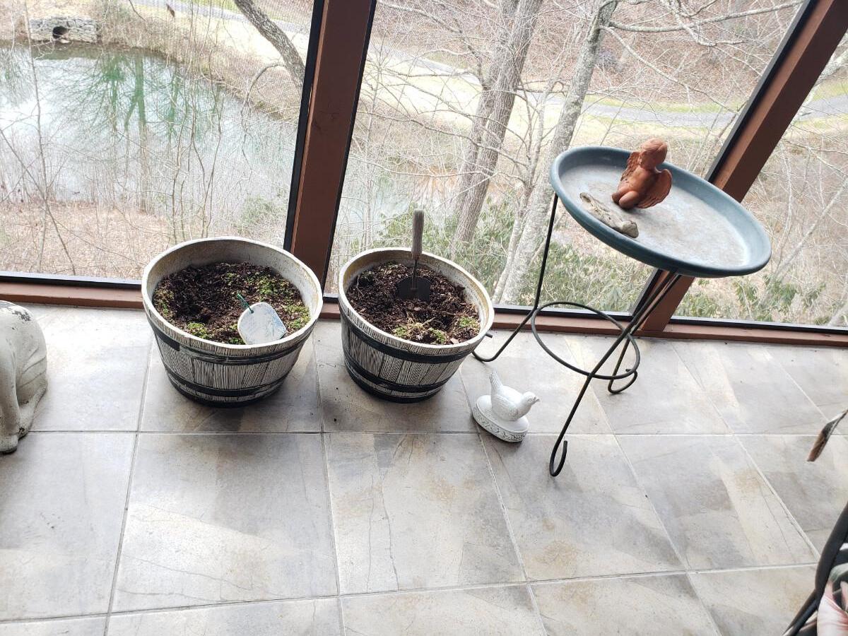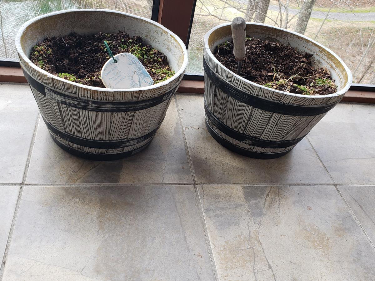 Barrel planters are made of plastic. Table could be used as a plant stand or a bird bath depending on what side of nature and the outdoors you're leaning toward..