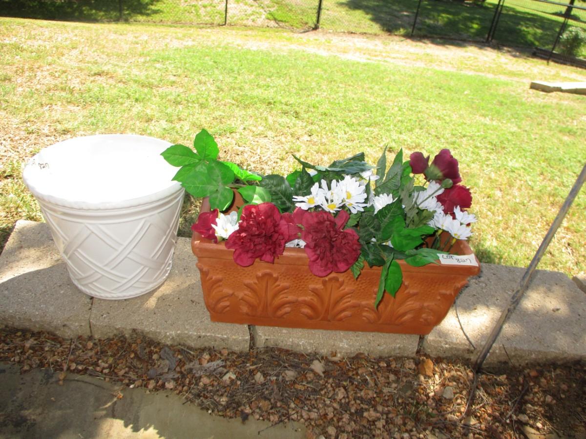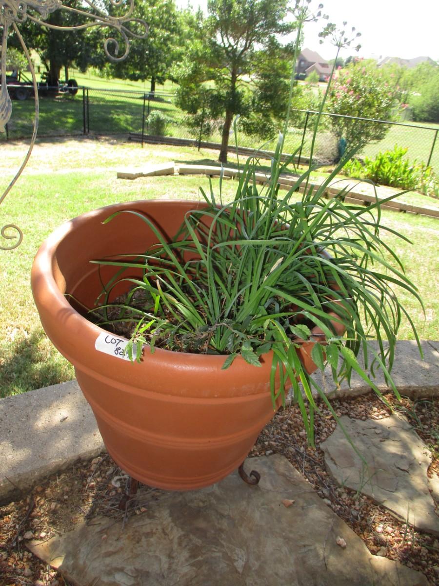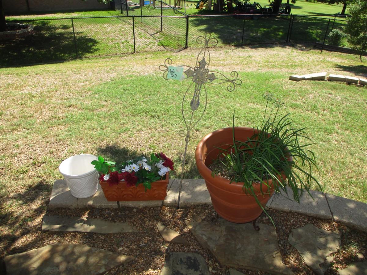 Metal Cross, Terra Cotta Planter, Ceramic, and plastic pots