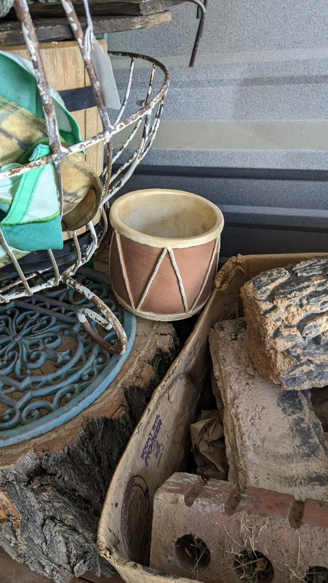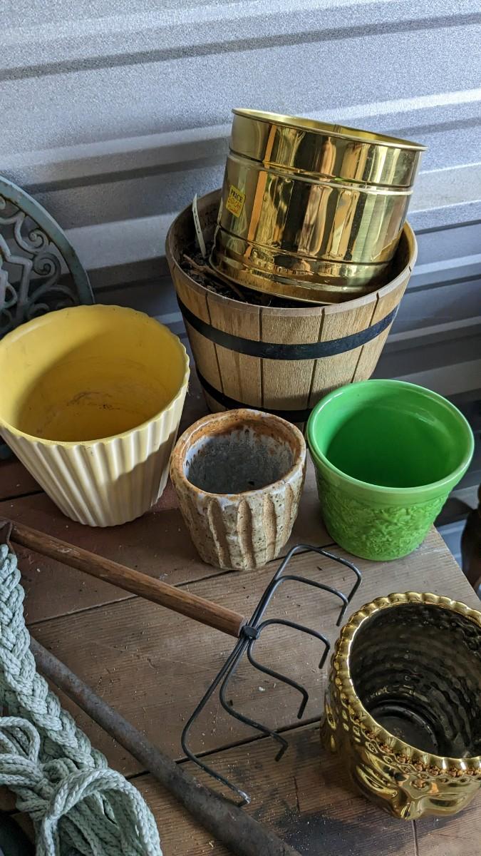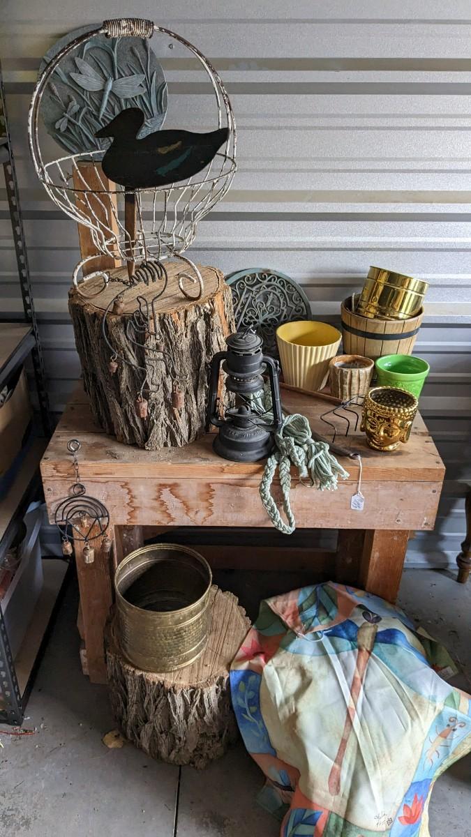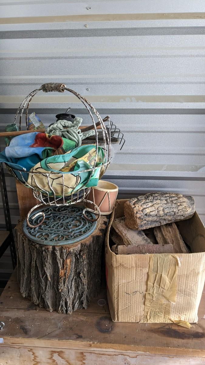 get ready to get your garden going with this great 36"x22"x31.5' potting bench with 22.5" arm, 3 large wood stumps, pots, windchimes, and outdoor decorative items. Please note buddha head pot broke immediately after photos and is NOT INCLUDED. No shipping. 2604