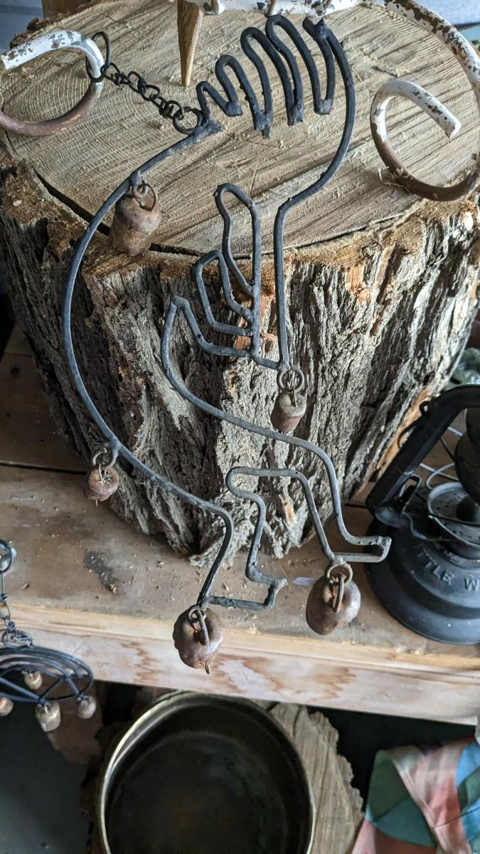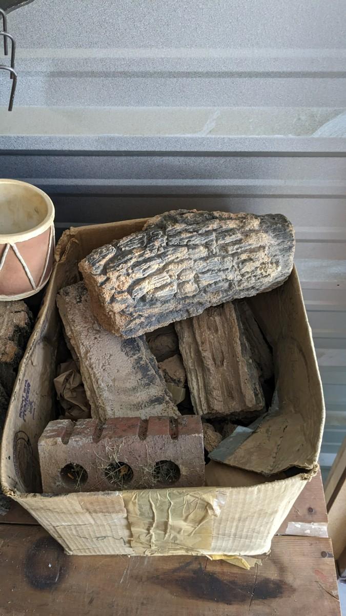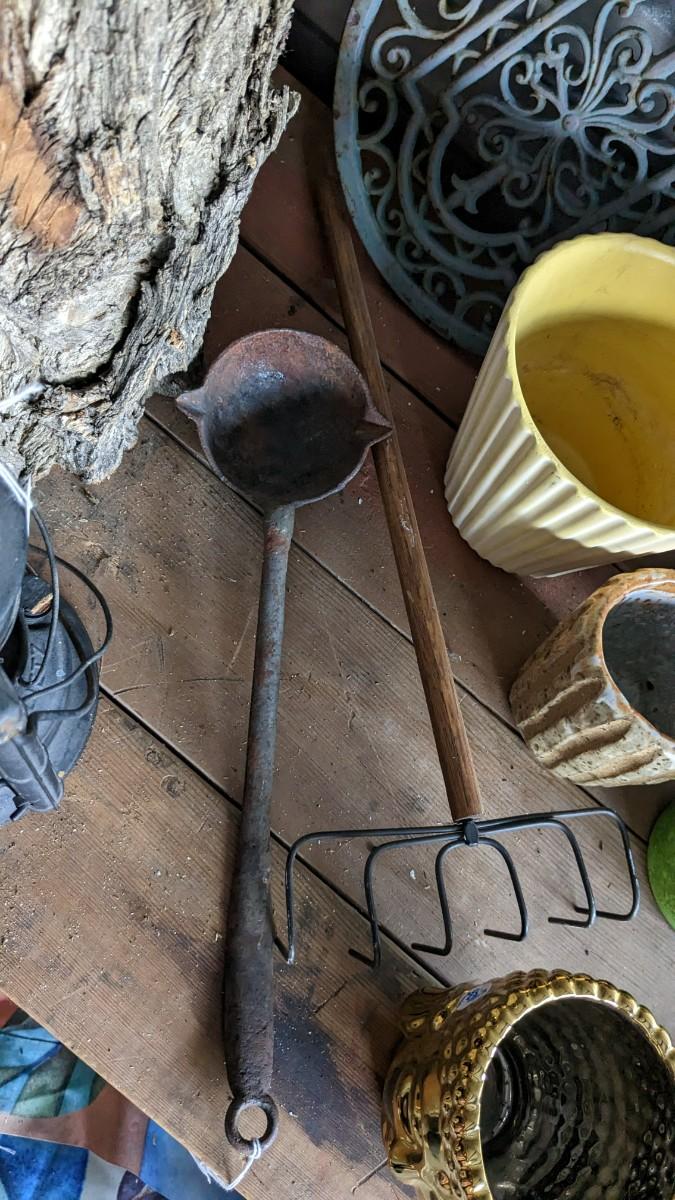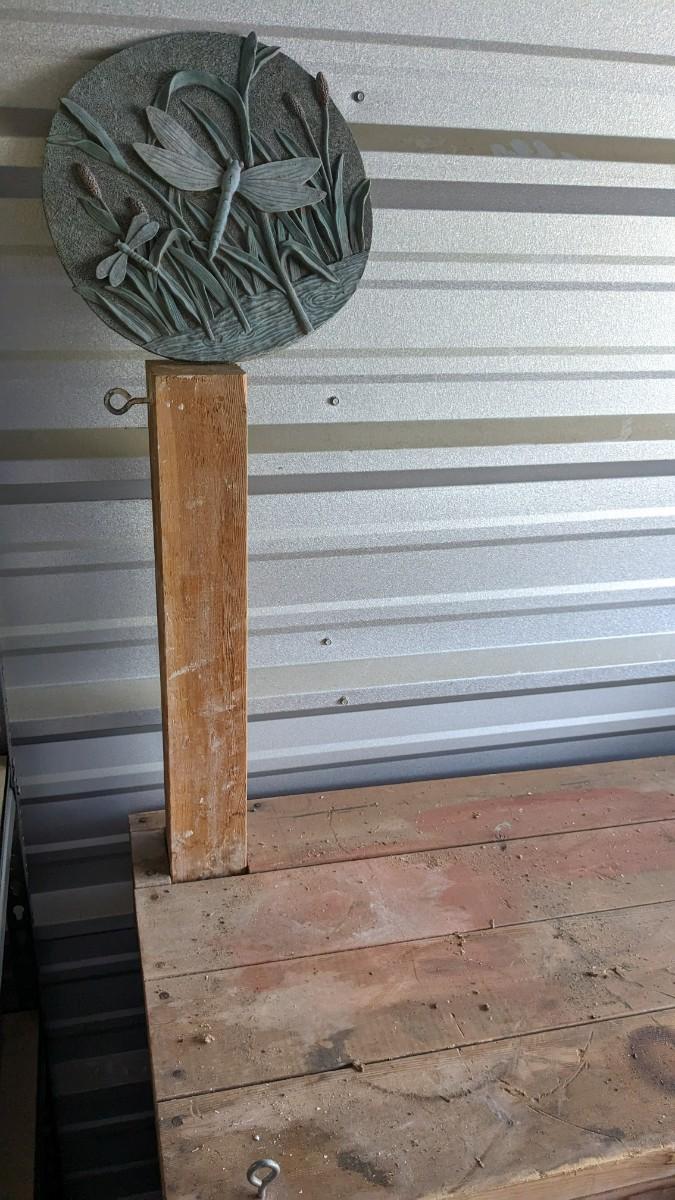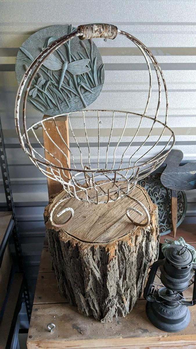 get ready to get your garden going with this great 36"x22"x31.5' potting bench with 22.5" arm, 3 large wood stumps, pots, windchimes, and outdoor decorative items. Please note buddha head pot broke immediately after photos and is NOT INCLUDED. No shipping. 2604
