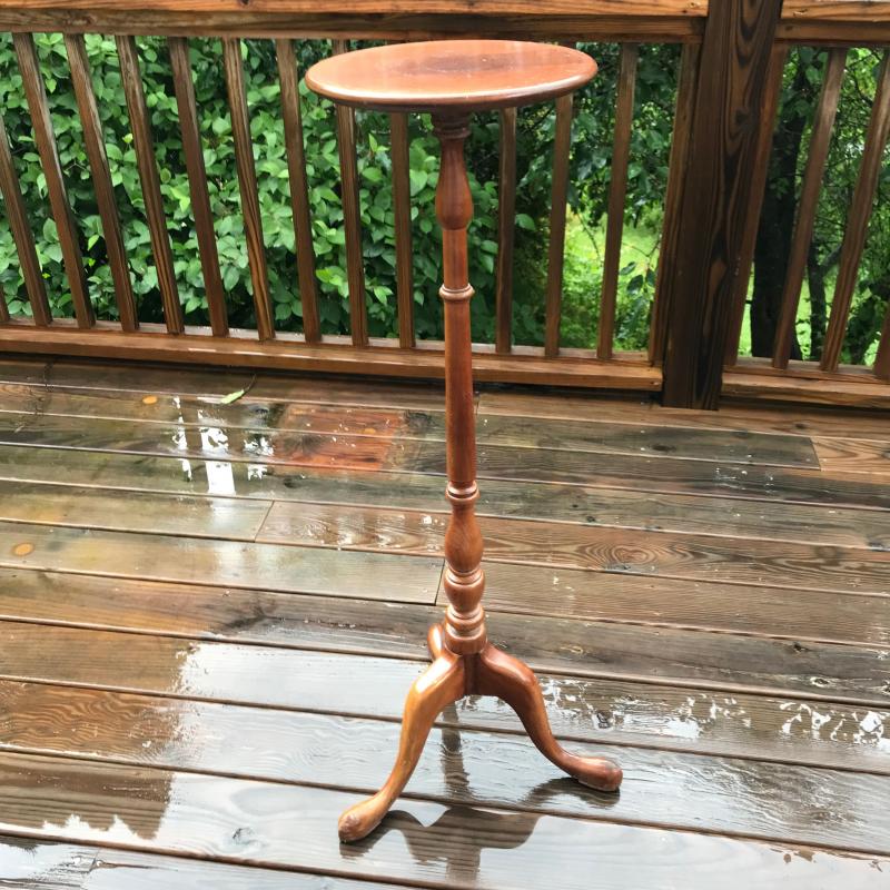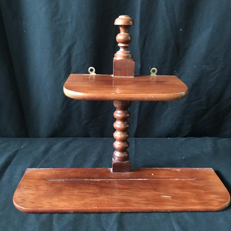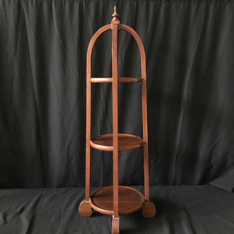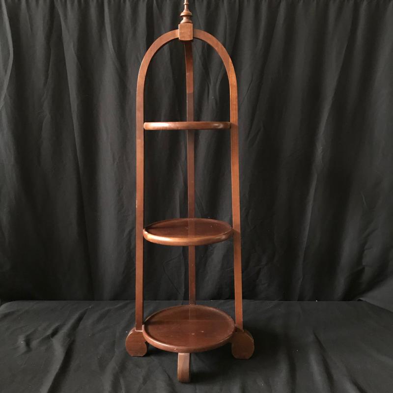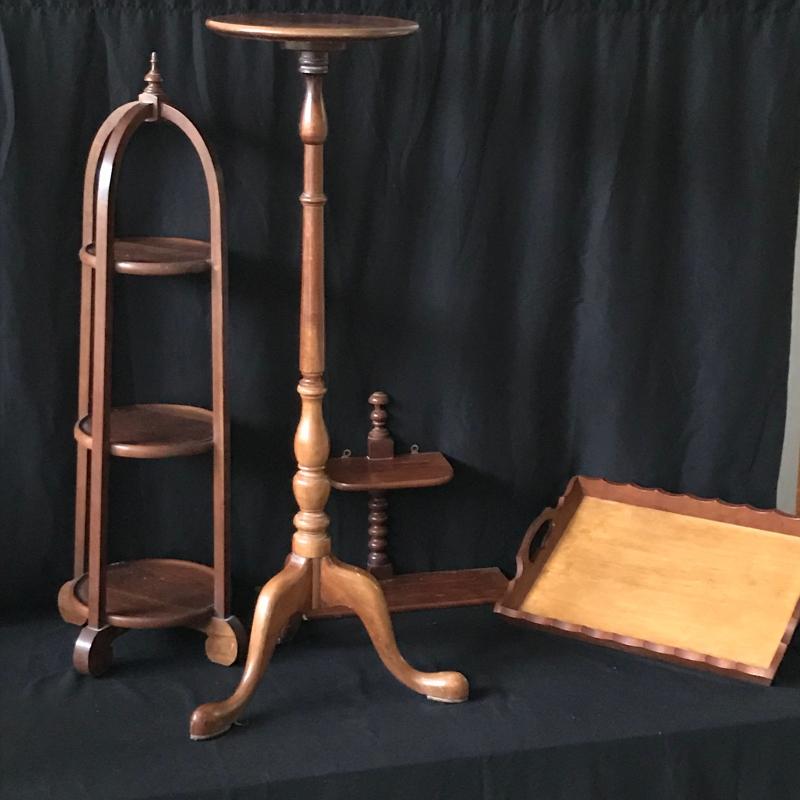 Lot contains wooden plant stand (approx. 40” tall), tiered stand (approx. 39” tall), wall shelf for displaying collectibles, and tray. No shipping available. Local pickup only in Hendersonville, NC.