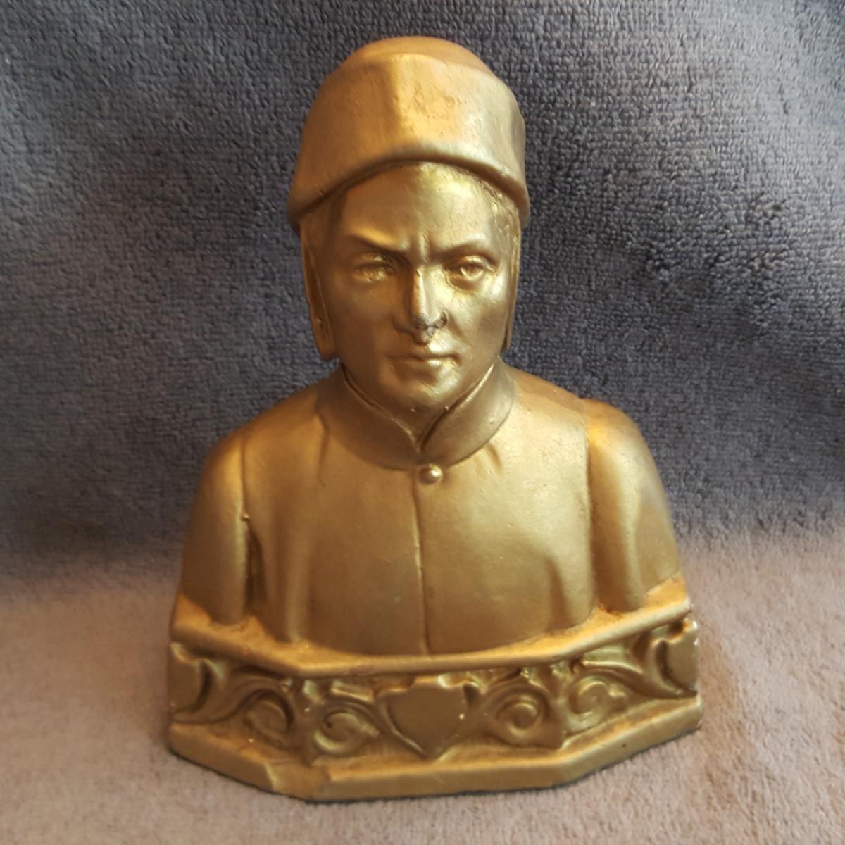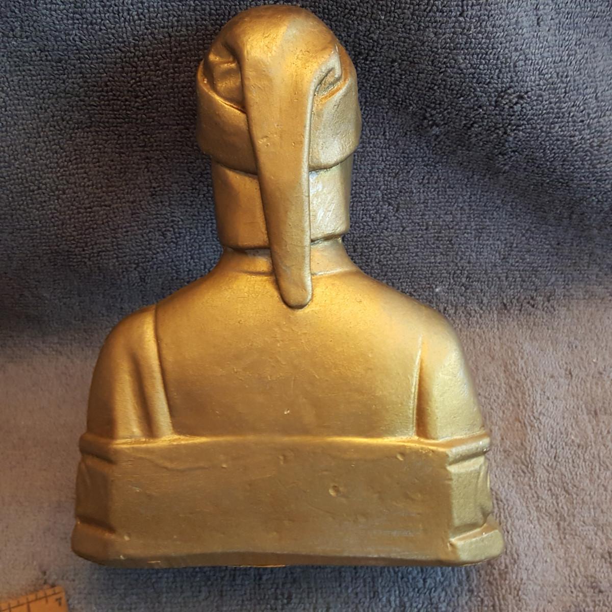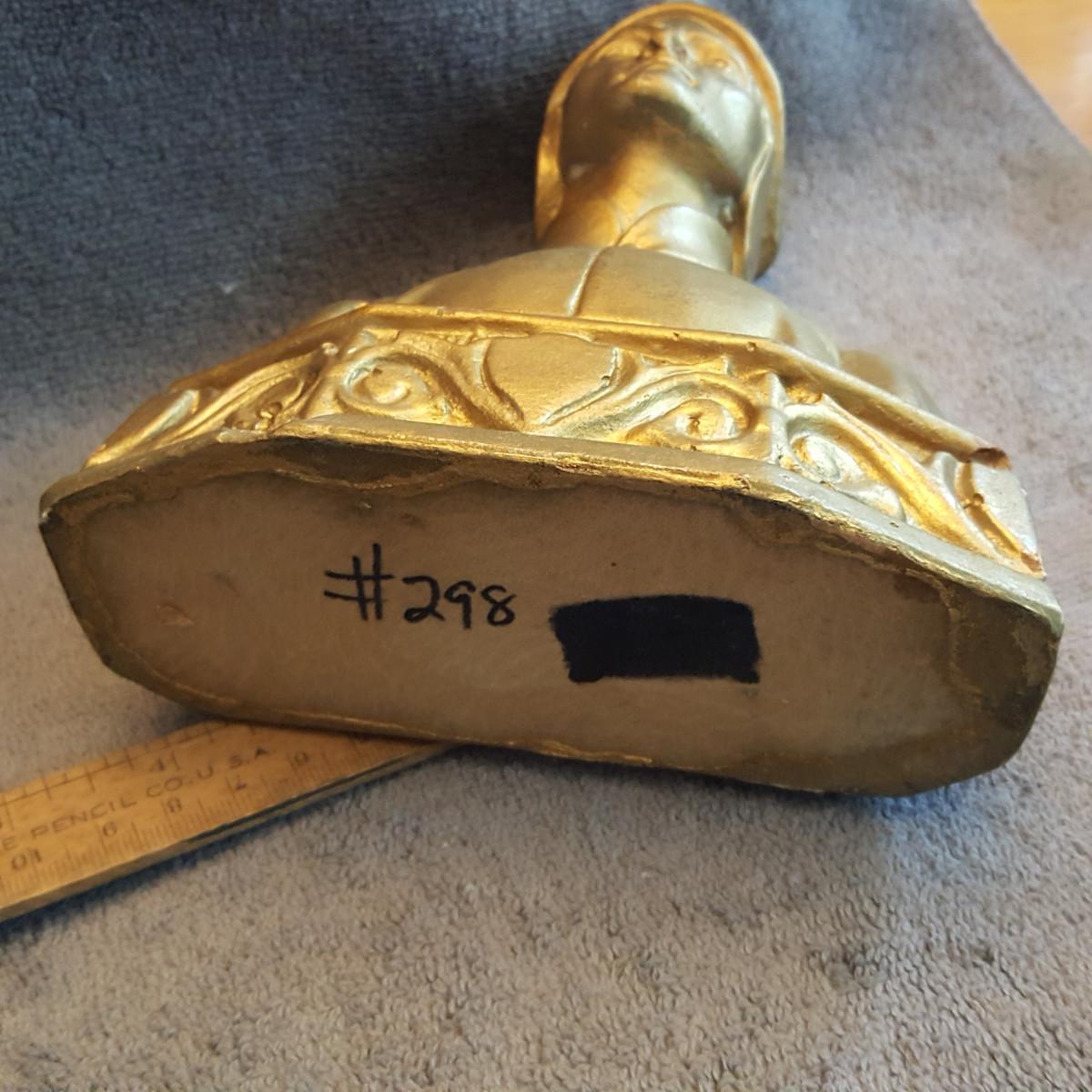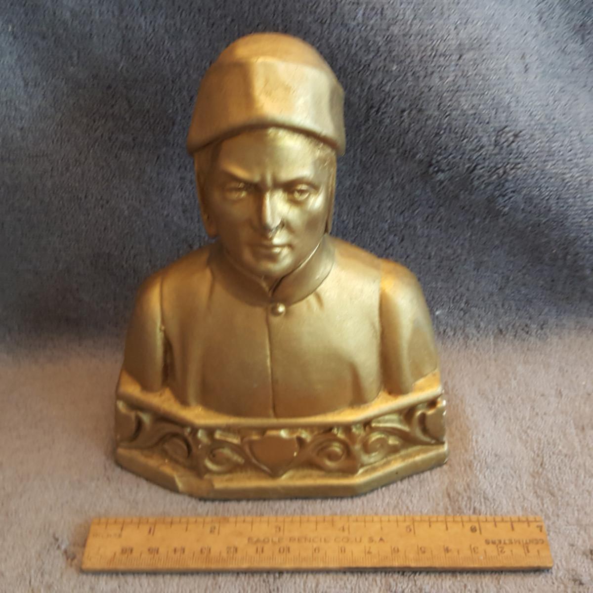 This auction lot is for a Plaster Bust of Medieval Man, This decorative bust is quite showy and would look great on any bookshelf. Minor chip on bottom front that has been painted over. Where you gonna find another to enhance your den, office or family room.