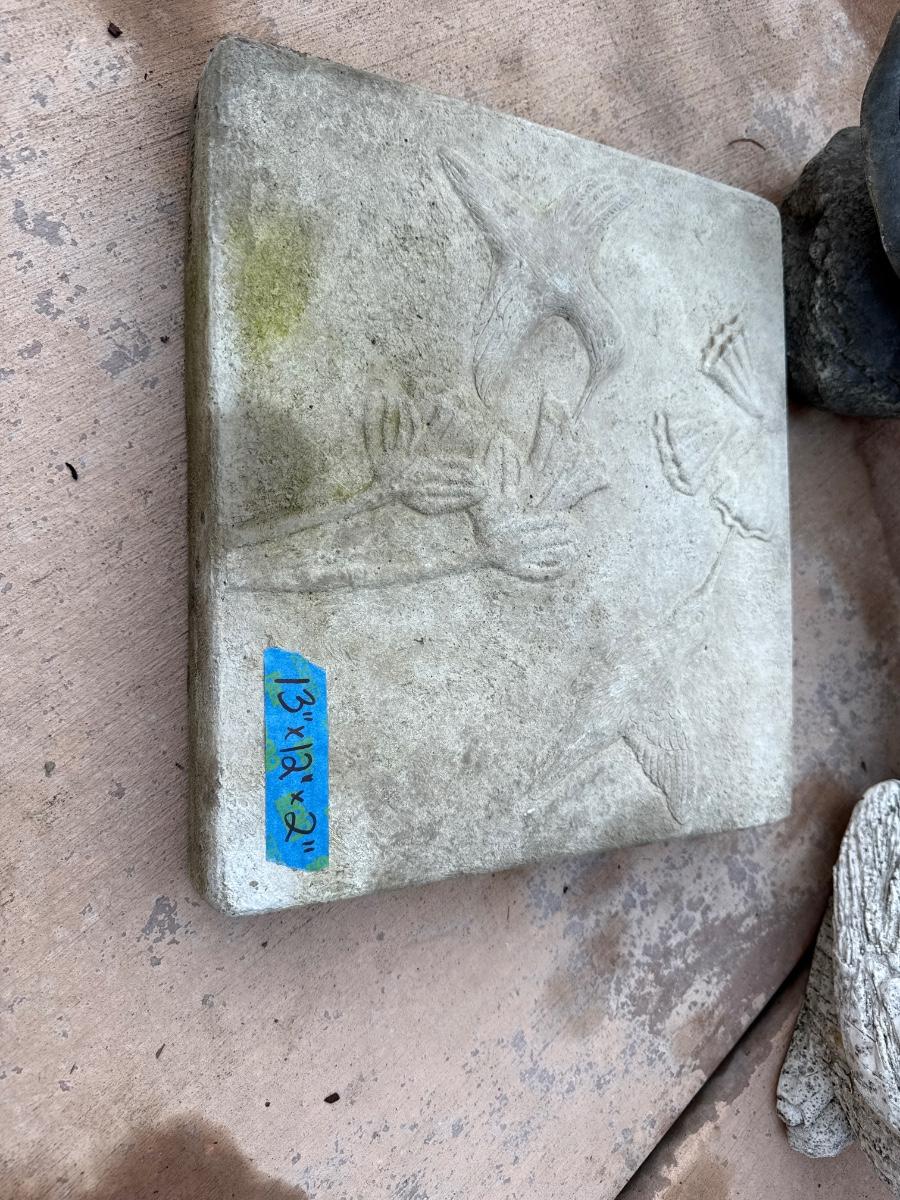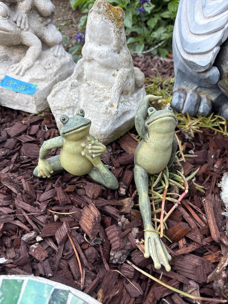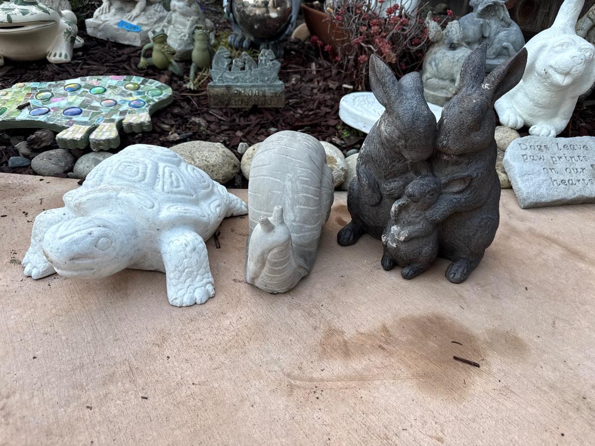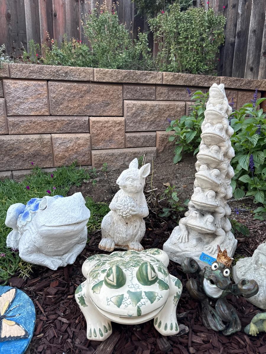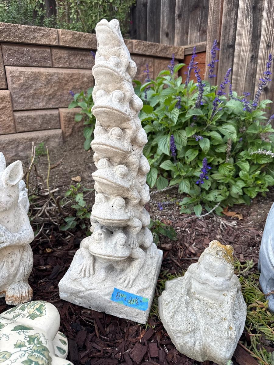 Includes dogs, frogs, rabbits, turtles and stepping stones. Crown on frog is chipped. Please refer to pictures.