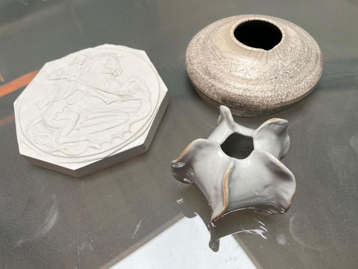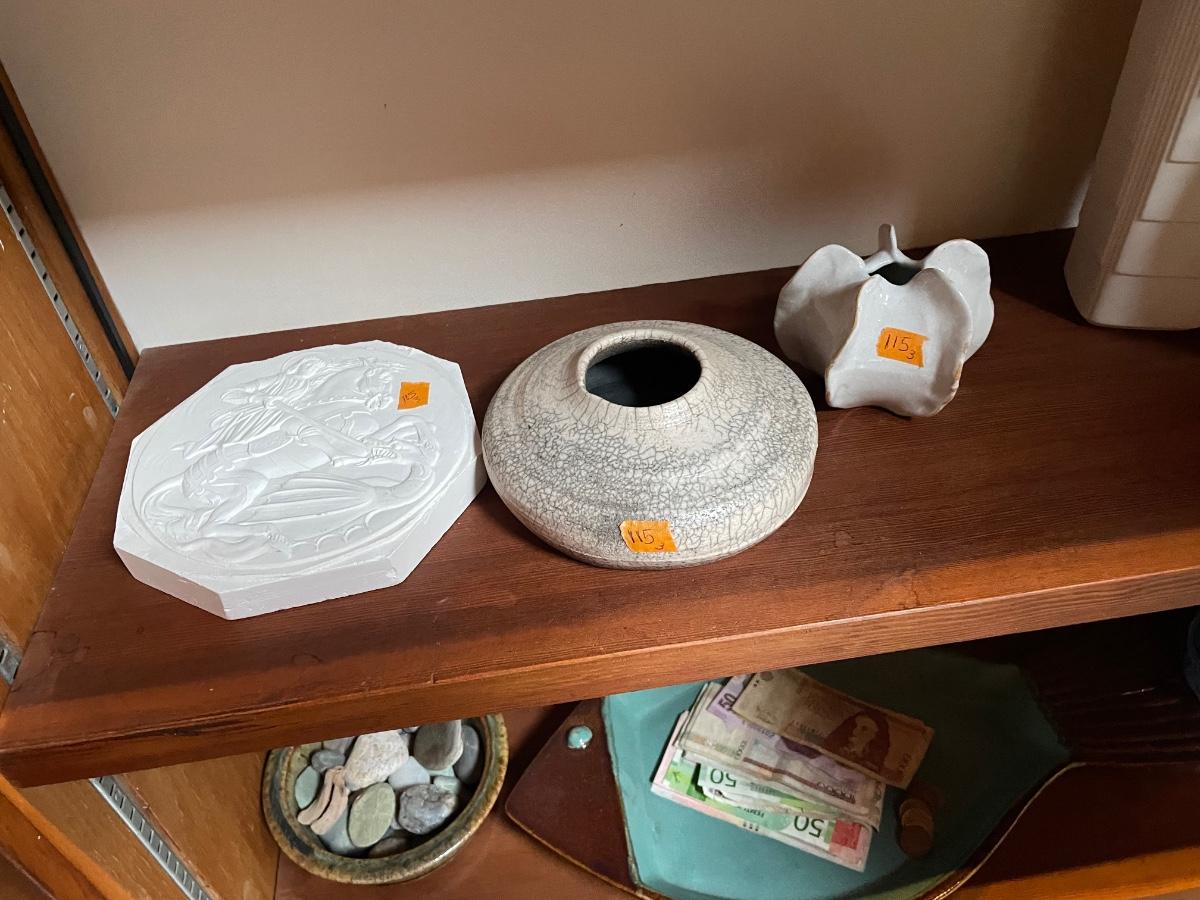 Plaster Plaque, Small Pinched Pottery Vase, Raku Piece