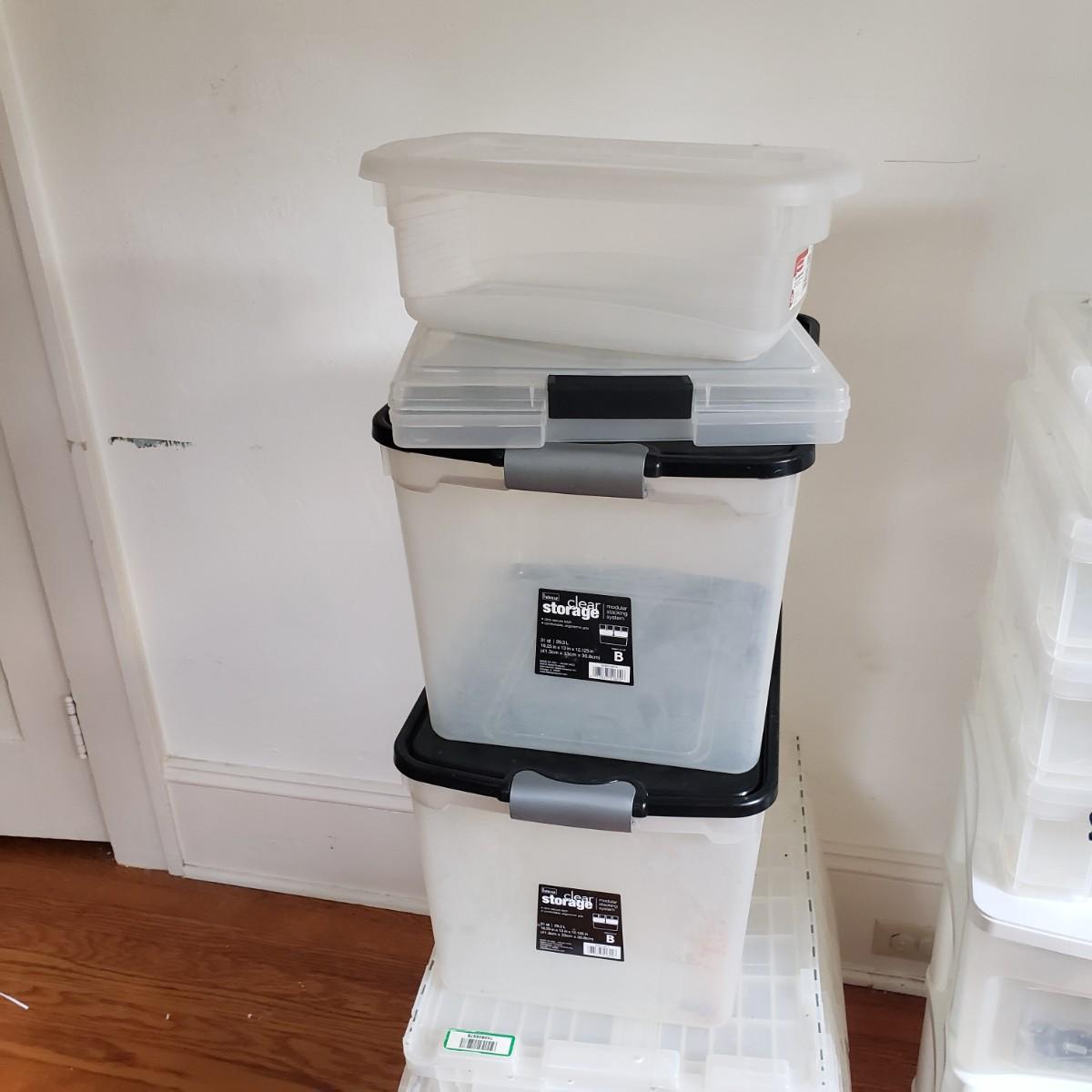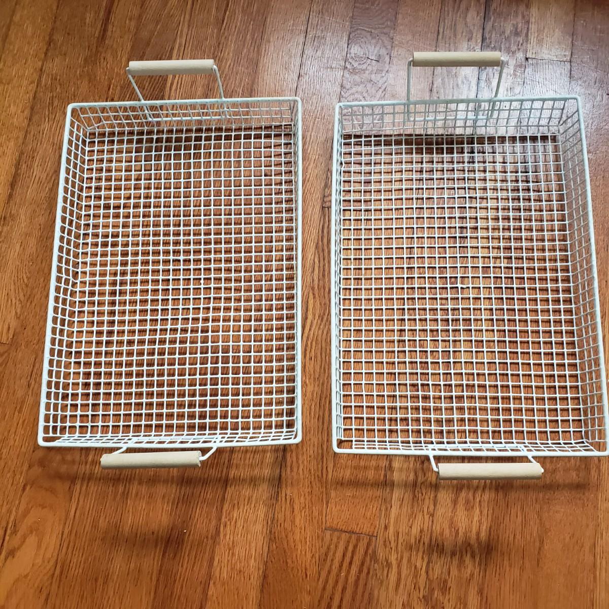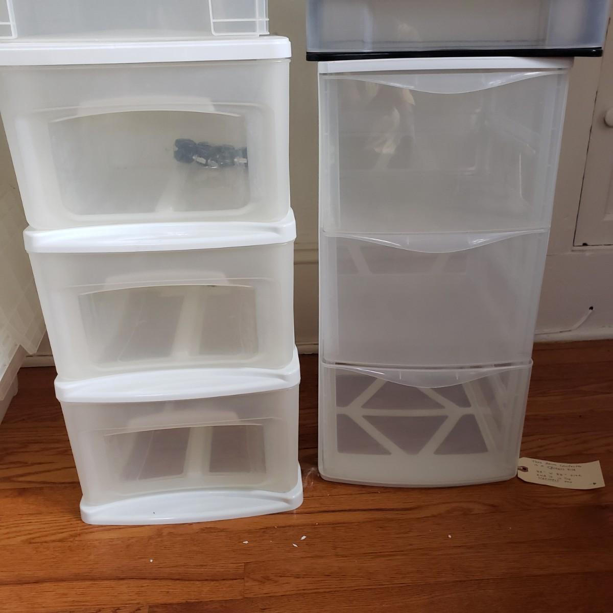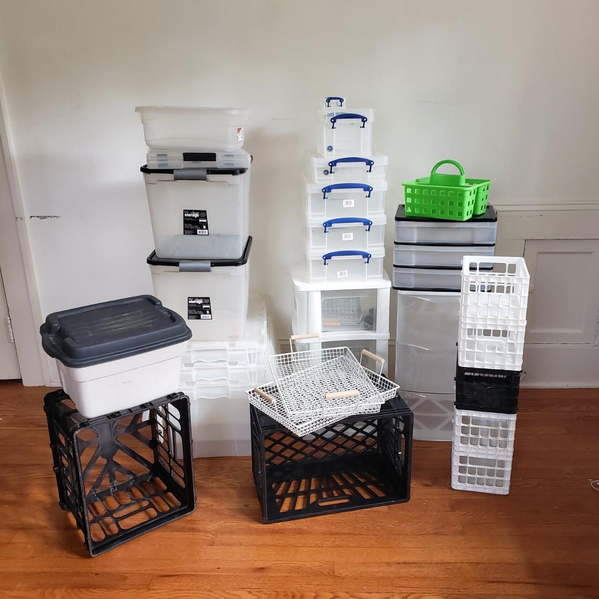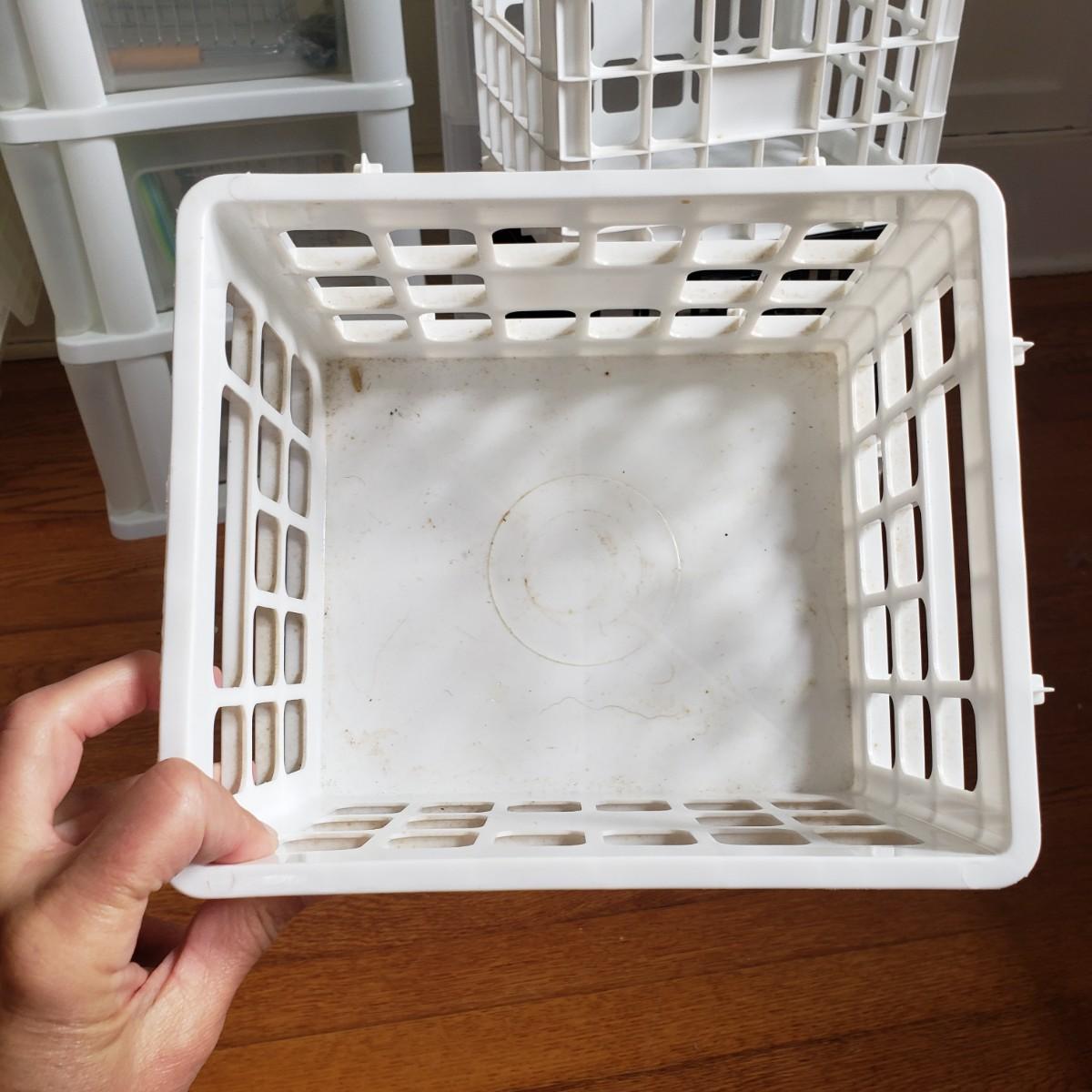 30 pieces of plastic and wire storage bins just in time for your spring cleaning! Every size you need! The white wire tray baskets have wooden handles and measure 17" x 12" x 2"H. There are two-three drawer containers that measure approximately 13" x 14" x 24"H. See pictures for other labels and sizes. They all appear to be in working condition, yet could use a cleaning.