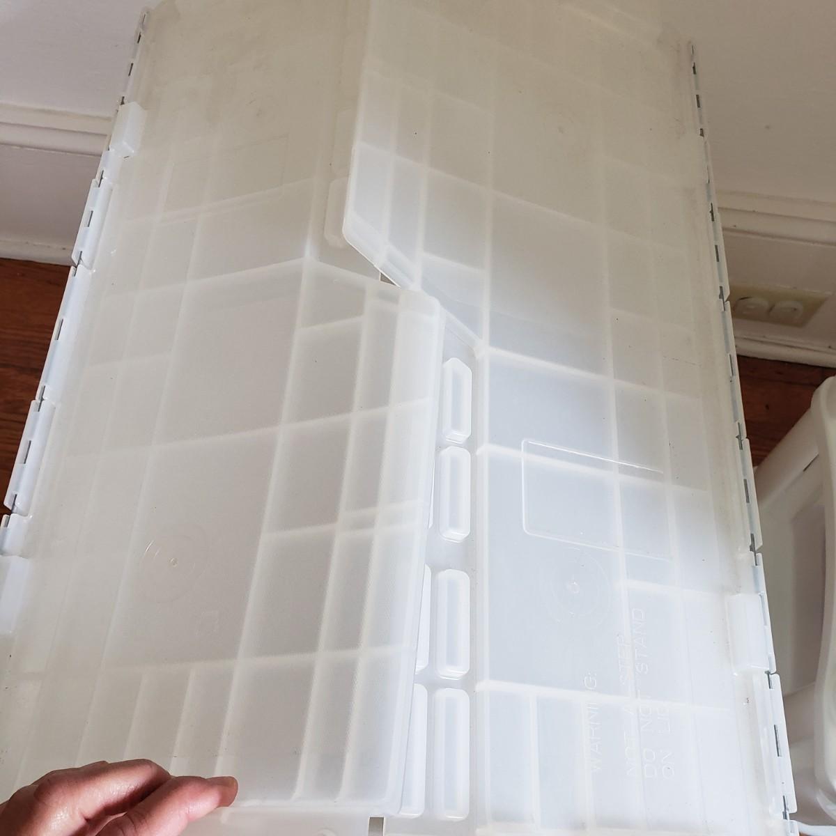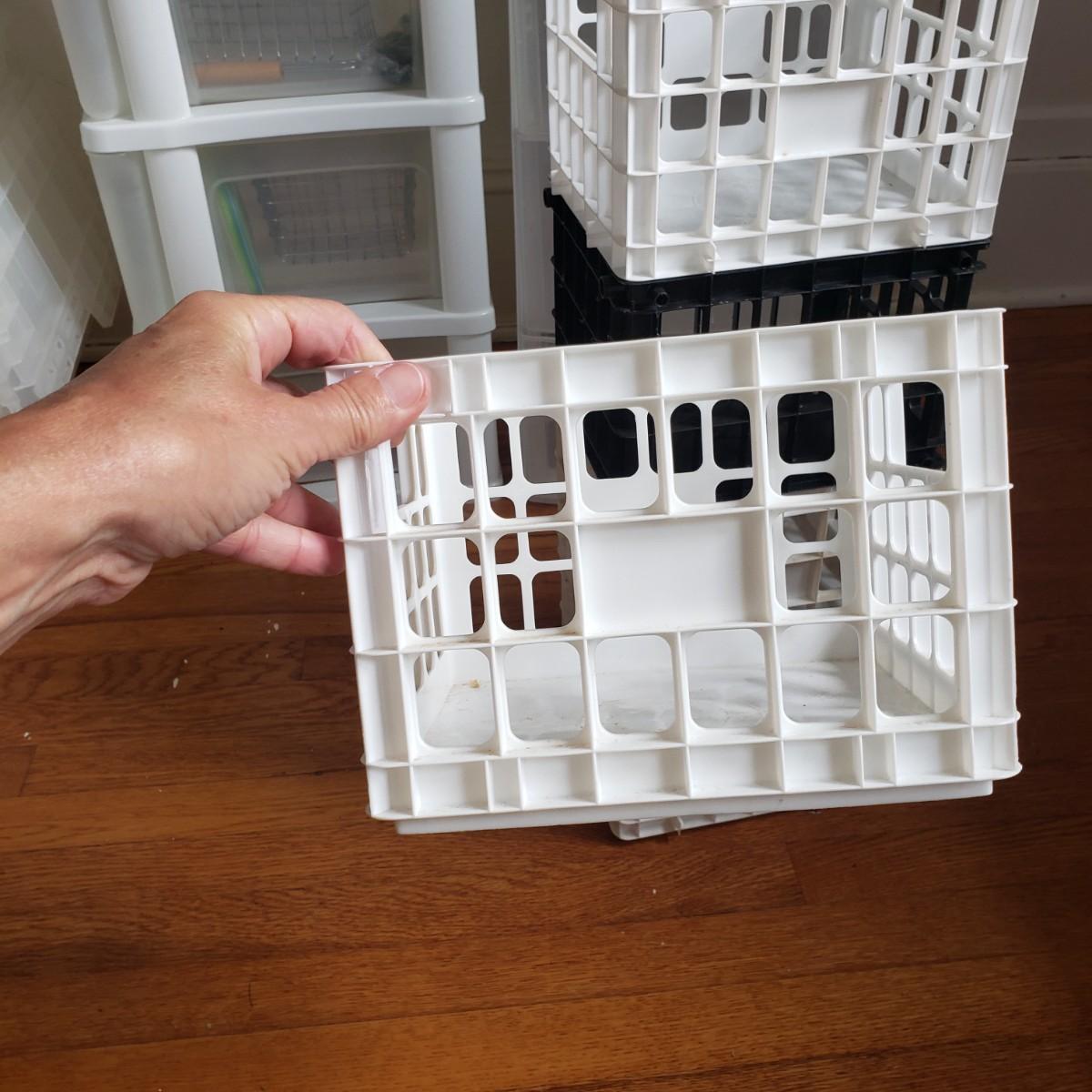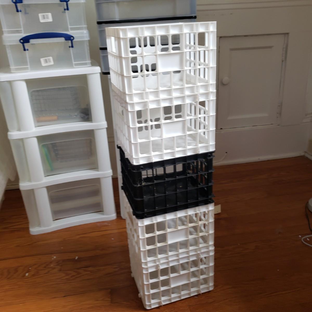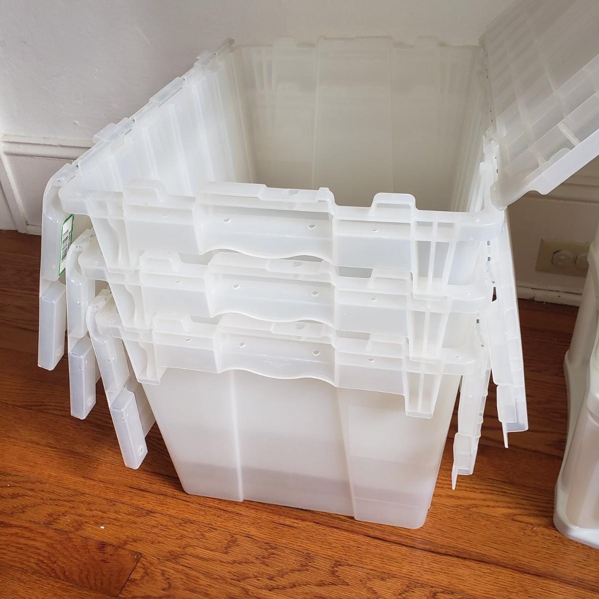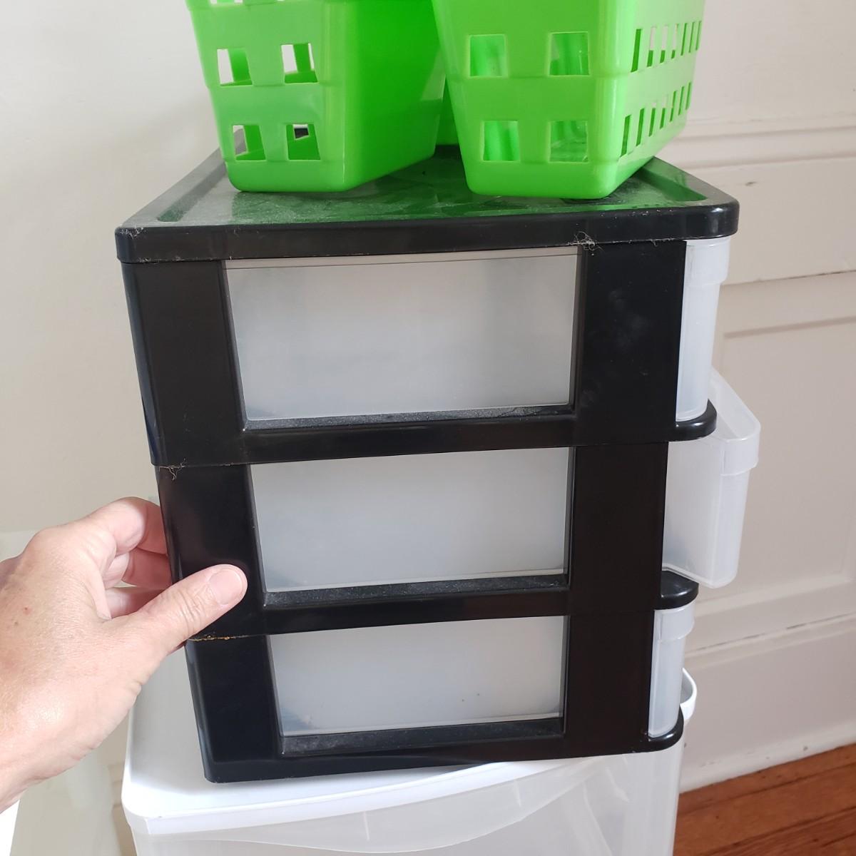 30 pieces of plastic and wire storage bins just in time for your spring cleaning! Every size you need! The white wire tray baskets have wooden handles and measure 17" x 12" x 2"H. There are two-three drawer containers that measure approximately 13" x 14" x 24"H. See pictures for other labels and sizes. They all appear to be in working condition, yet could use a cleaning.