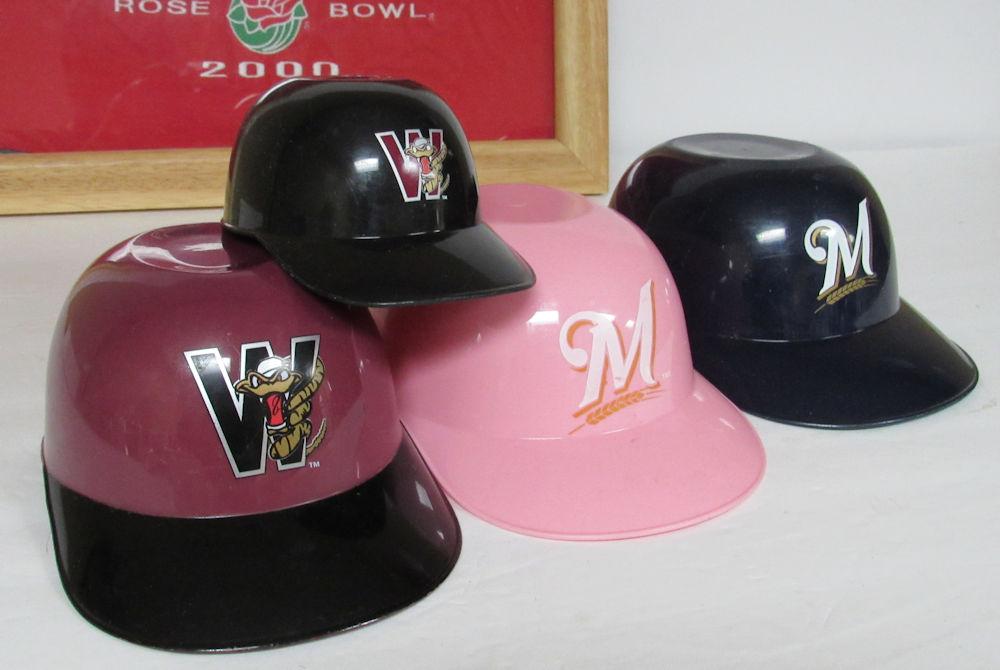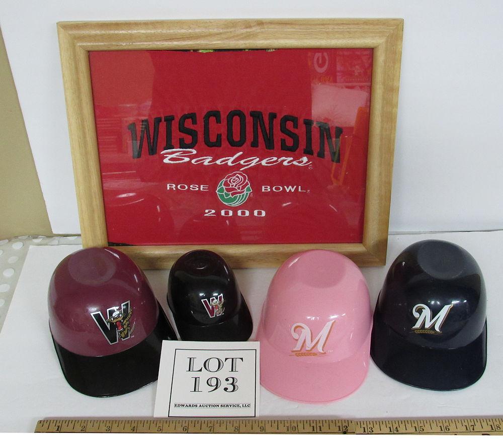 Plastic Baseball Caps, Timber Rattlers, Milwaukee Brewers, UWM Framed T-shirt Section From Rose Bowl