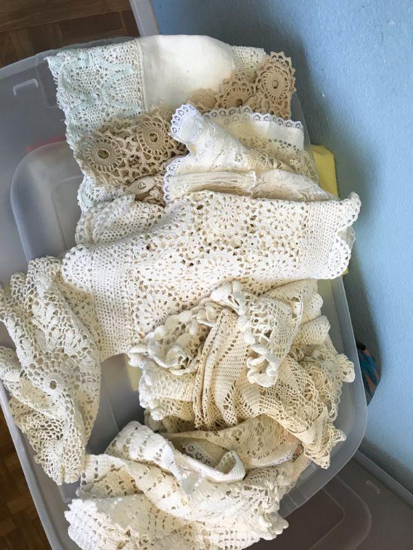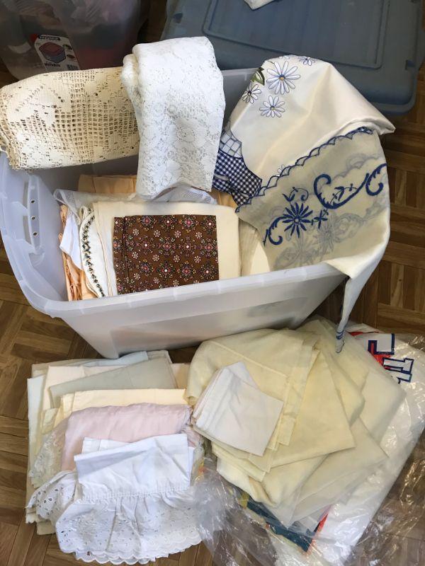 Plastic bin filled with lacy curtains, table runners, table cloths (149)