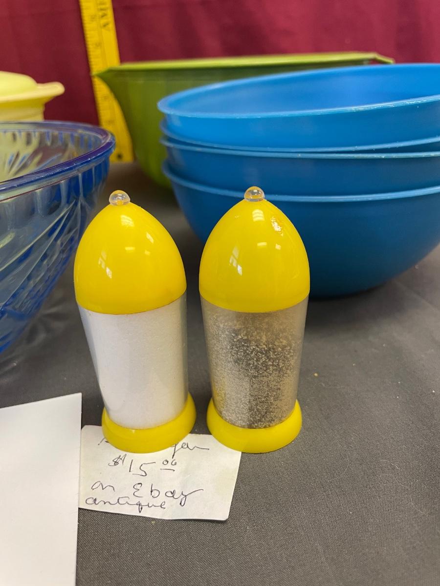 Retro futuristic yellow clear plastic rocket shape salt and pepper