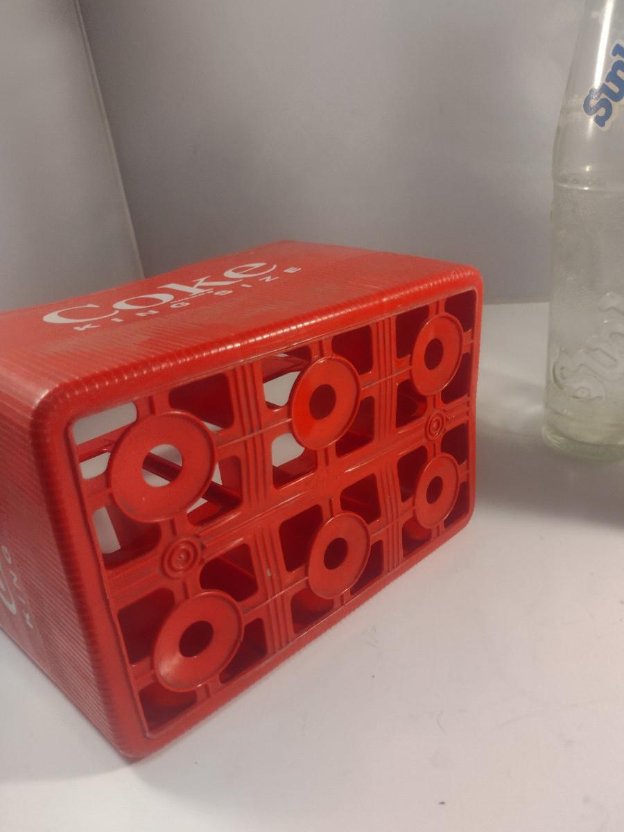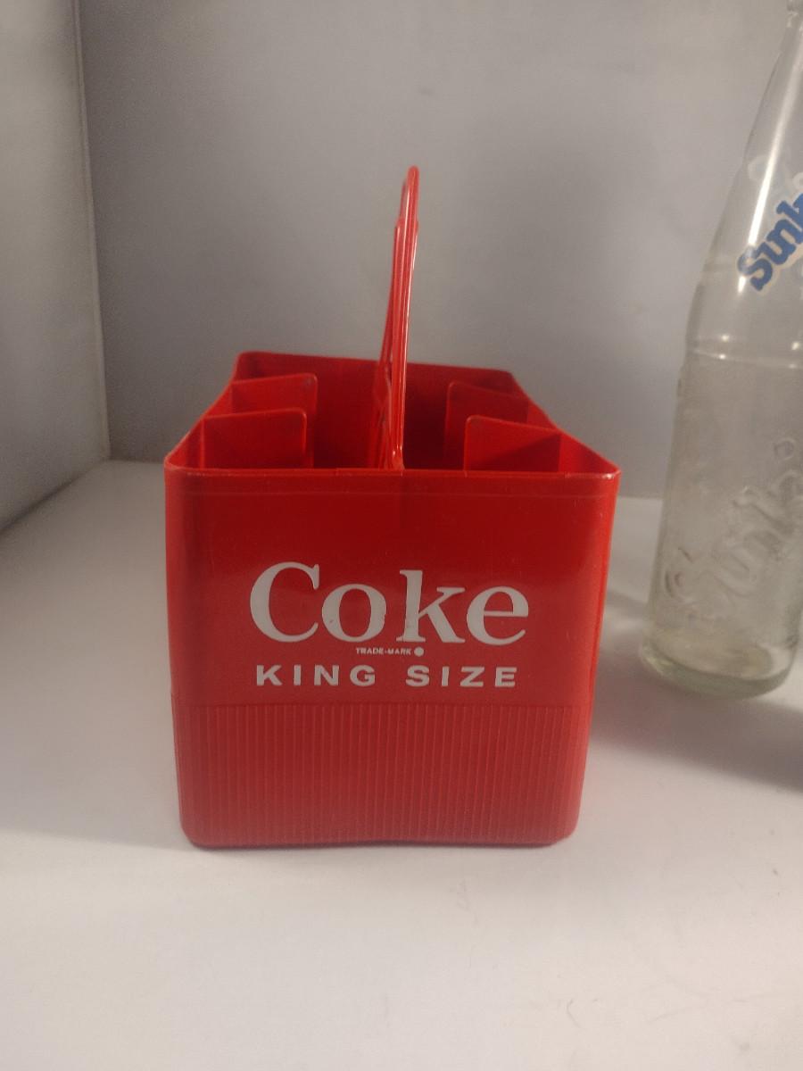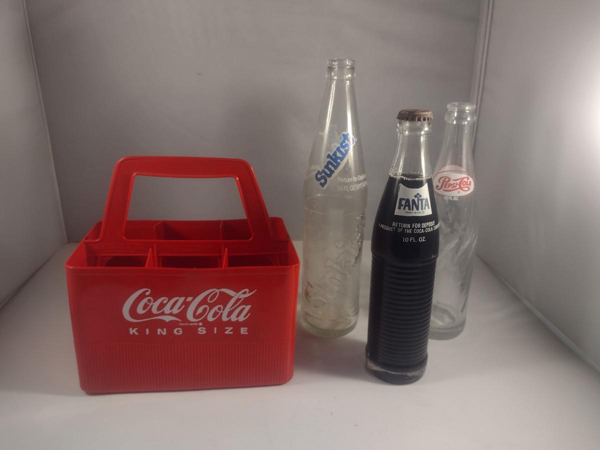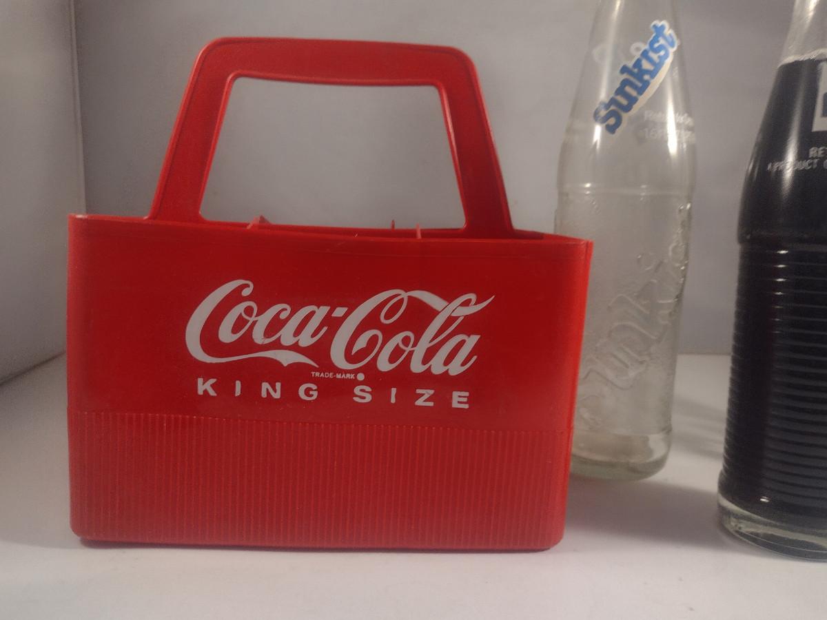 Plastic Coca-Cola Carrier and Assorted Bottles