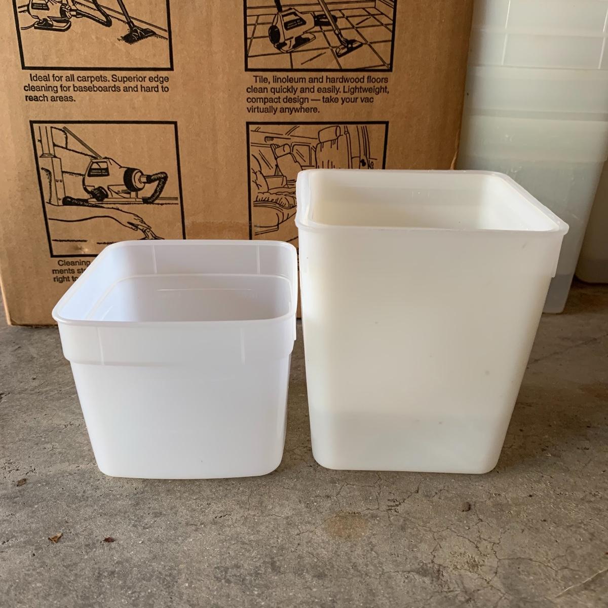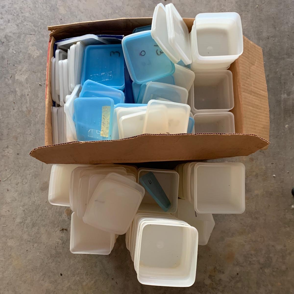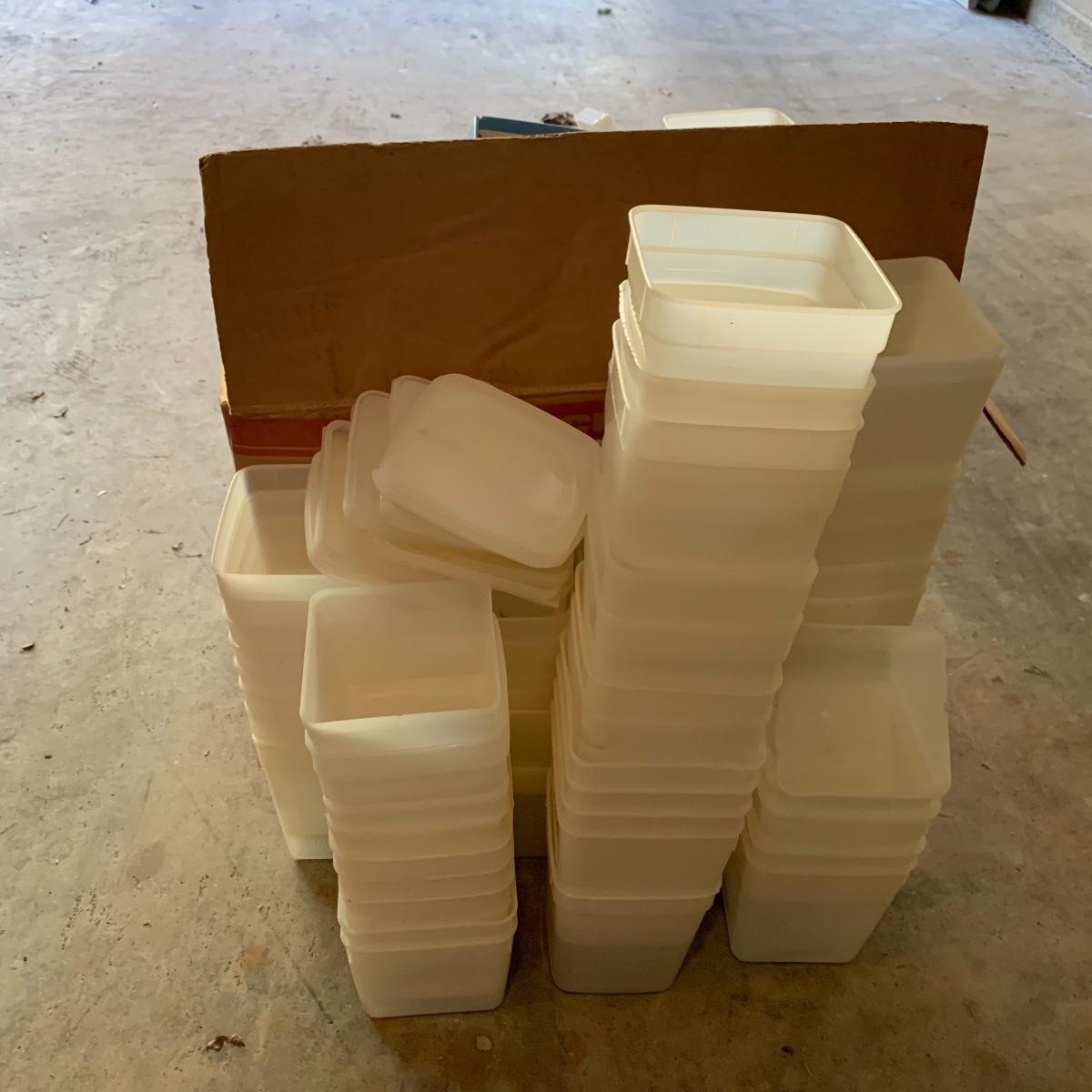 This lot includes many cube shaped plastic containers with lids. Lids do fit but we cannot say there is a lid for every container. The containers come in a smaller size and a larger size. Local pickup only.