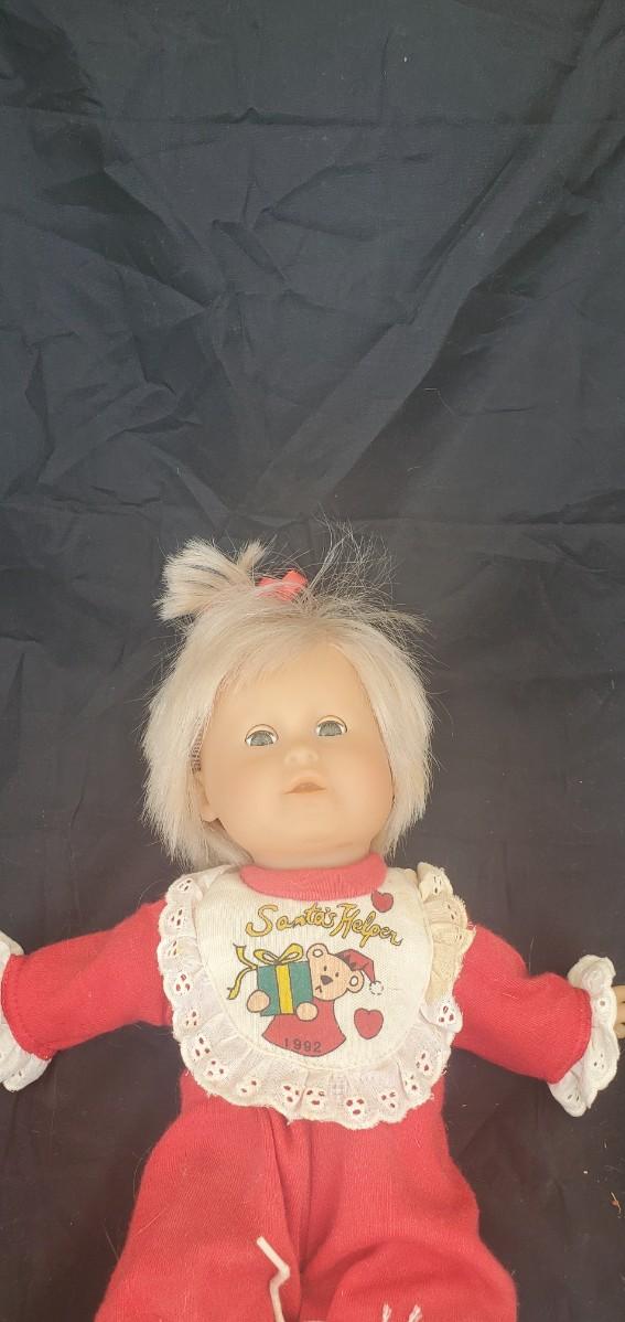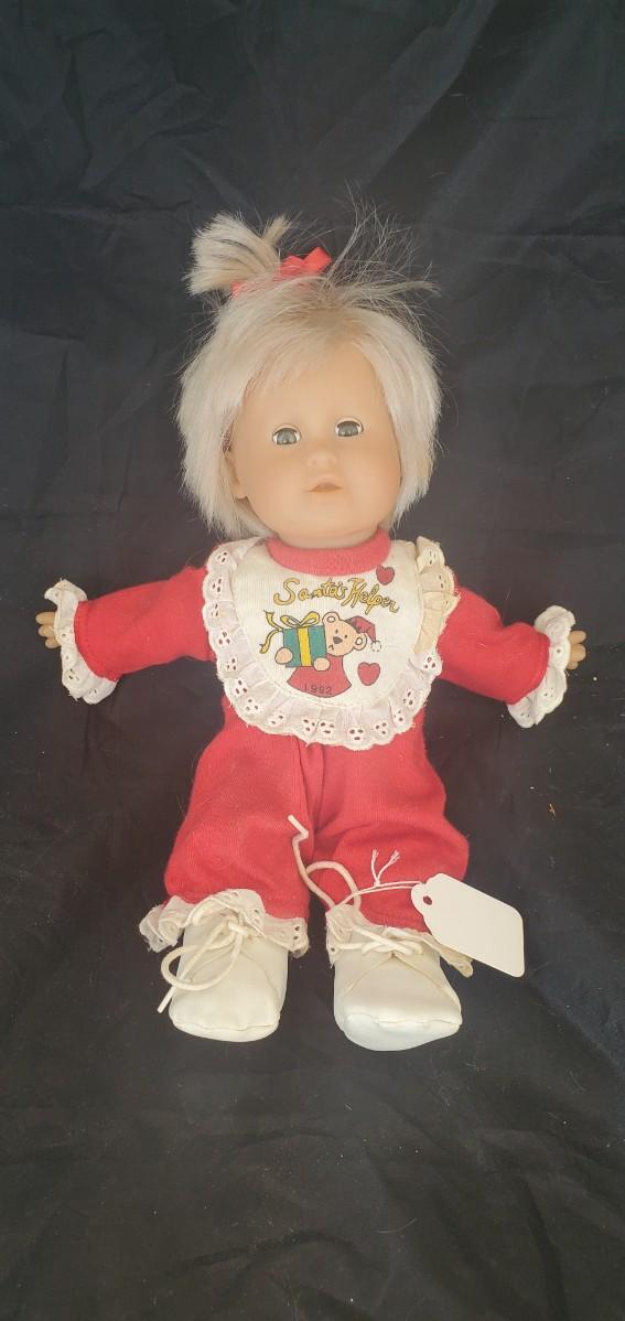 Plastic doll in a red suit.