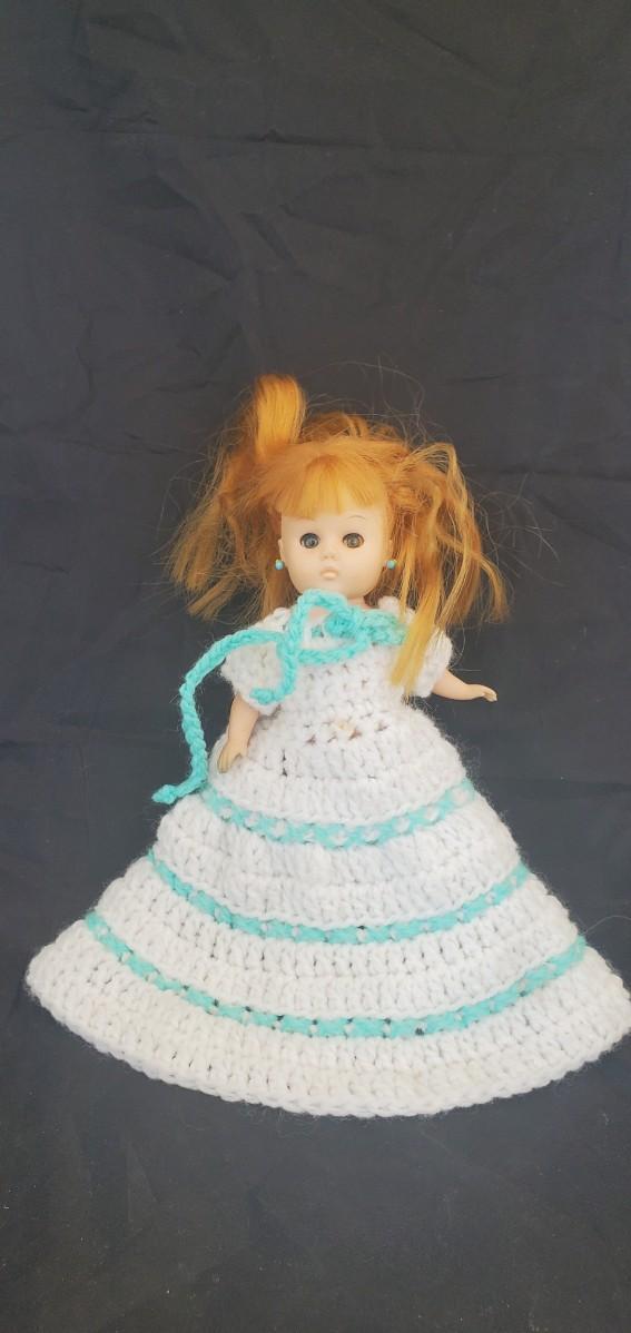 Plastic doll in a white and blue dress.