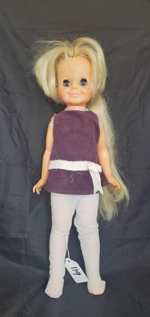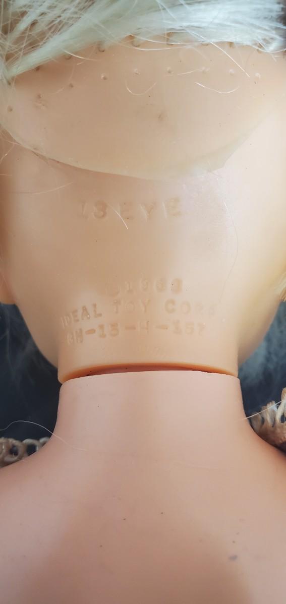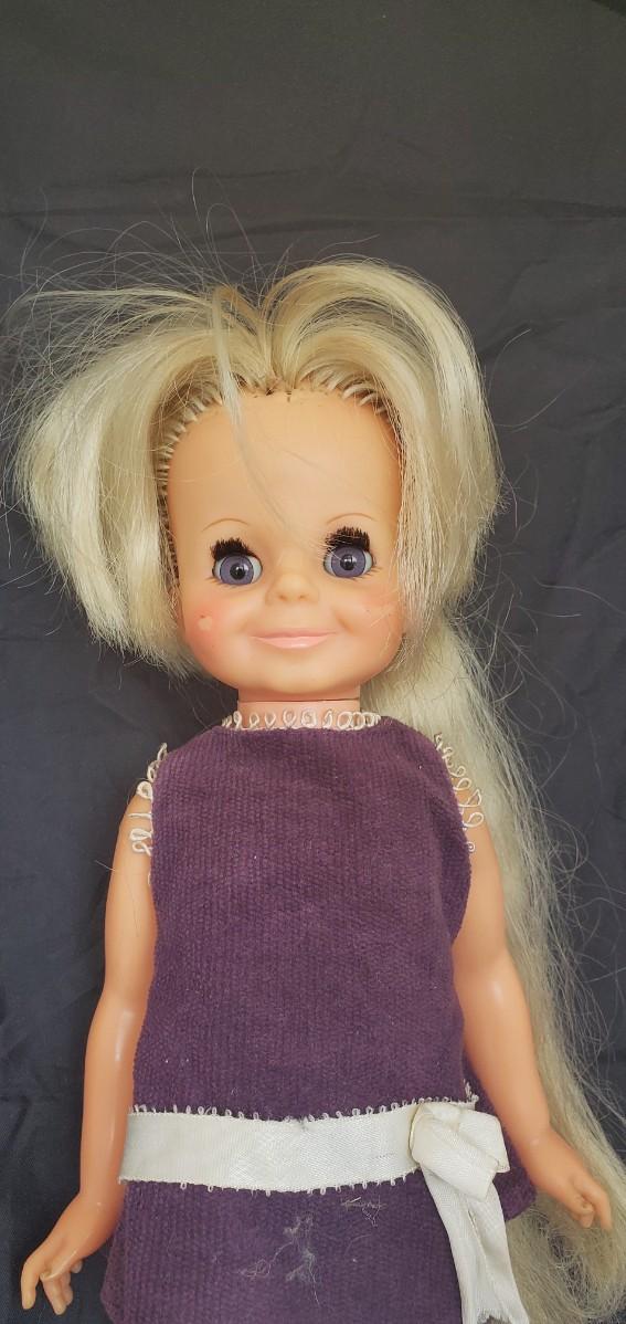 Plastic doll in a purple shirt and white pants. 1969 IDEAL TOY CORP.