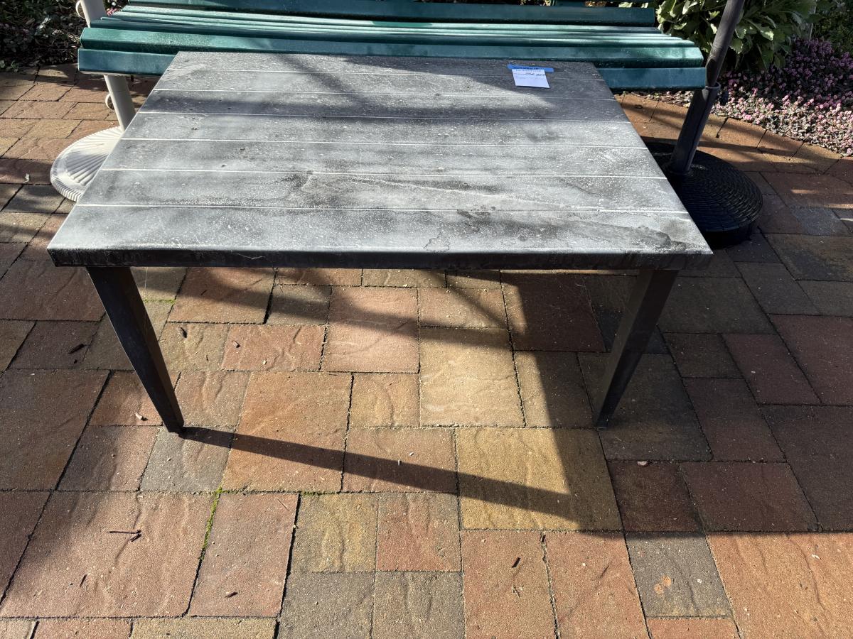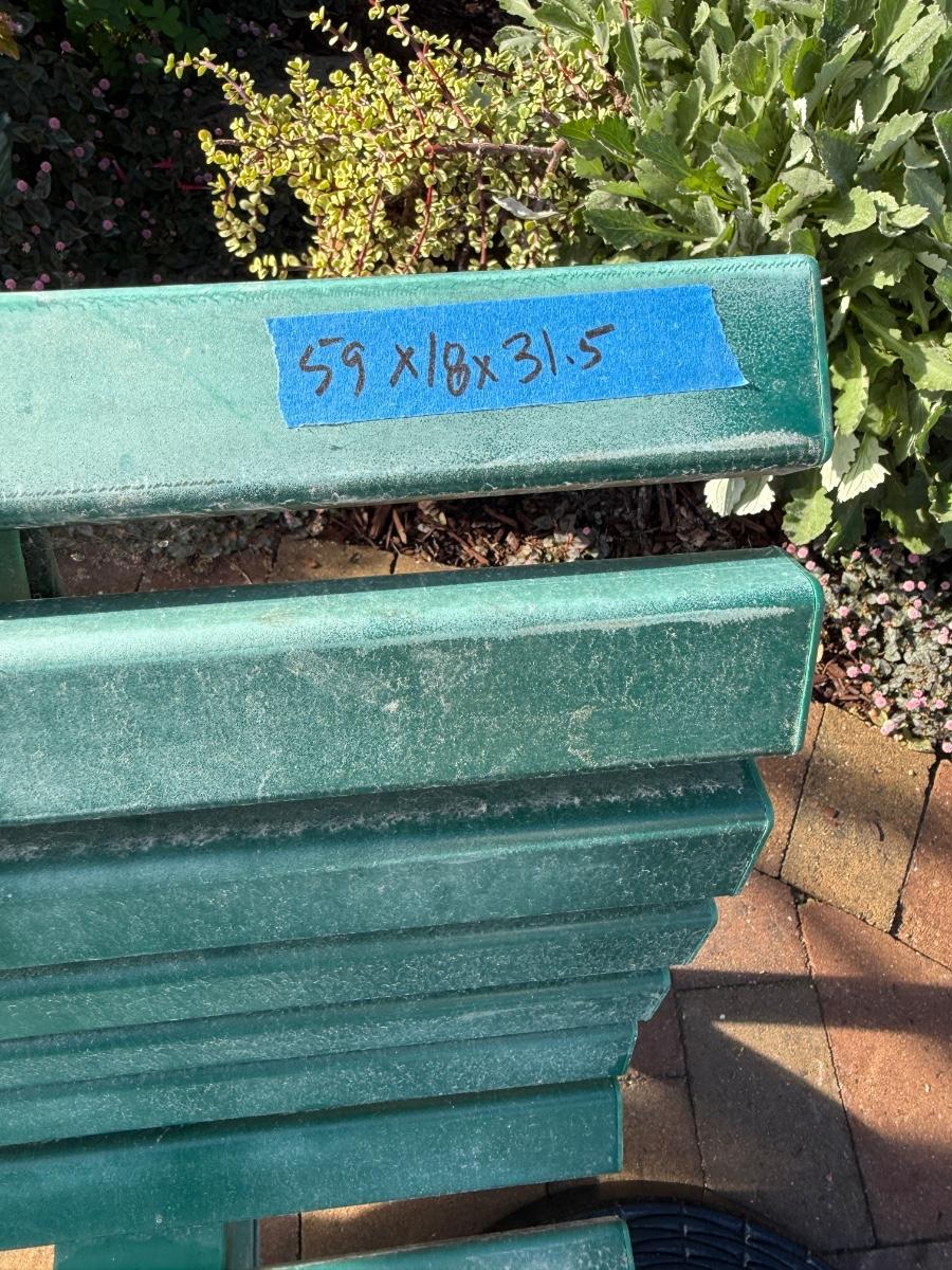 Plastic green bench 59x18x31.5, metal table 36x28x18 and 2 patio umbrellas