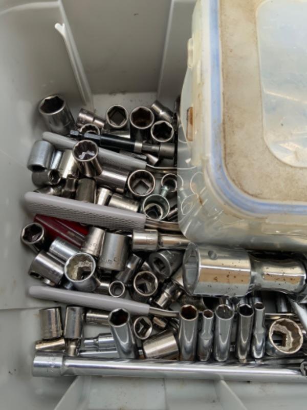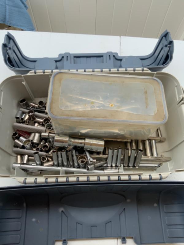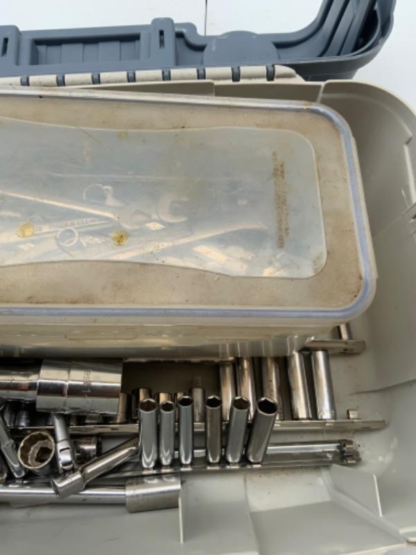 Plastic heavy duty toolbox full of assorted wrenches and sockets Lot 2590