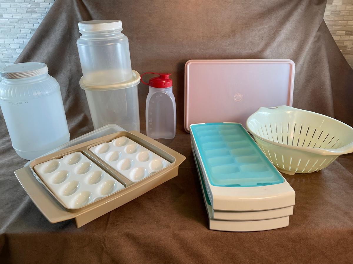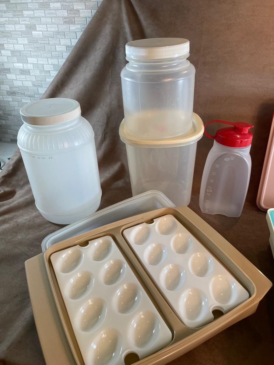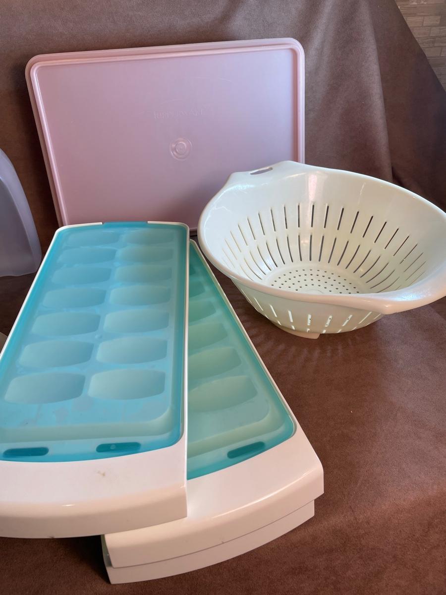 includes three ice cube trays with covers, 2 plastic jars, 1 measured liquid storage container. Tupperware deviled egg carrier, Tupperware rectangle container, collander