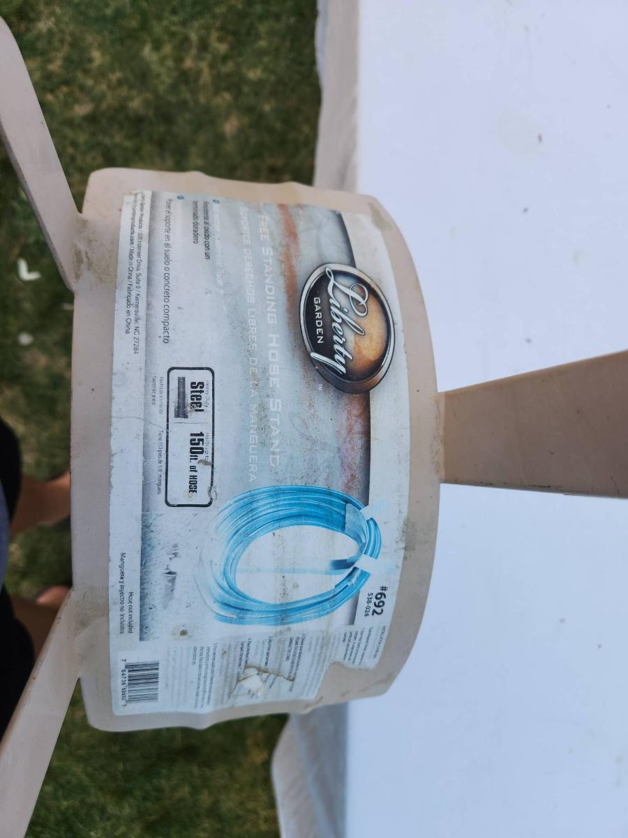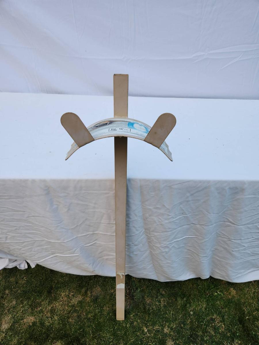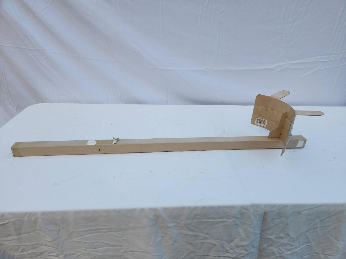 Plastic lawn edging installation tool designed for securing lawn borders. Features a wooden handle and a plastic attachment for aligning and situating lawn edging materials. Label indicates compatibility with specific plastic lawn edging products. Appears suitable for use in landscaping or gardening projects.