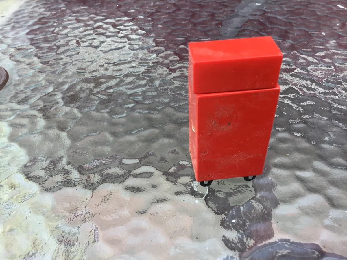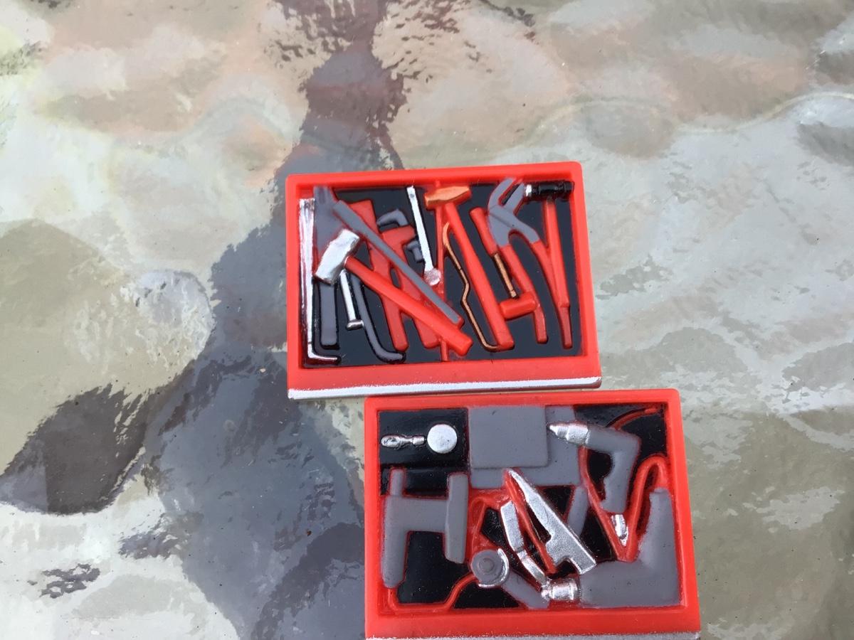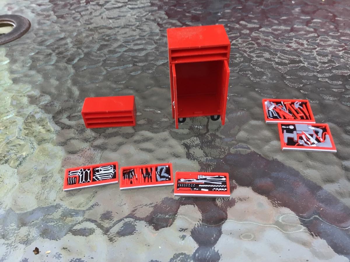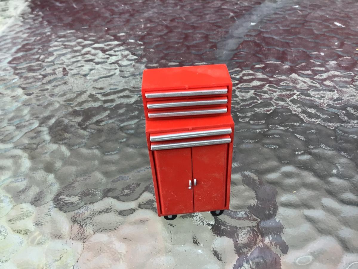 This is a great plastic mini toy tool box. The drawers pull out and are detailed with tools. No name on it but it is small.