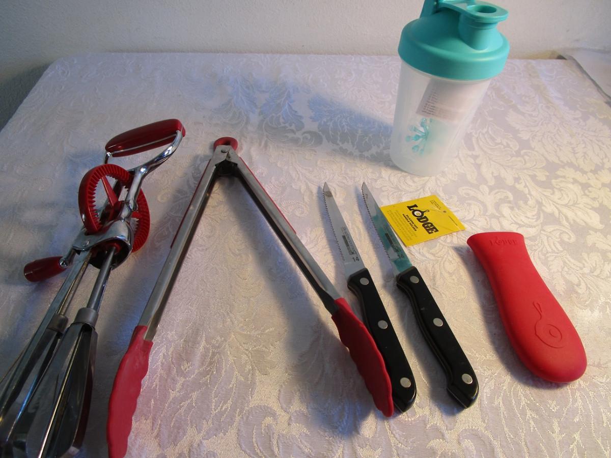 Plastic mixer cup, hand egg beater, tongs, silicone pot handle holder, 2 steak knives