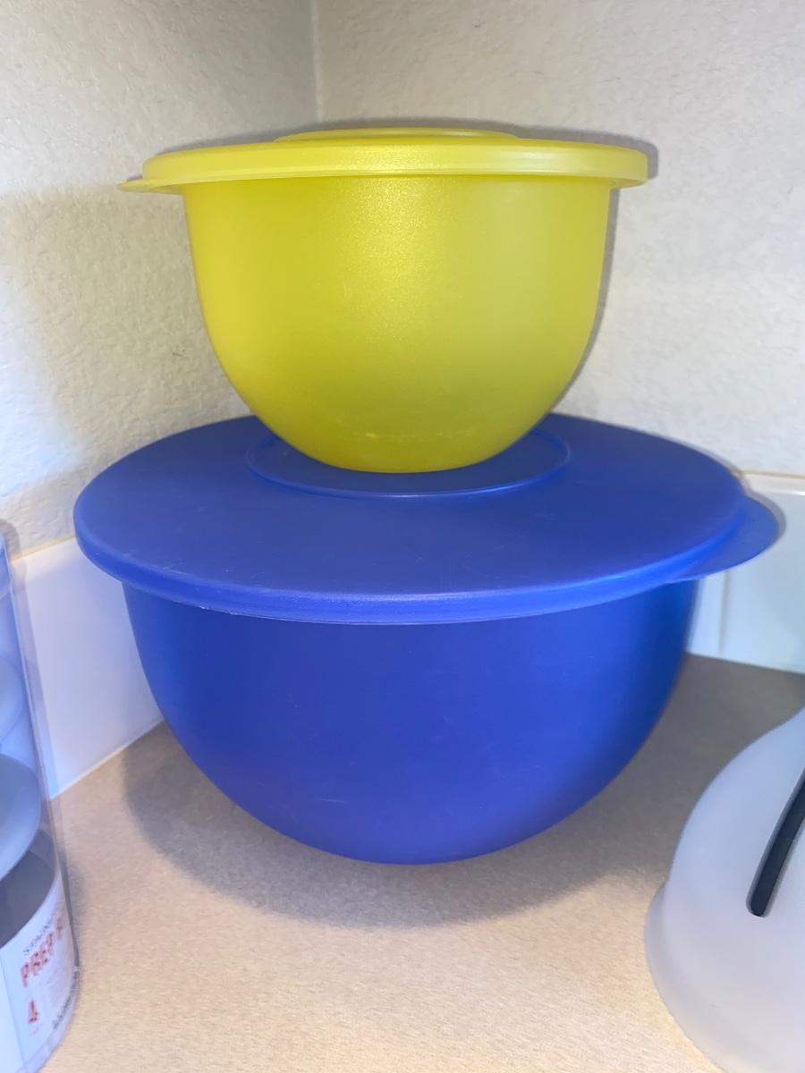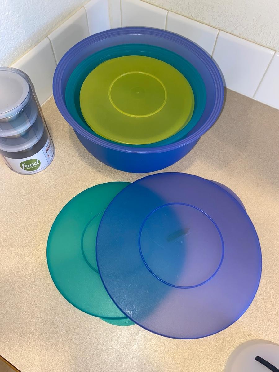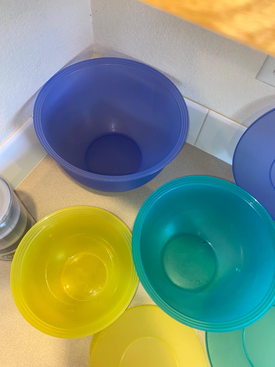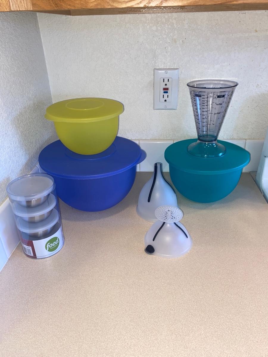PLASTIC NESTING BOWLS WITH LIDS, MEASURING CUP, FUNNELS AND MINI MIXING BOWLS