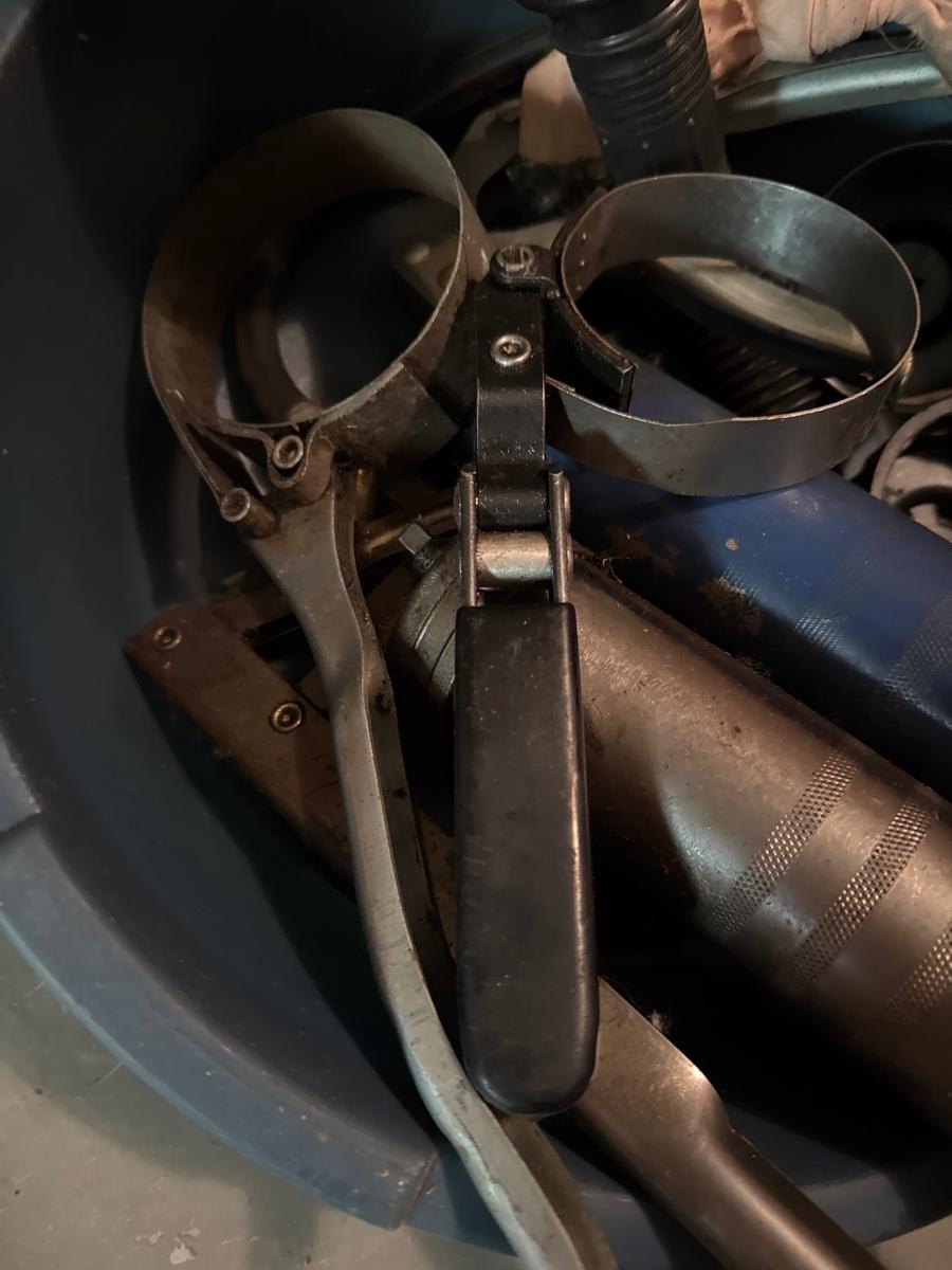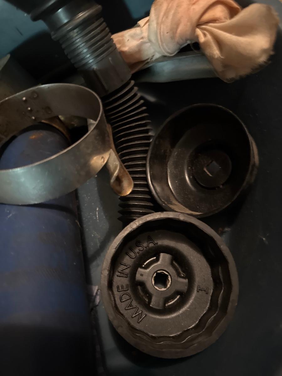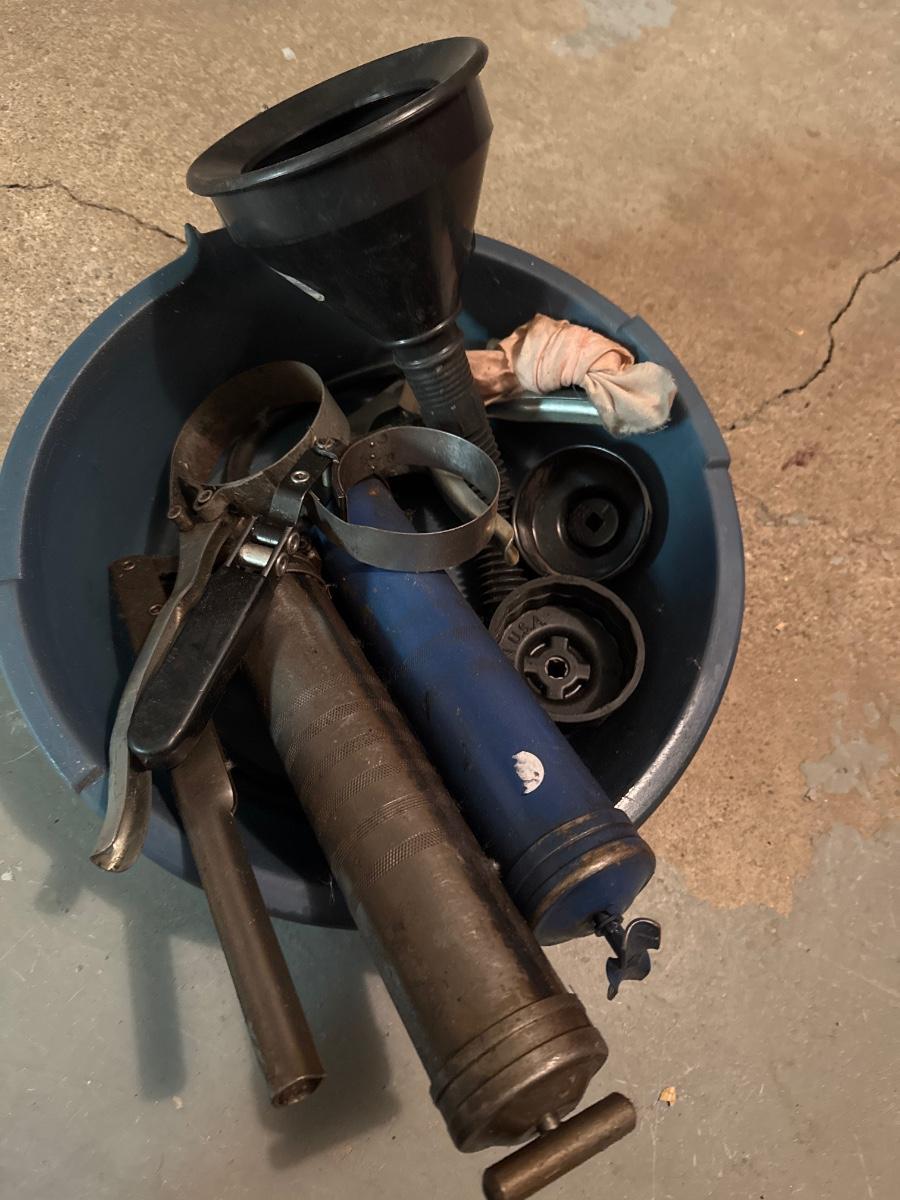 Plastic oil pan, two grease guns, two oil filter wrenches and a funnel