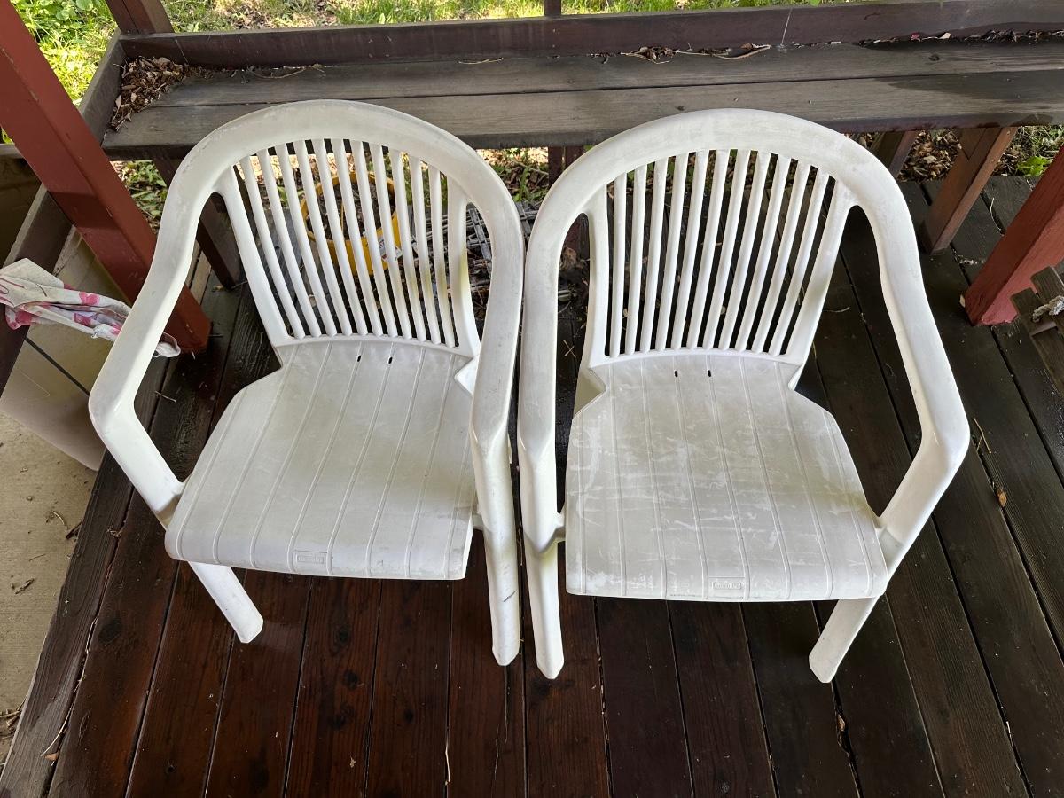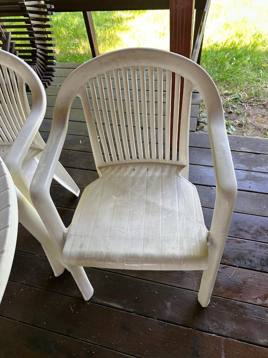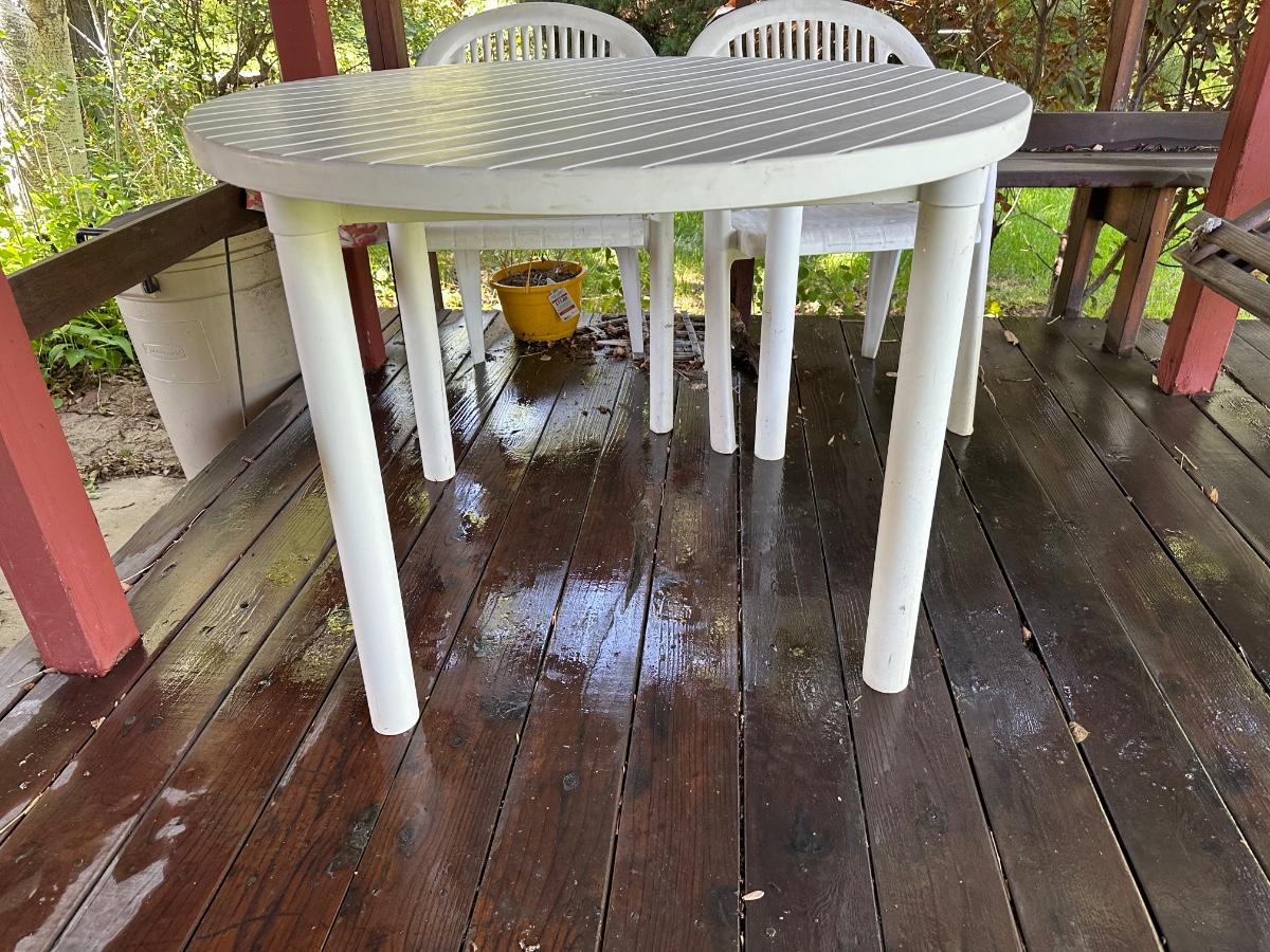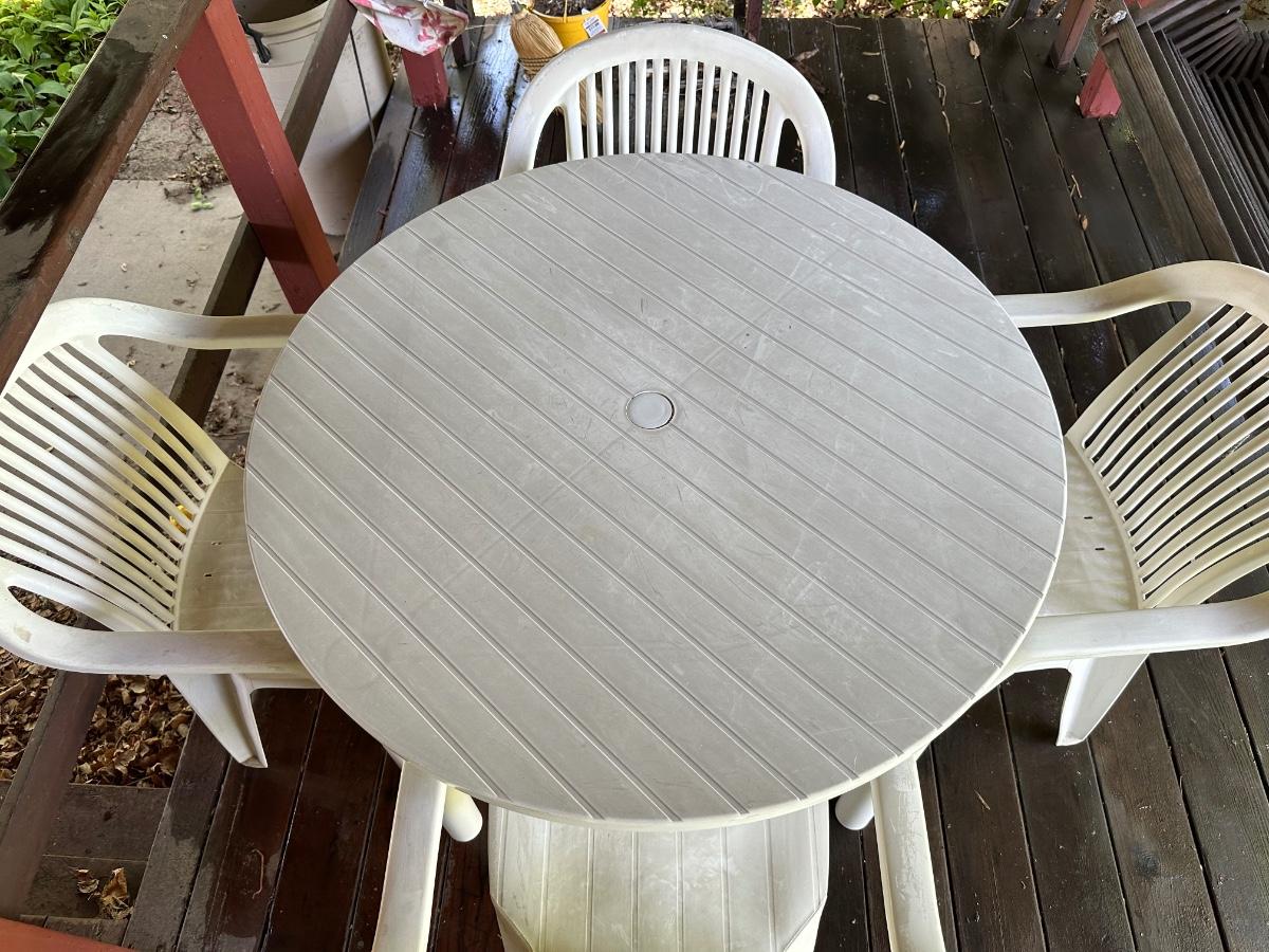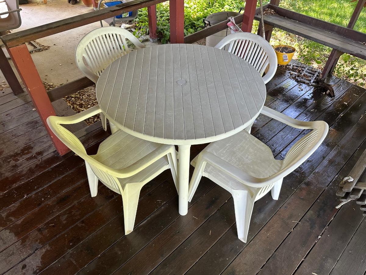 PLASTIC PATIO TABLE AND 4 CHAIRS