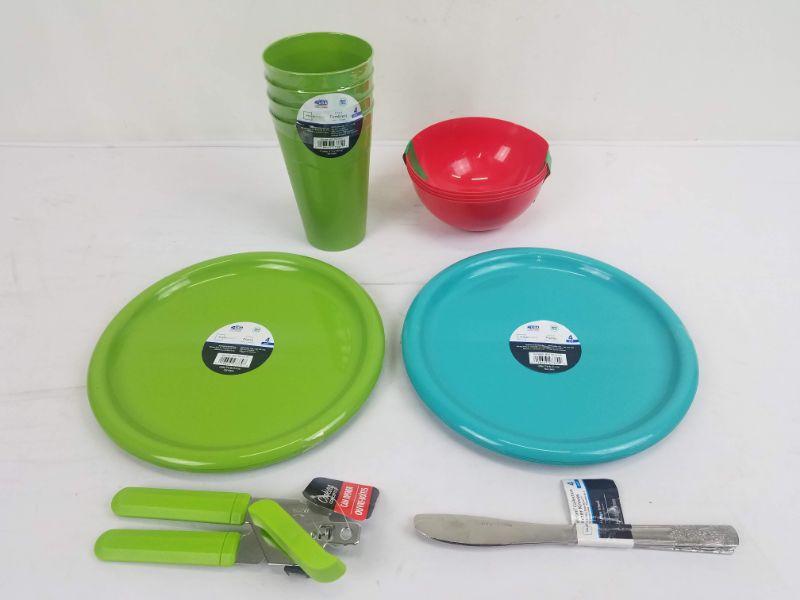 Plastic Plates/Bowls/Cups. Can Opener, Butter Knives - New