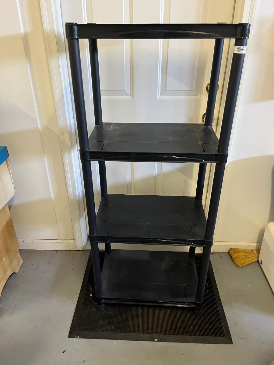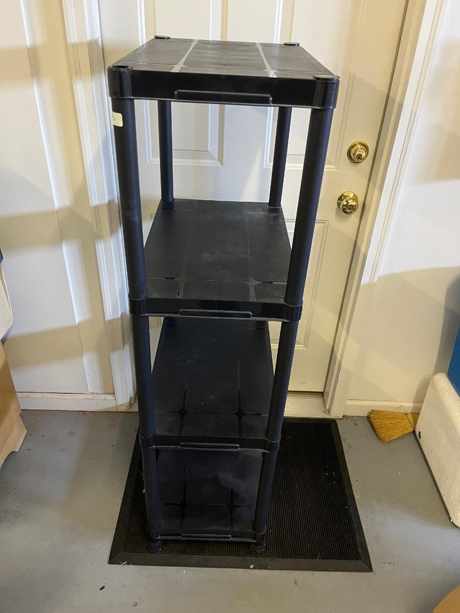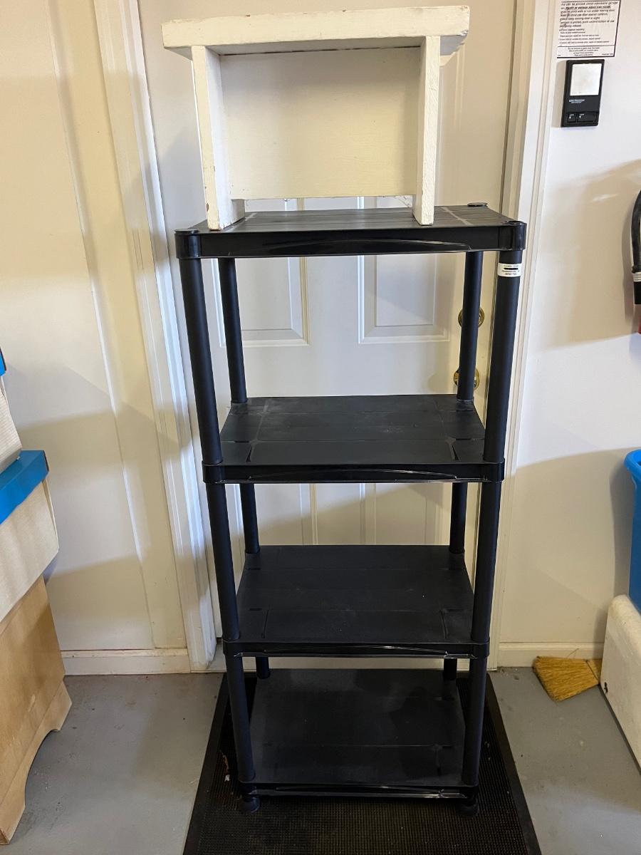 Lot includes a plastic shelving unit that measures 21” x 14” x 52”H. Also includes wooden footstool.