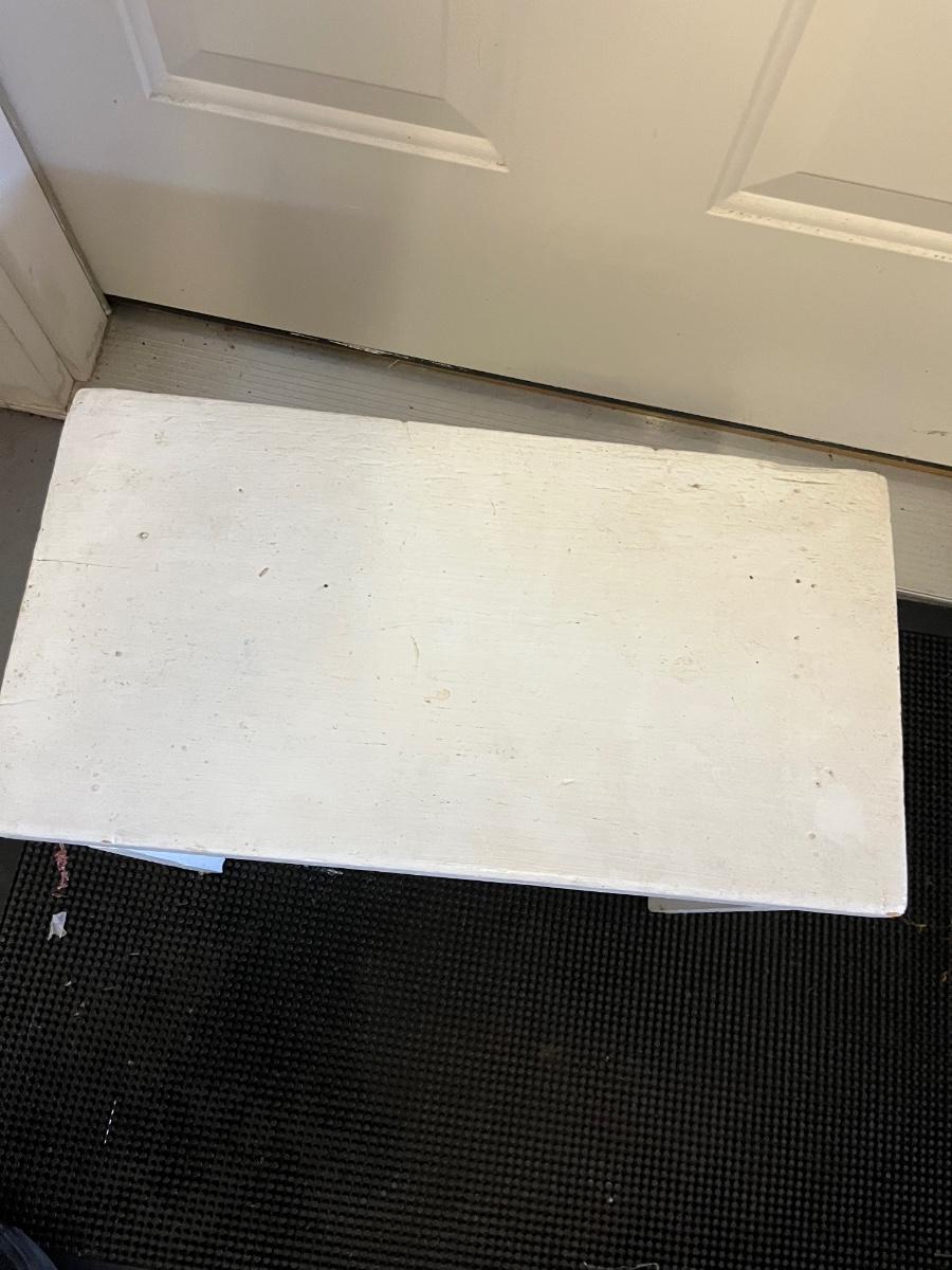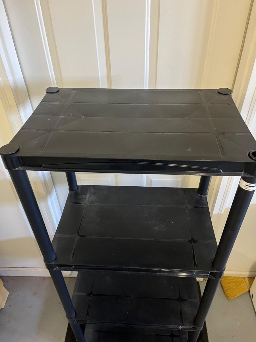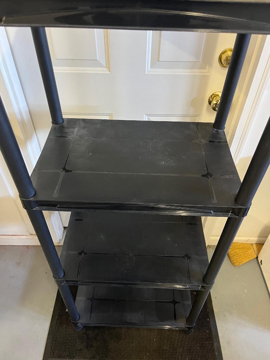 Lot includes a plastic shelving unit that measures 21” x 14” x 52”H. Also includes wooden footstool.