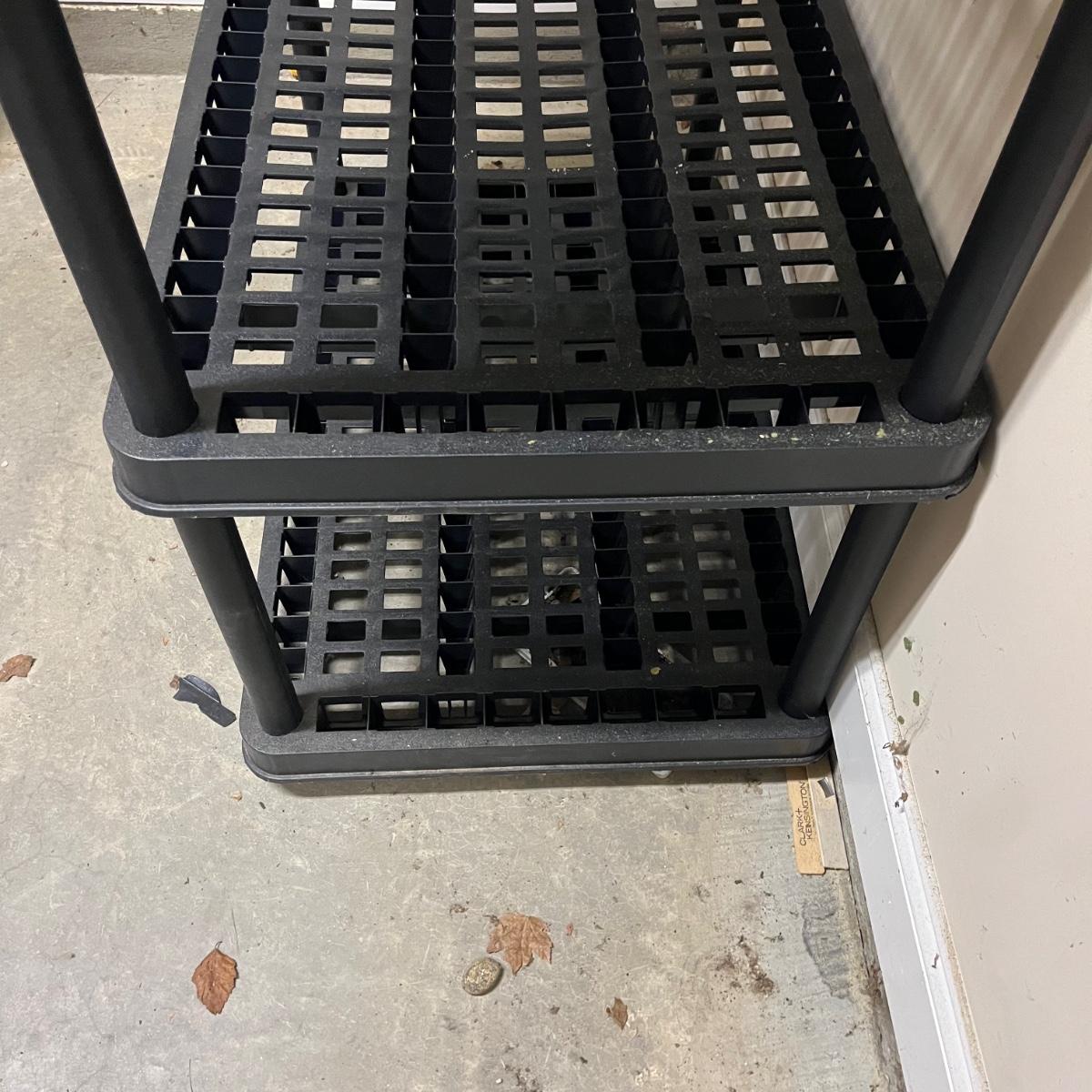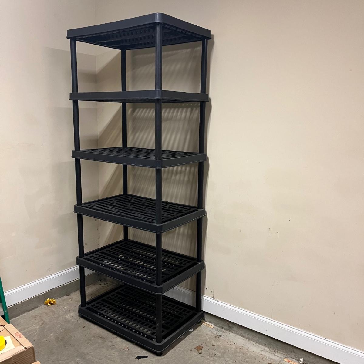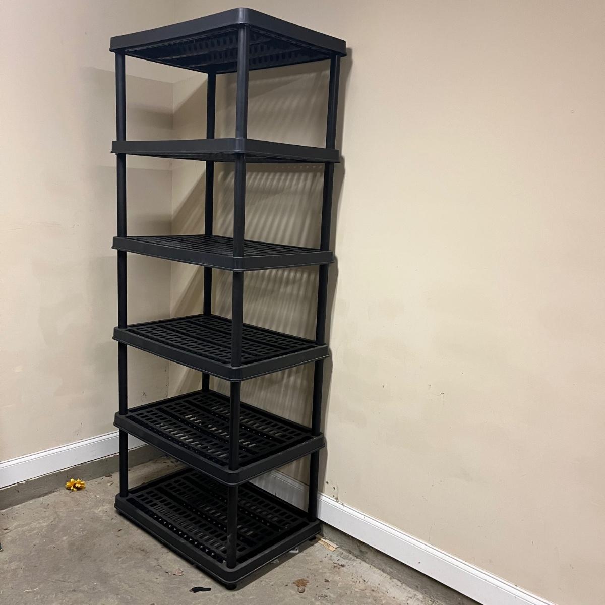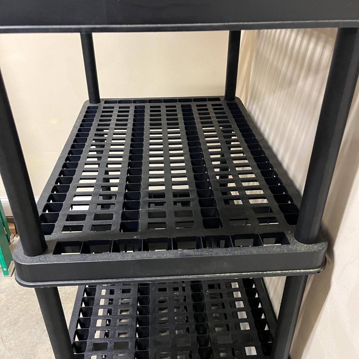 Lot includes a 35.5” x 23.5” x 90”H plastic six shelf shelving unit. Winning bidder can disassamble for easier transport.