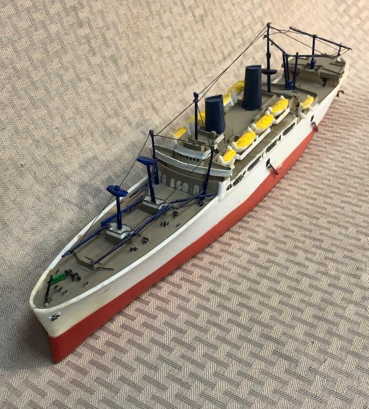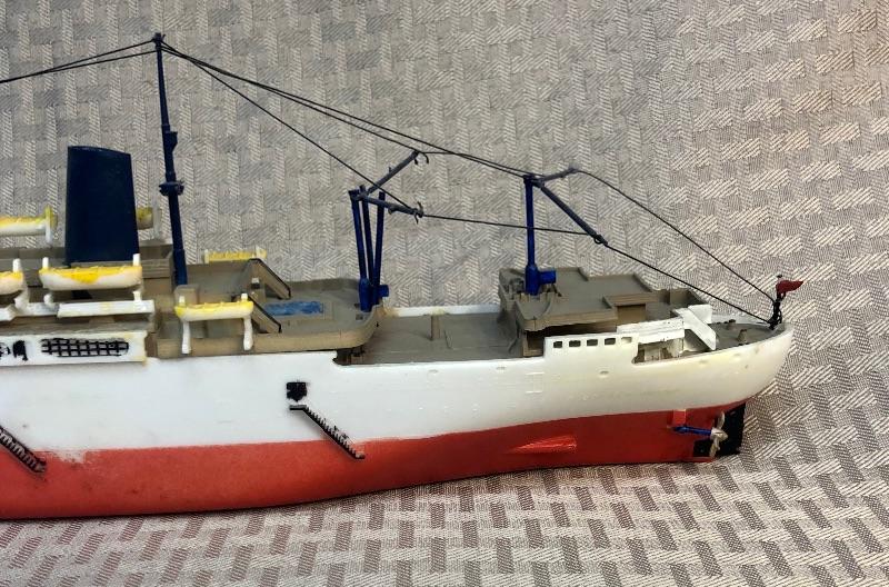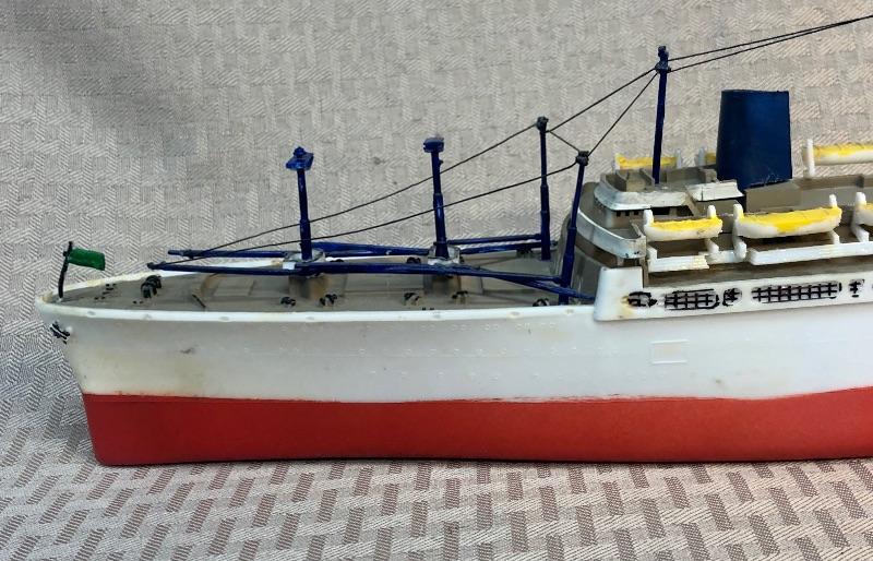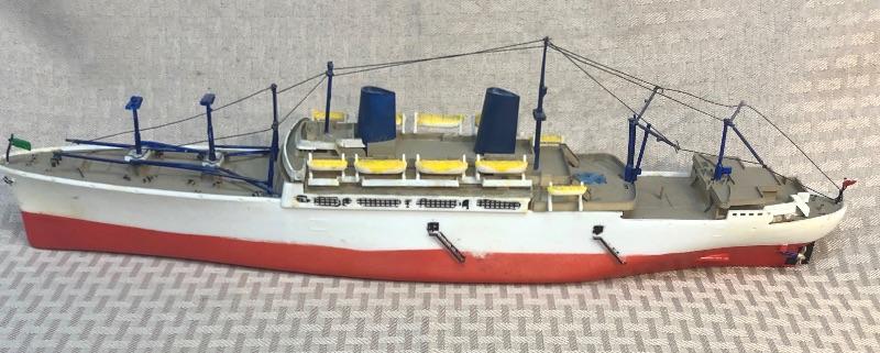 Unusual combination cargo and passenger ship, name unknown. Model is approx 17” long.
