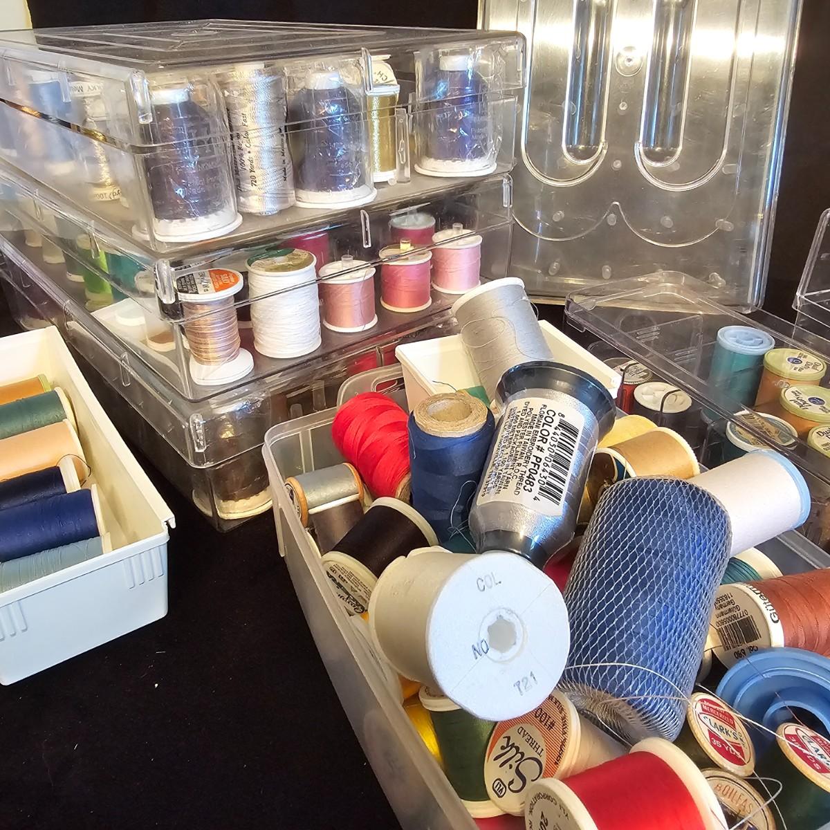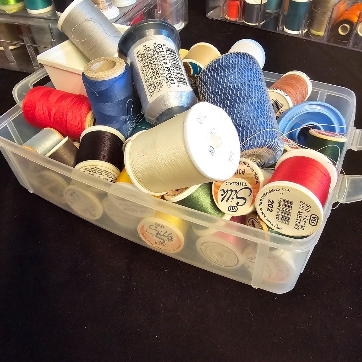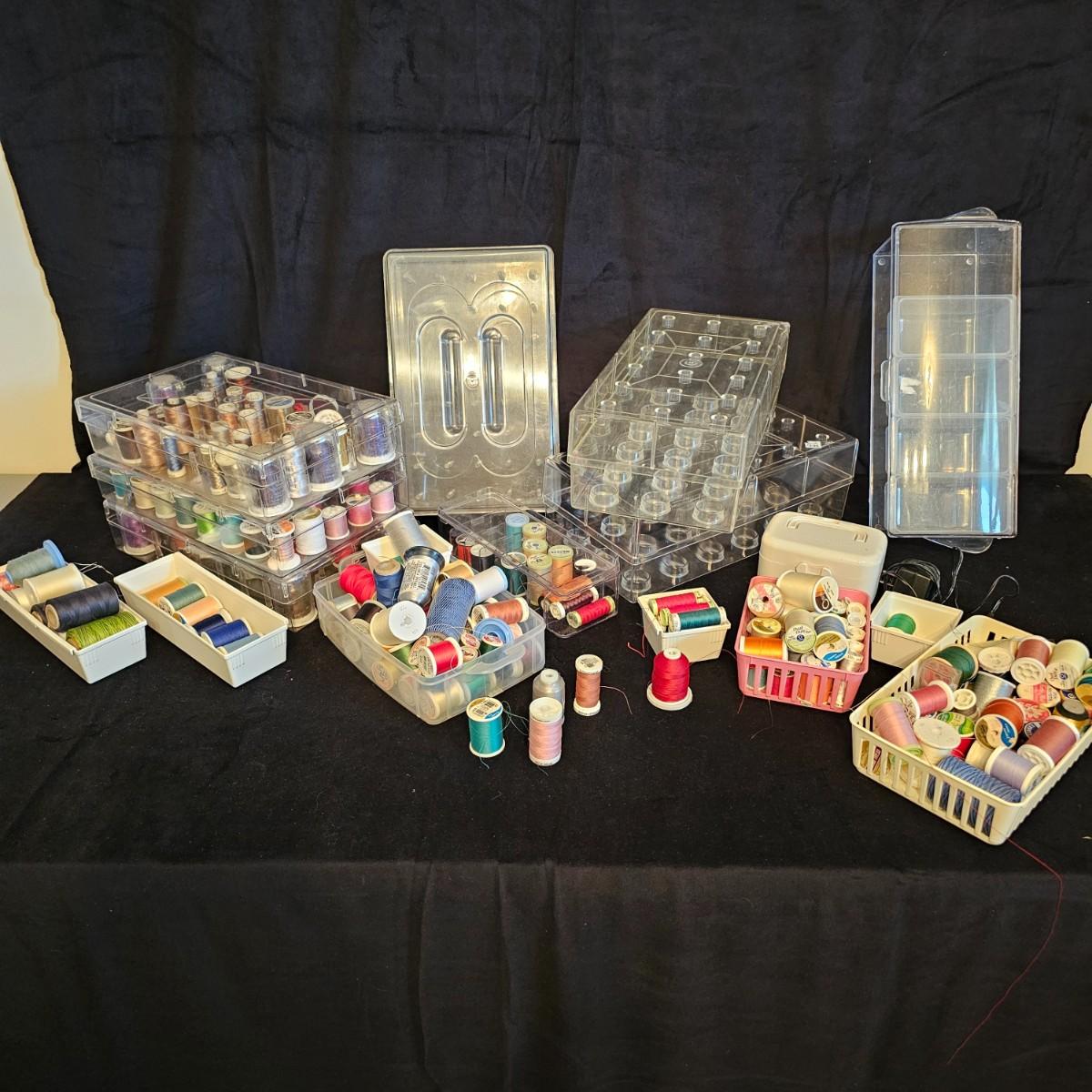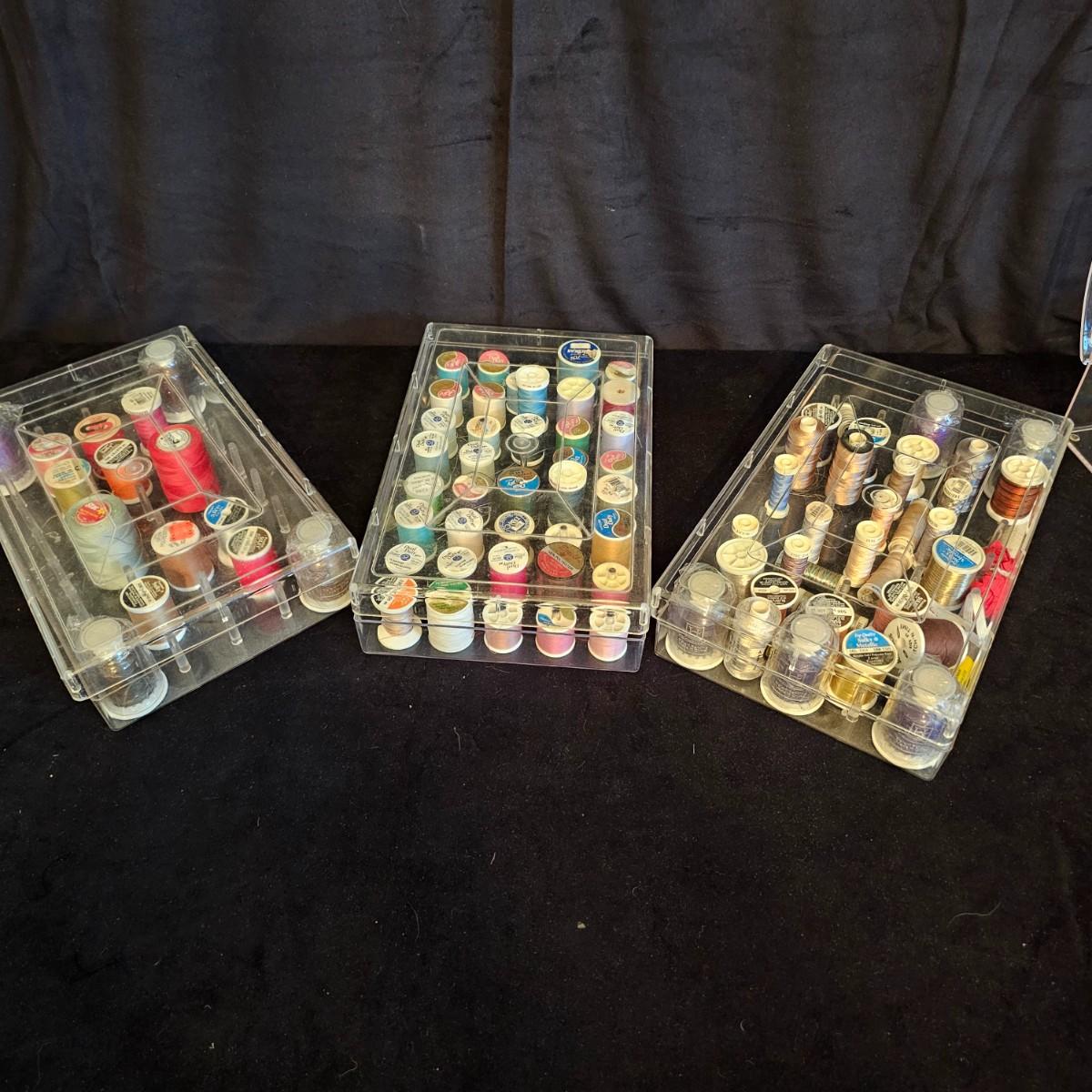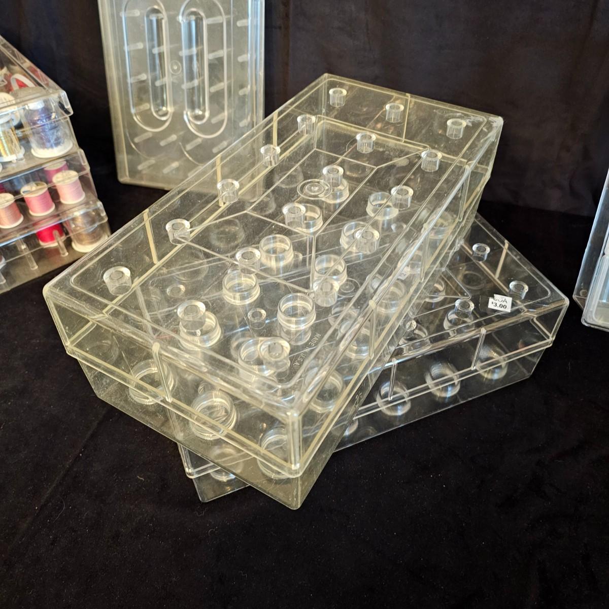 Seven clear plastic cases designed to hold sewing and embroidery thread. Two cases are designed for larger size cones. These measure 14.5" x 7.5" x 5"H. Other cases are 14" x 8" x 3"H. Also includes a quantity of thread in the cases and loose. Coats, Sulky, silk and cotton blends. One Sidewinder manual bobbin winder with power brick. Item powered on when plugged in. See photos for details. Local pickup only.