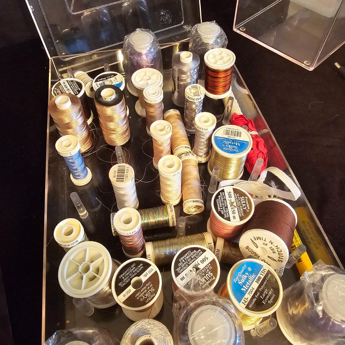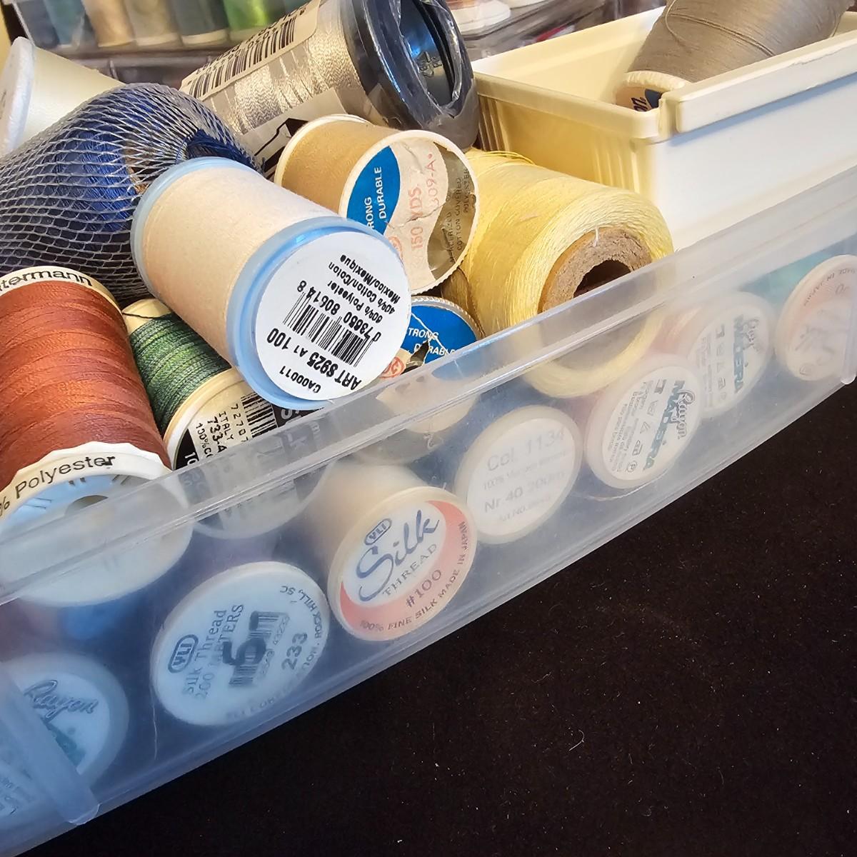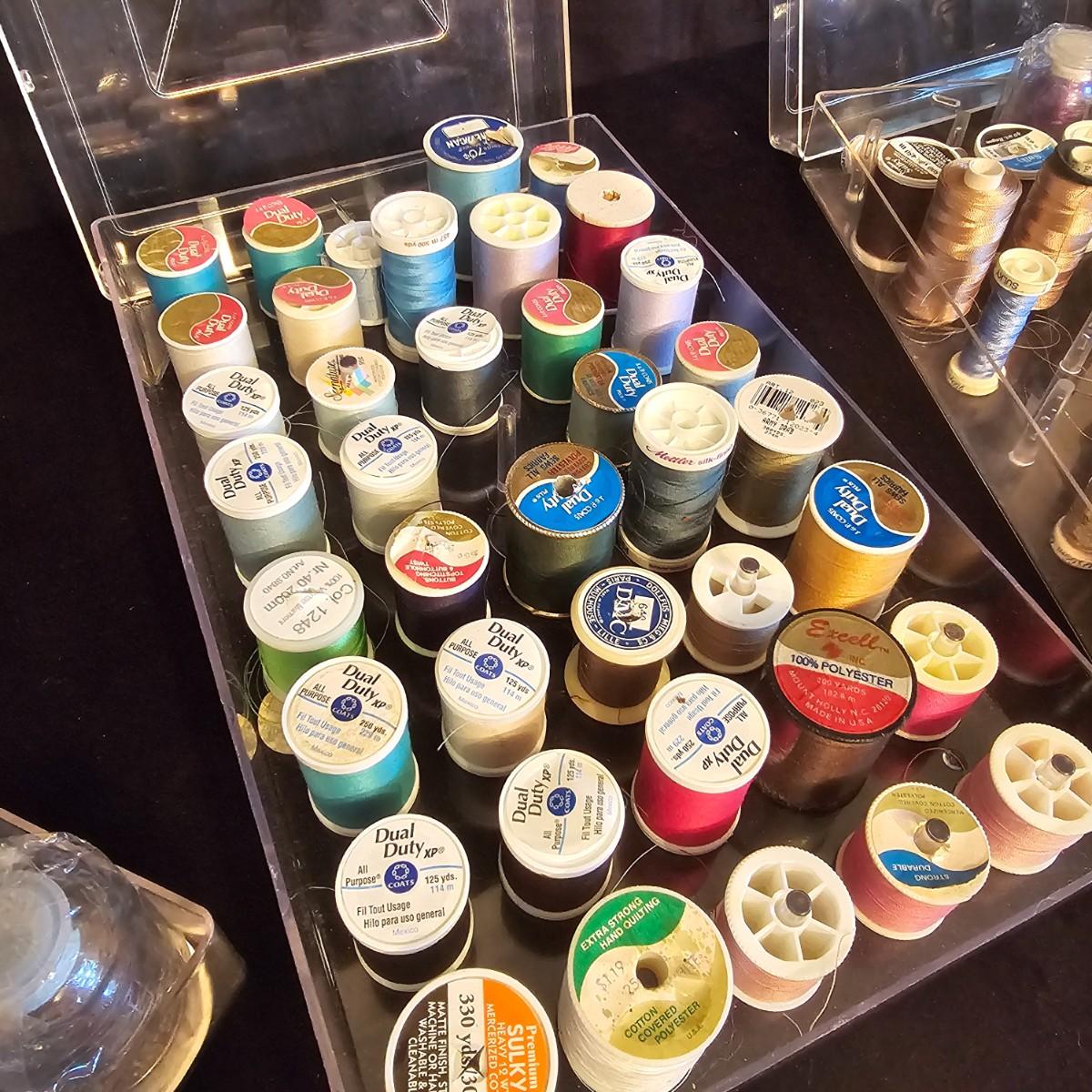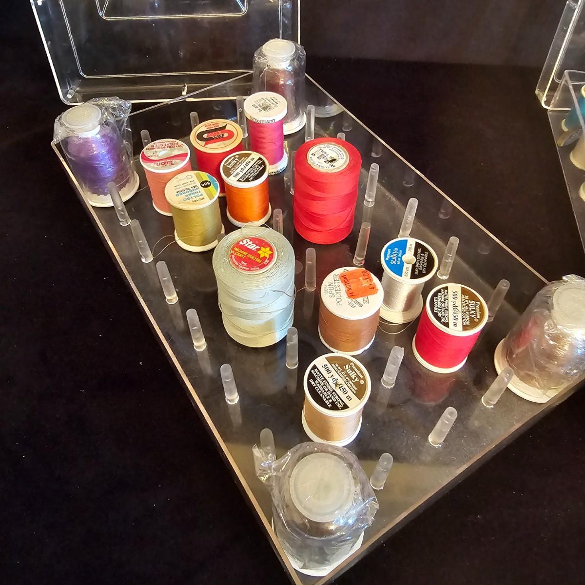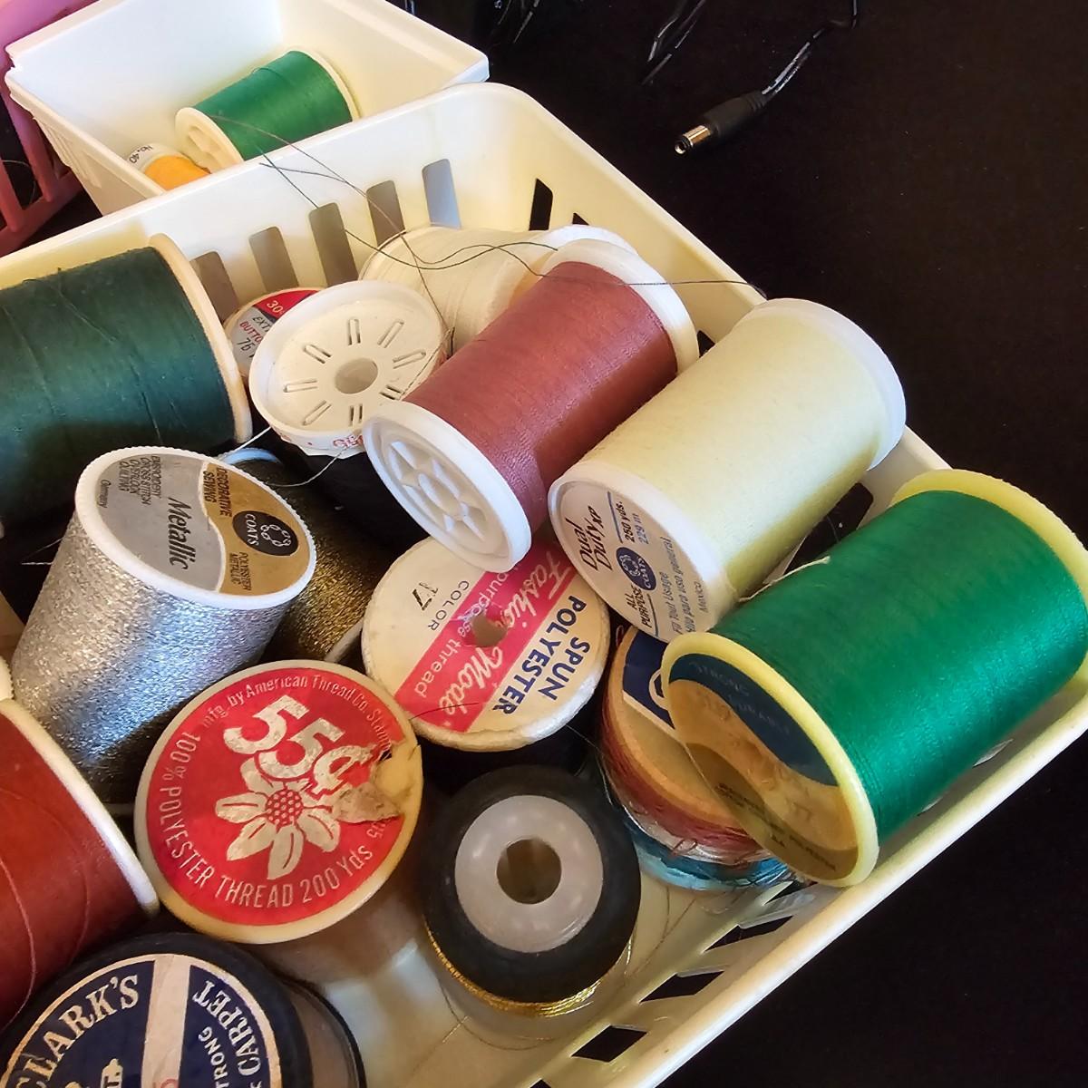 Seven clear plastic cases designed to hold sewing and embroidery thread. Two cases are designed for larger size cones. These measure 14.5" x 7.5" x 5"H. Other cases are 14" x 8" x 3"H. Also includes a quantity of thread in the cases and loose. Coats, Sulky, silk and cotton blends. One Sidewinder manual bobbin winder with power brick. Item powered on when plugged in. See photos for details. Local pickup only.