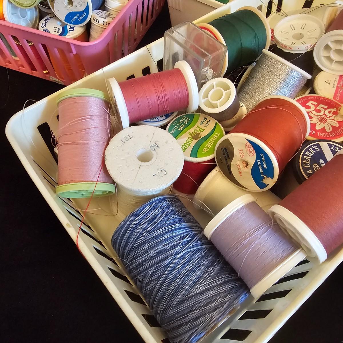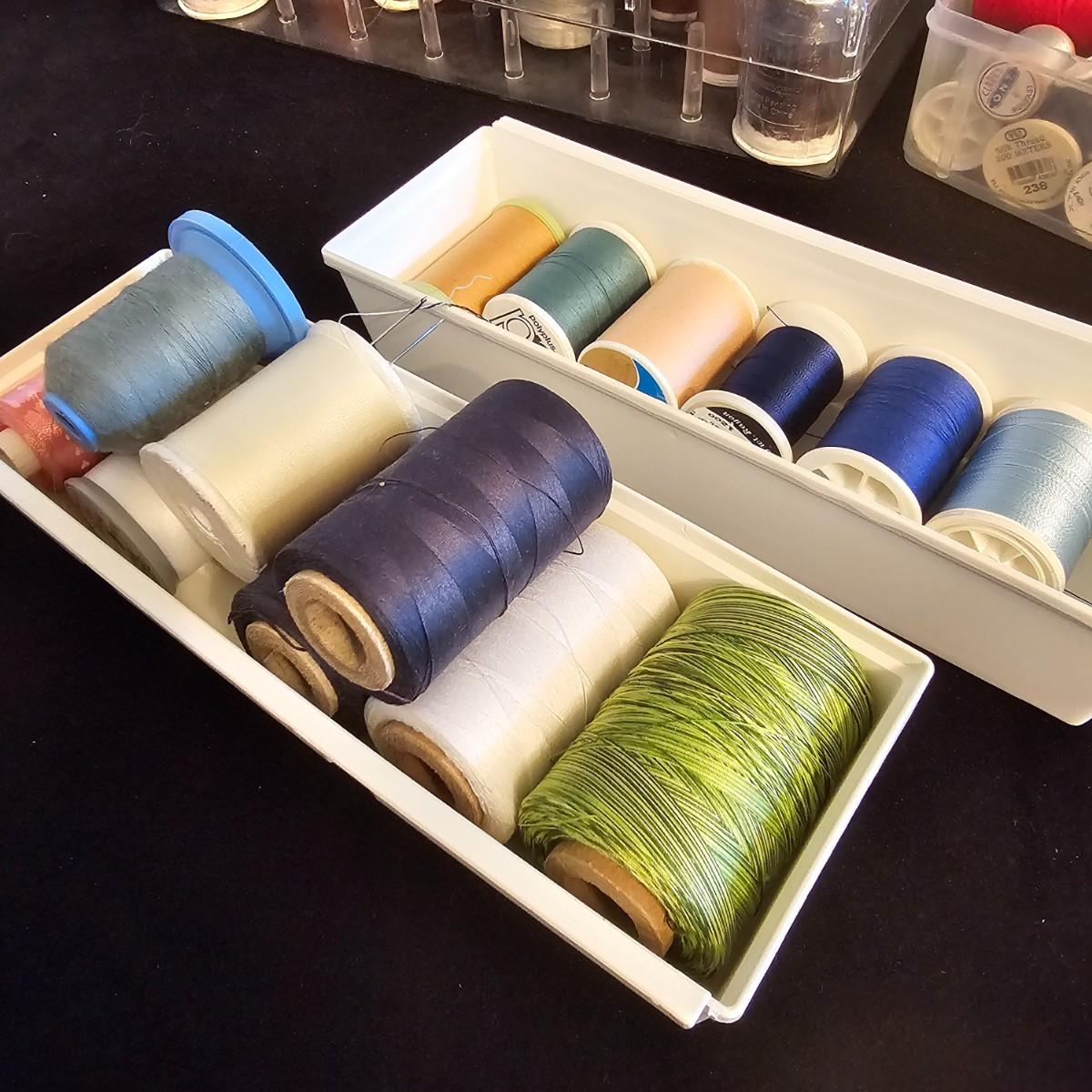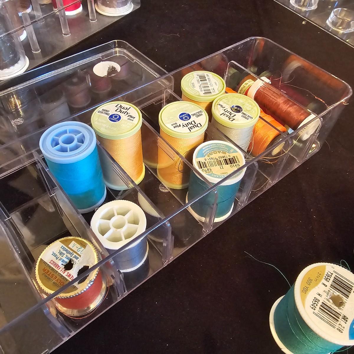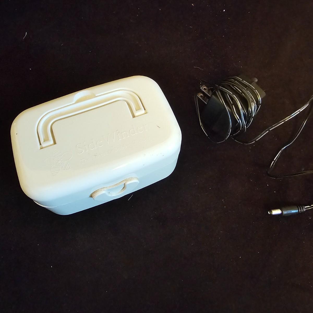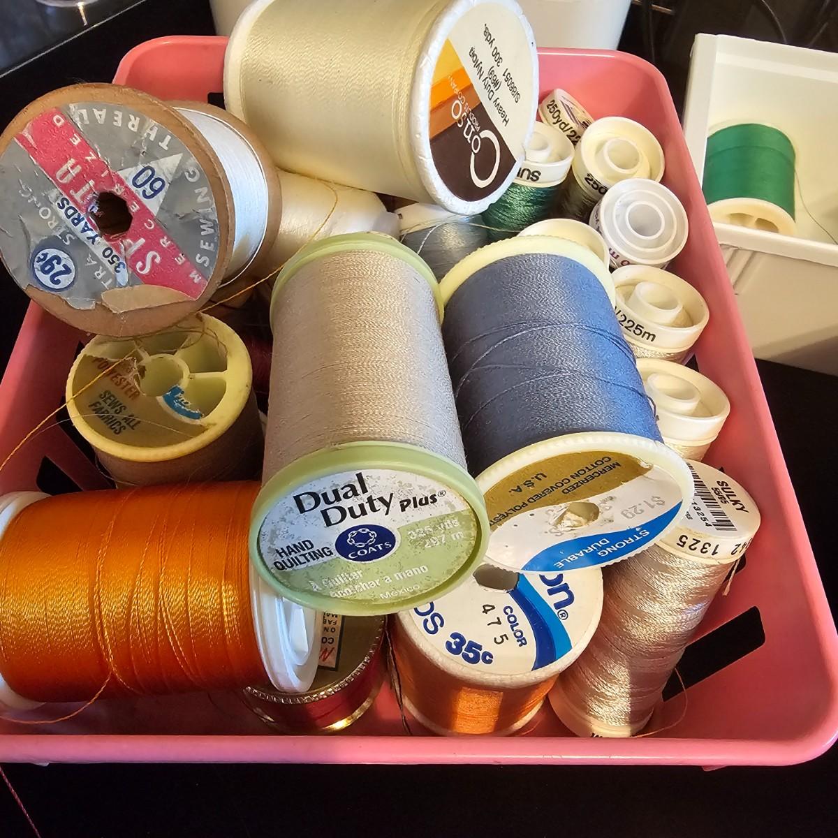 Seven clear plastic cases designed to hold sewing and embroidery thread. Two cases are designed for larger size cones. These measure 14.5" x 7.5" x 5"H. Other cases are 14" x 8" x 3"H. Also includes a quantity of thread in the cases and loose. Coats, Sulky, silk and cotton blends. One Sidewinder manual bobbin winder with power brick. Item powered on when plugged in. See photos for details. Local pickup only.