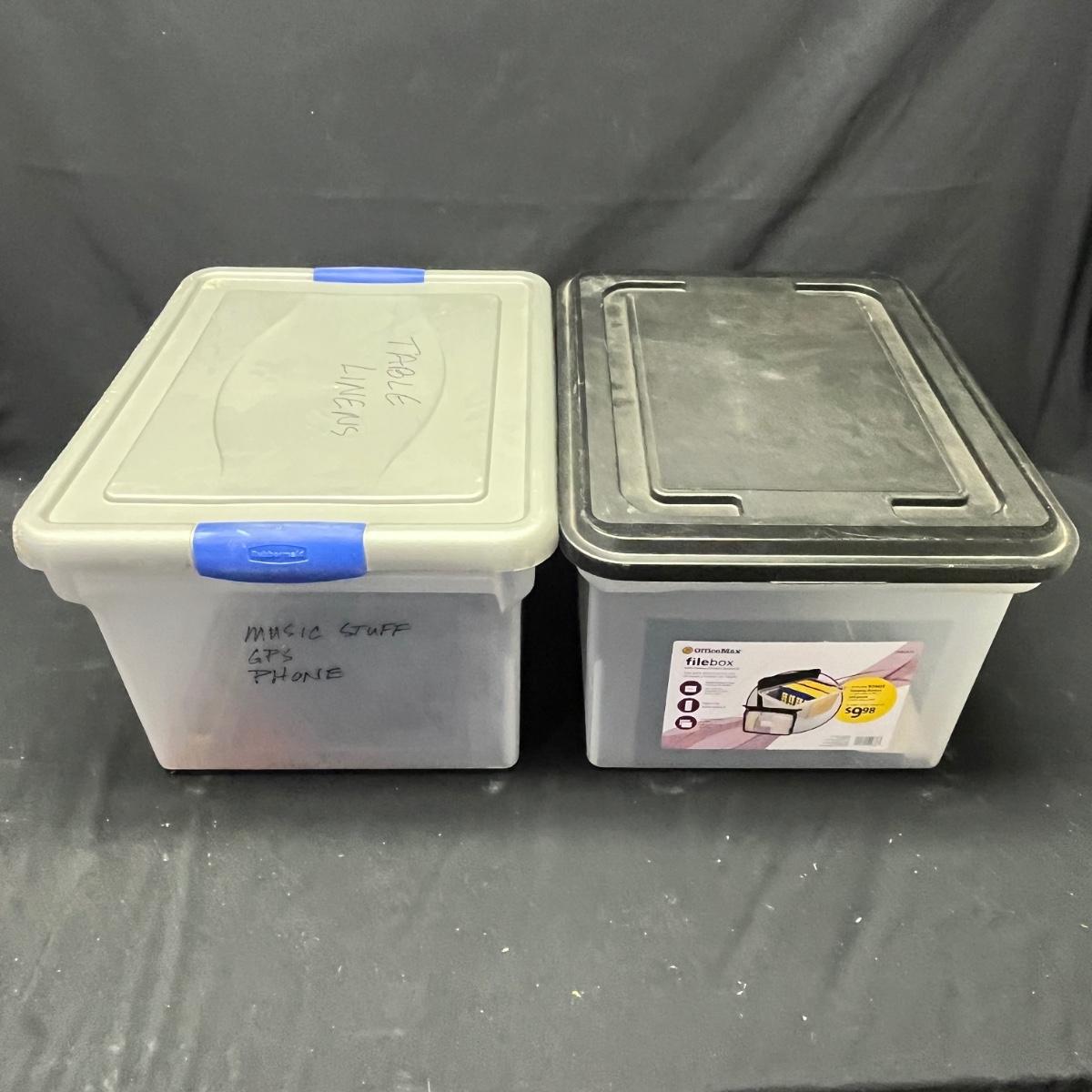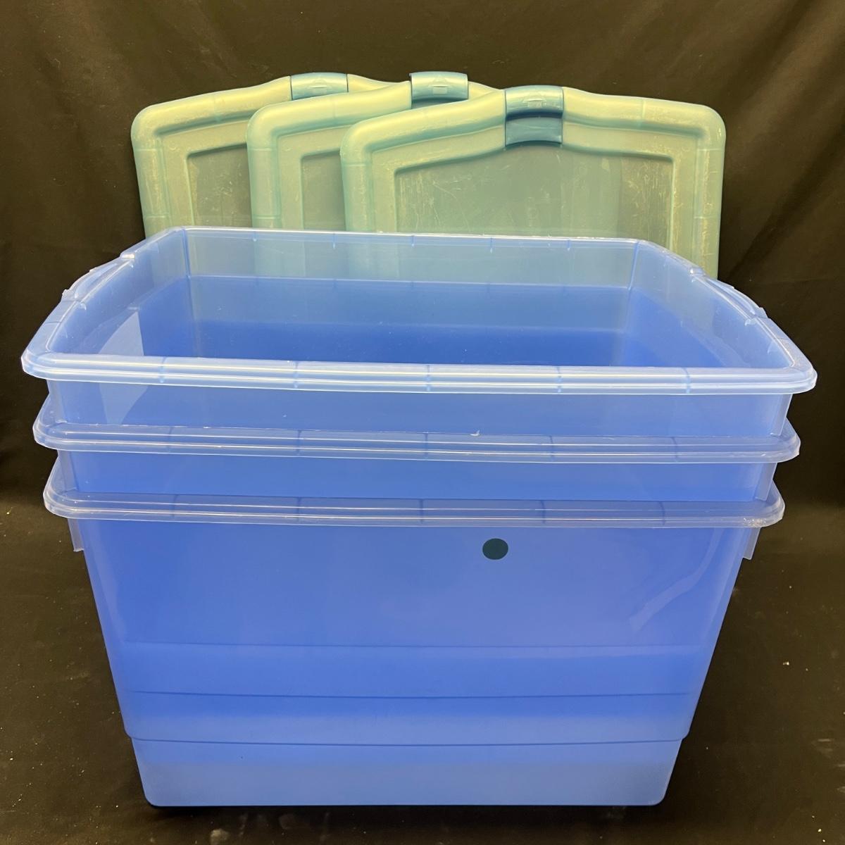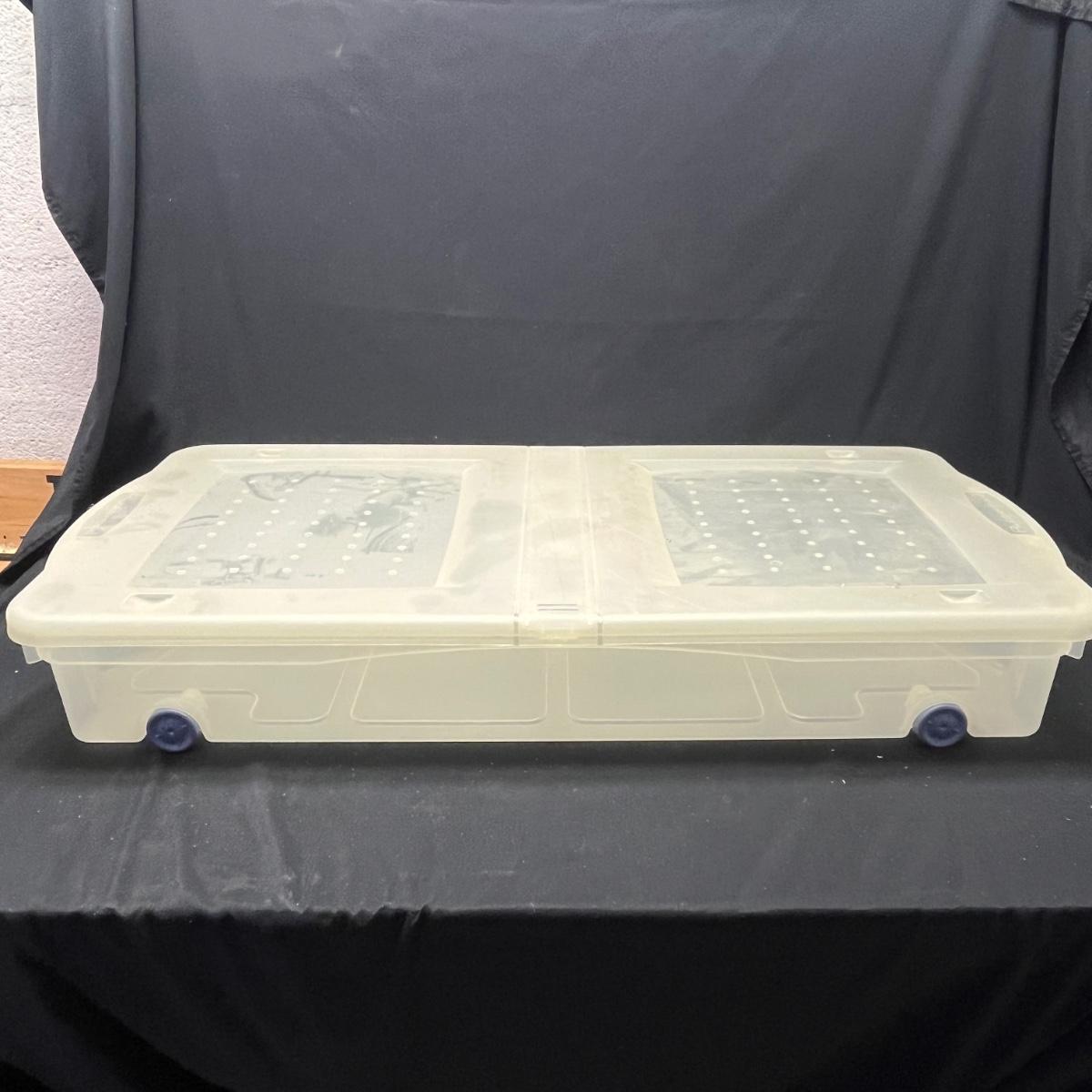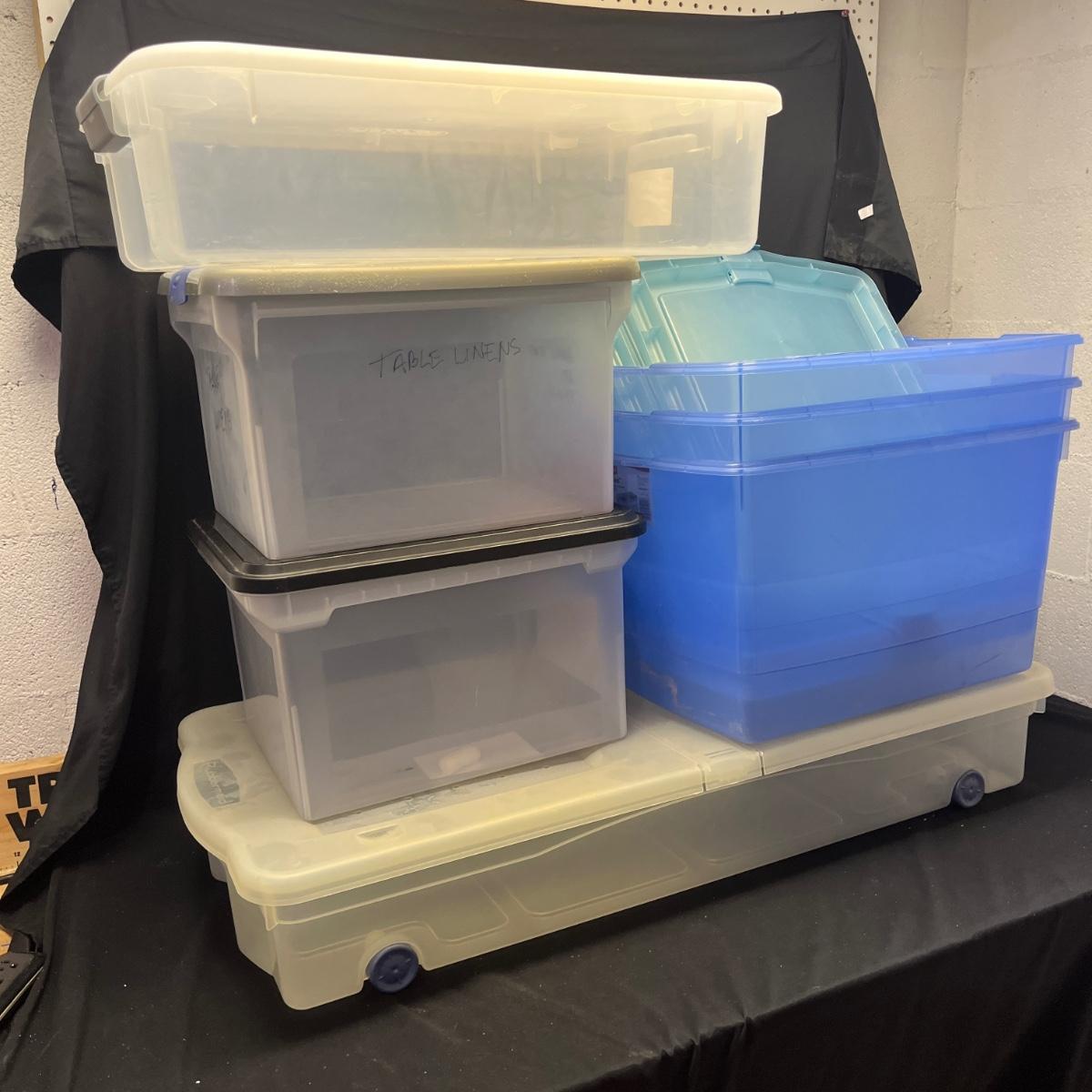 Lot contains seven plastic bins with lids in a variety of sizes. Most are made by Rubbermaid. Largest bin measures 19" x 43" x 7"H.
