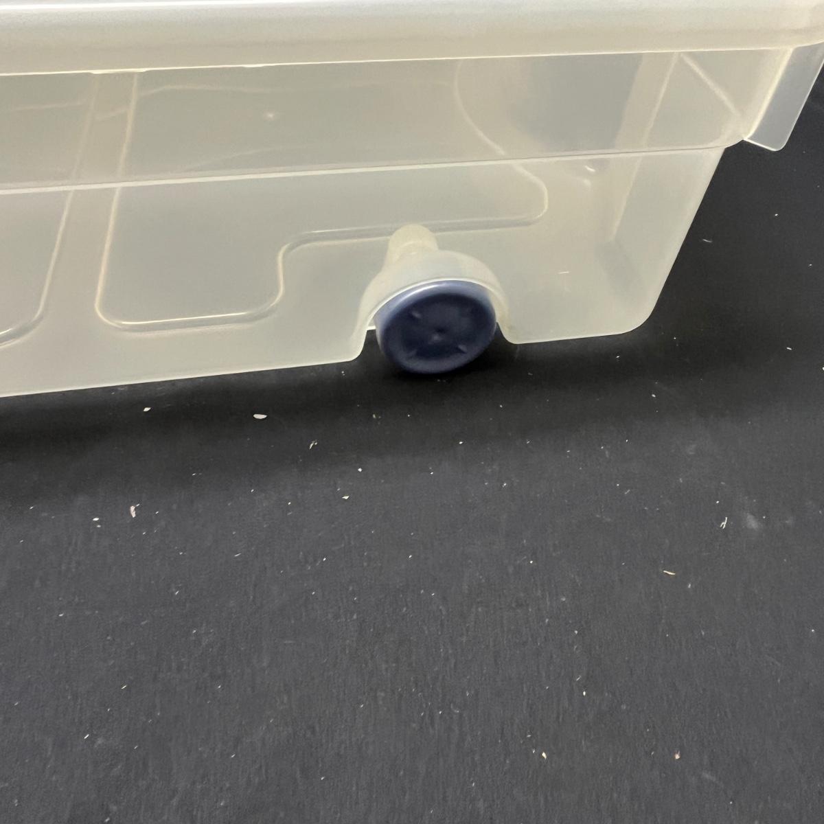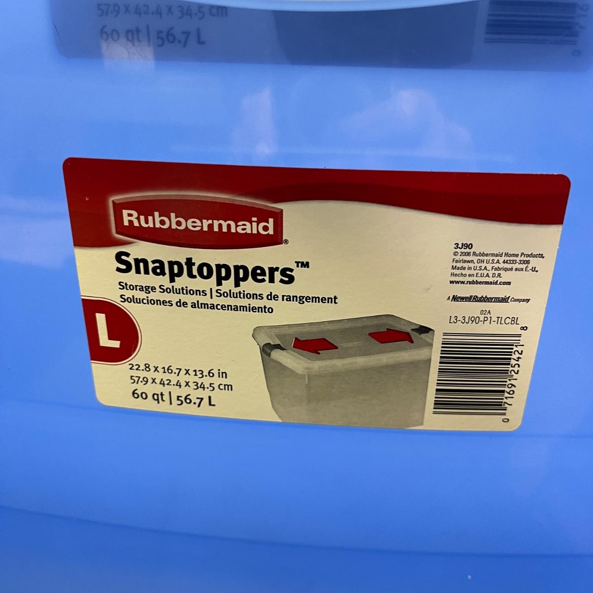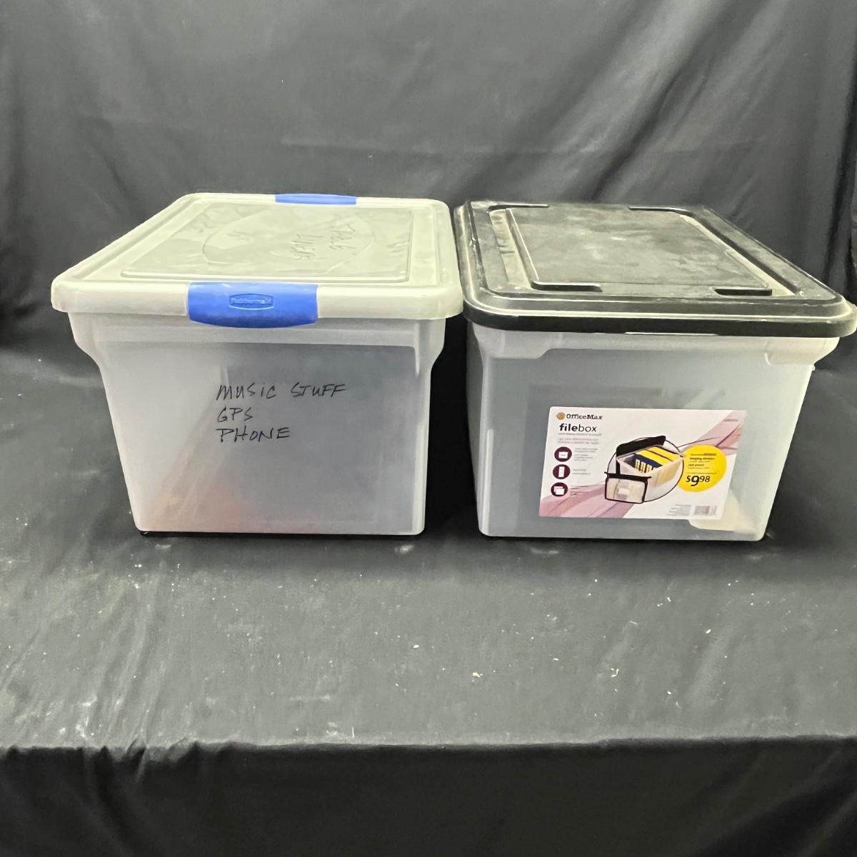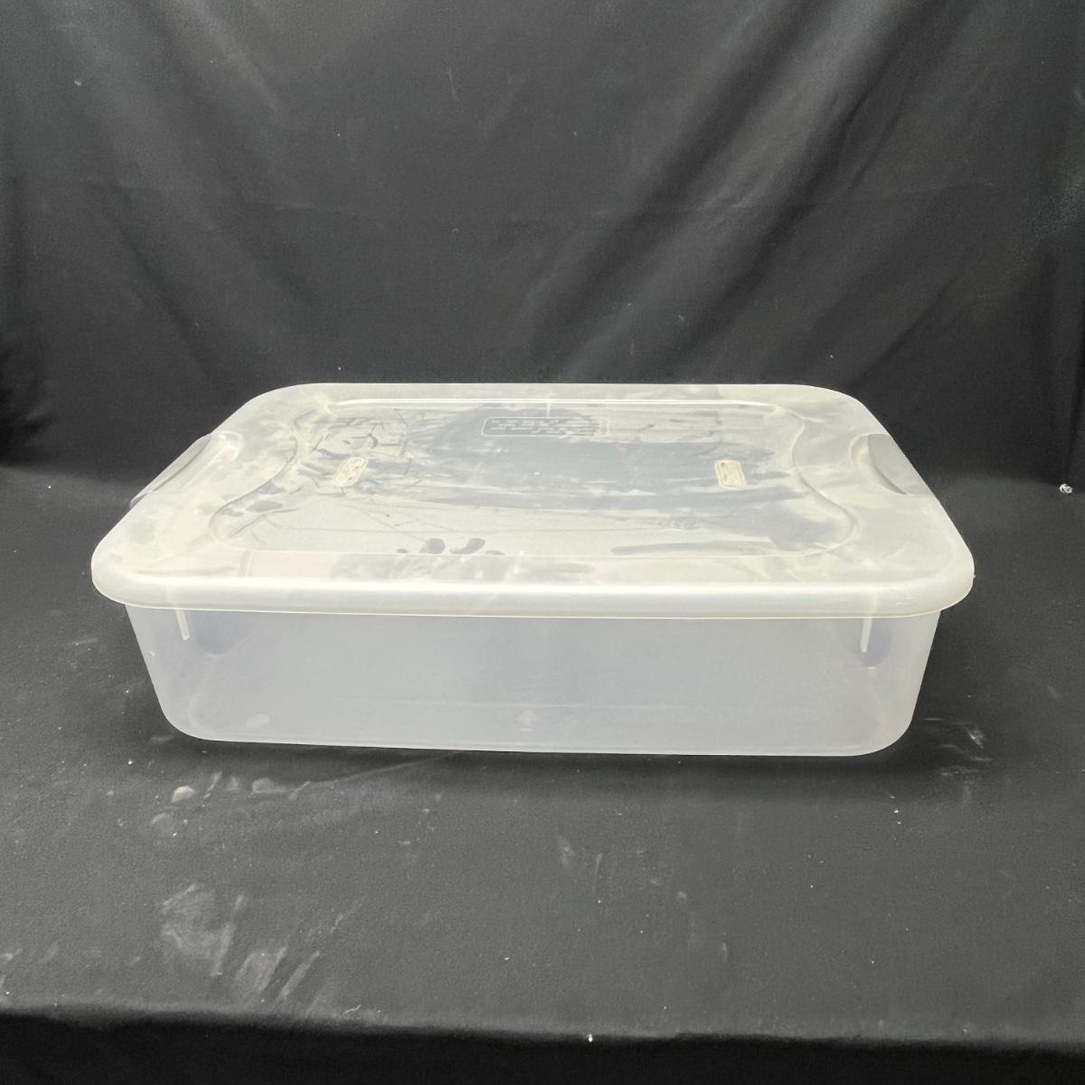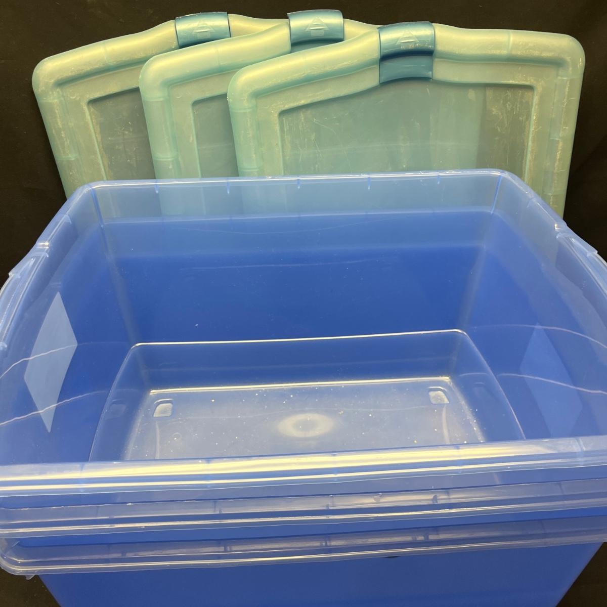 Lot contains seven plastic bins with lids in a variety of sizes. Most are made by Rubbermaid. Largest bin measures 19" x 43" x 7"H.