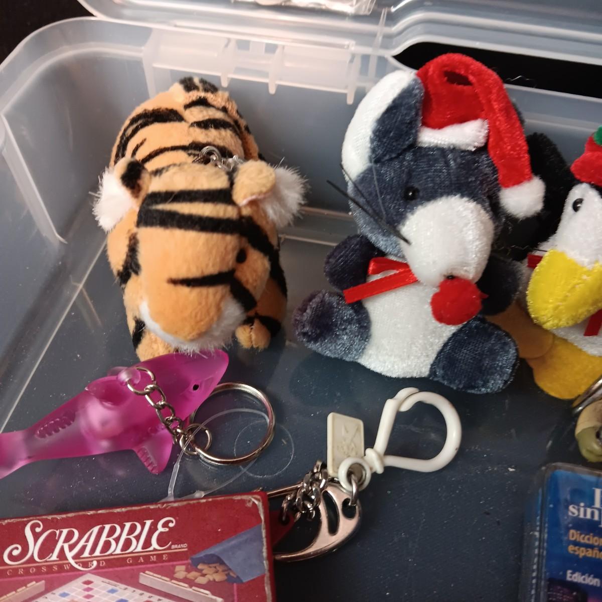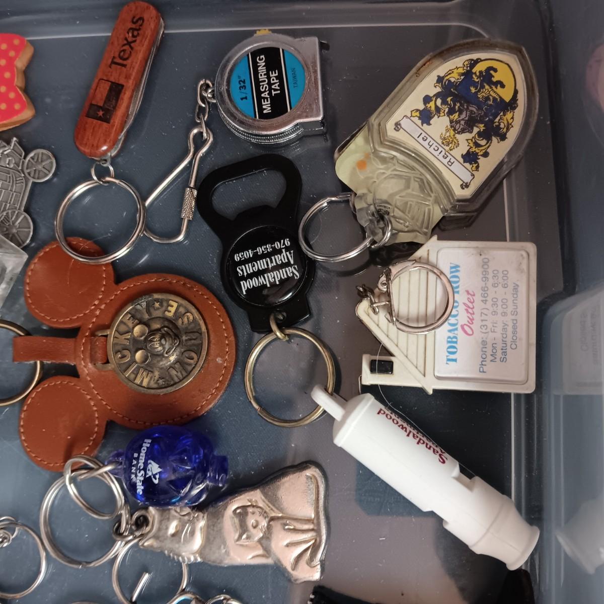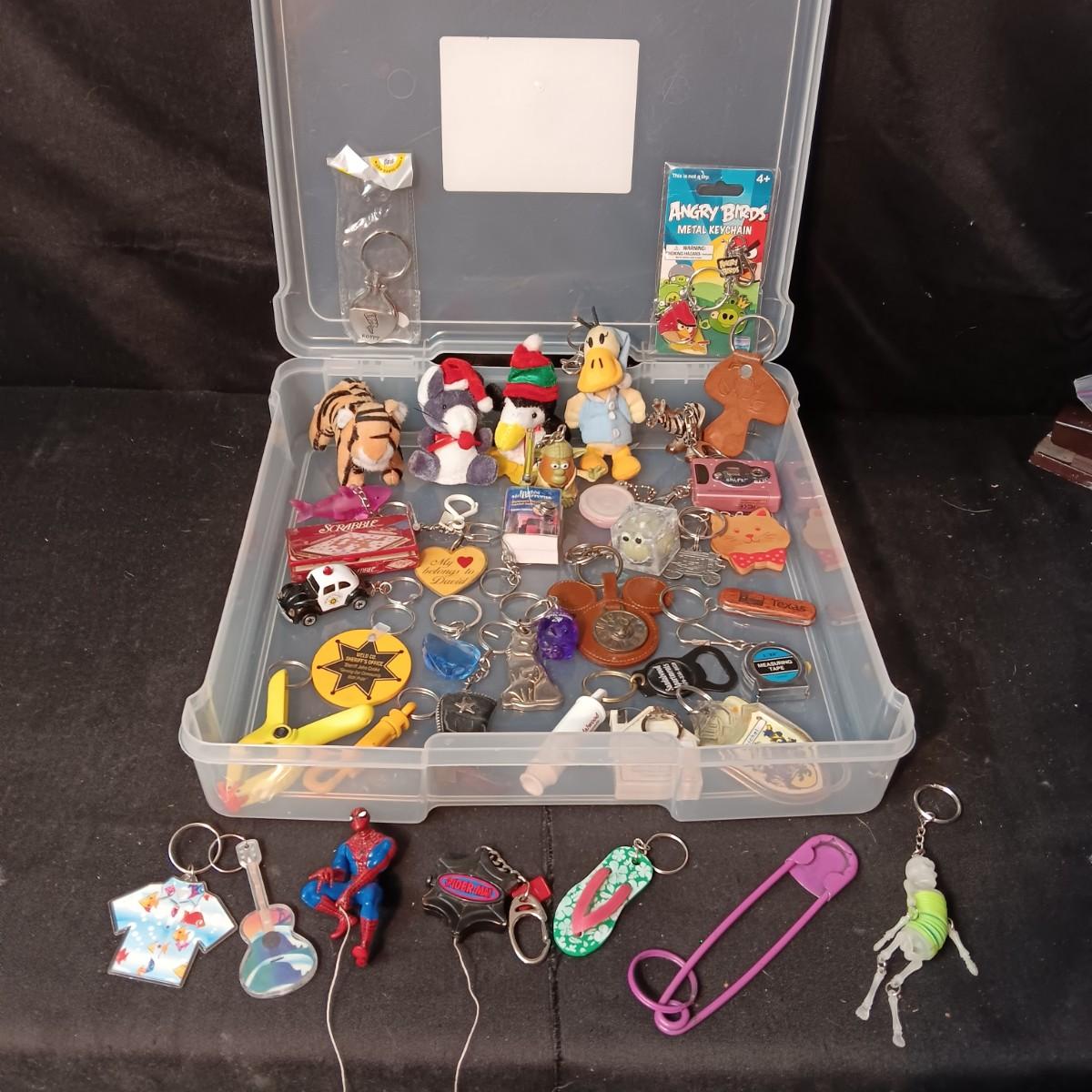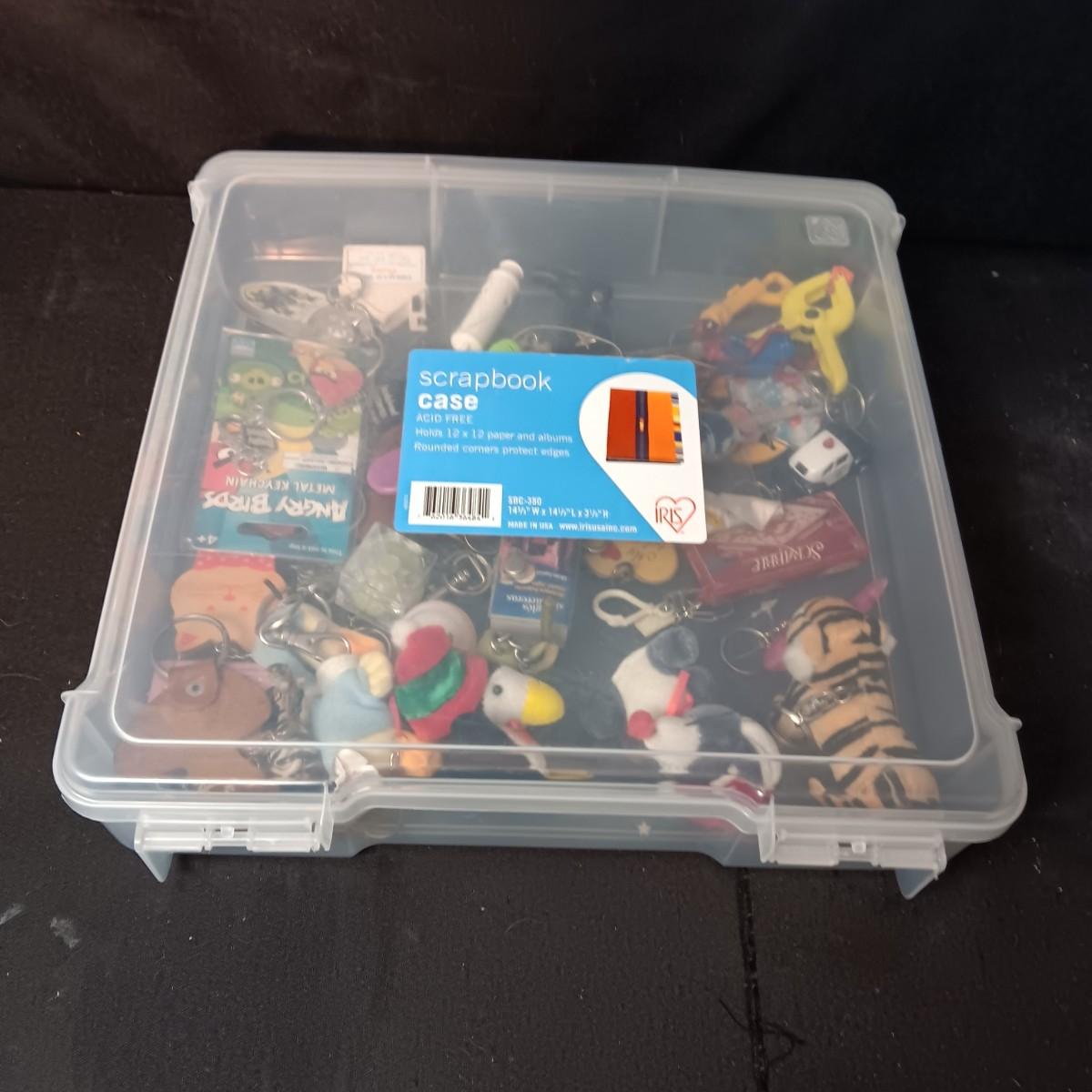 PLASTIC STORAGE CONTAINER FILLED WITH UNIQUE KEYCHAINS