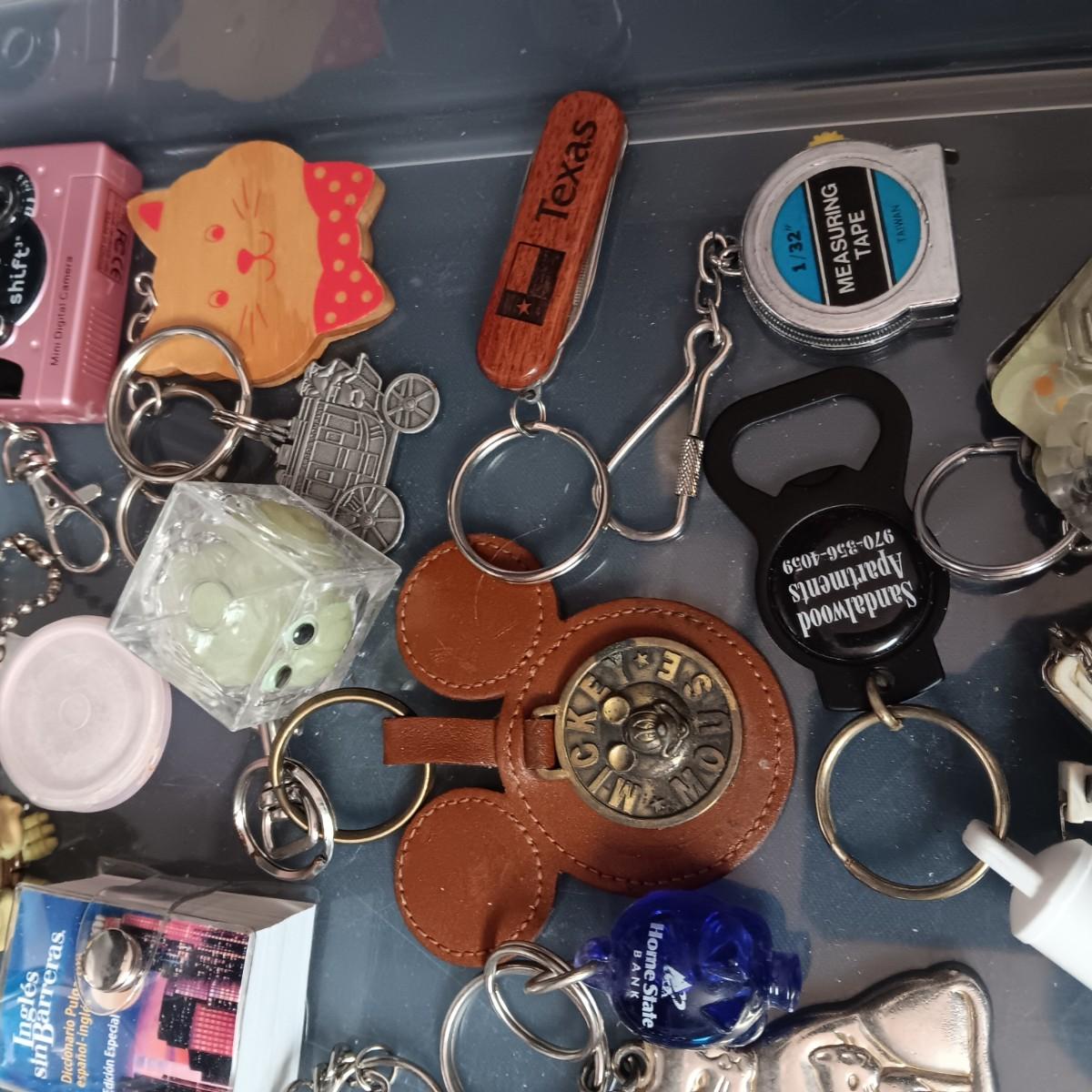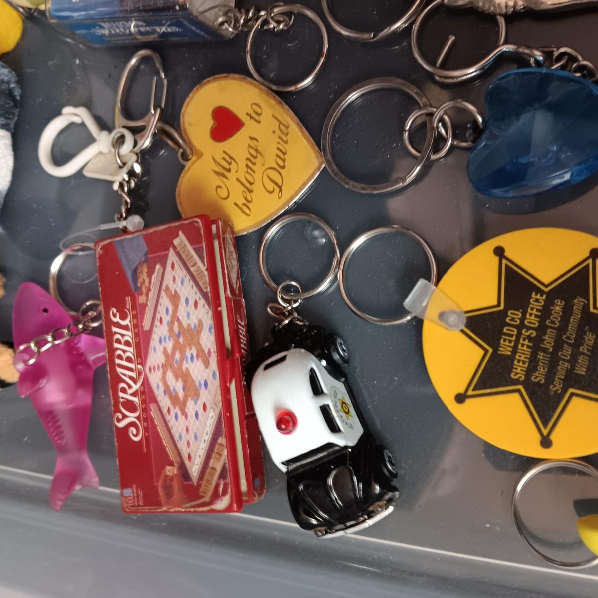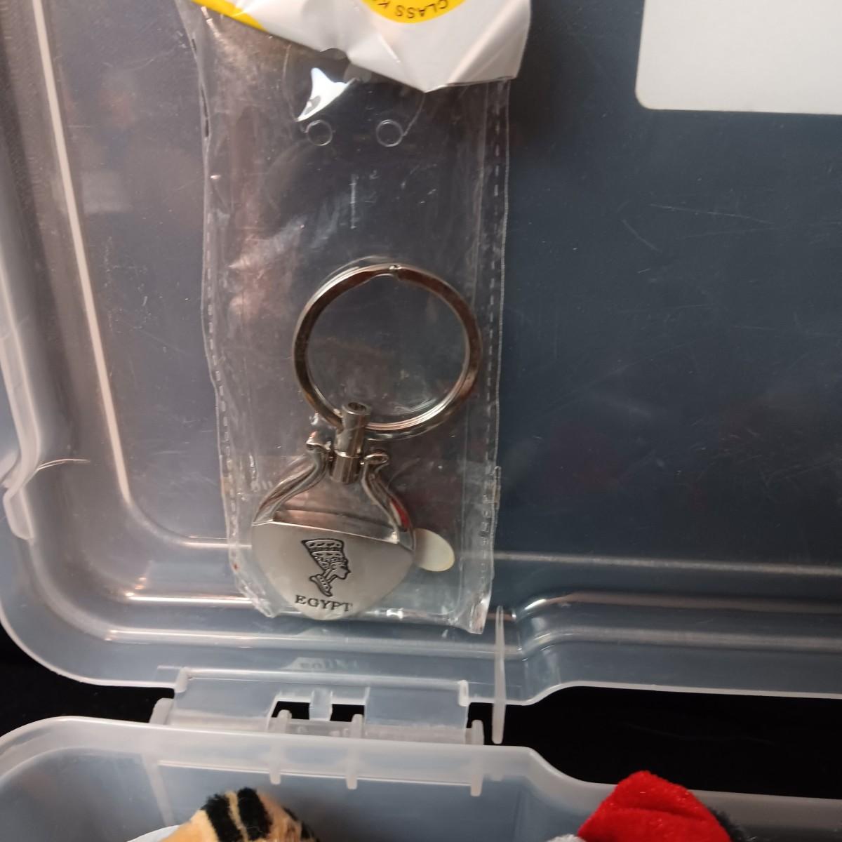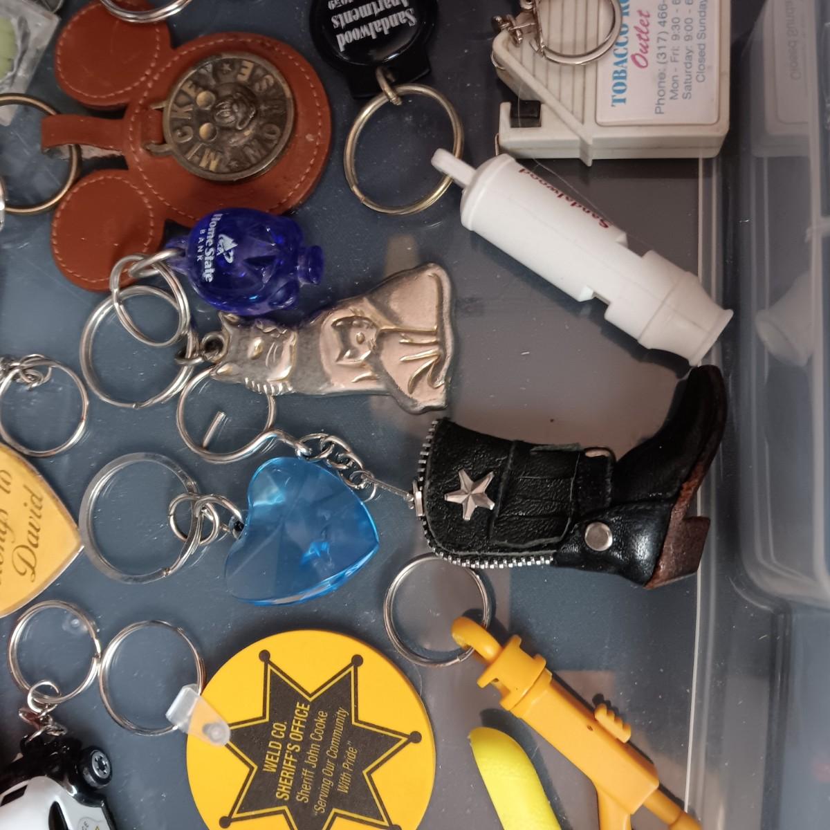 PLASTIC STORAGE CONTAINER FILLED WITH UNIQUE KEYCHAINS