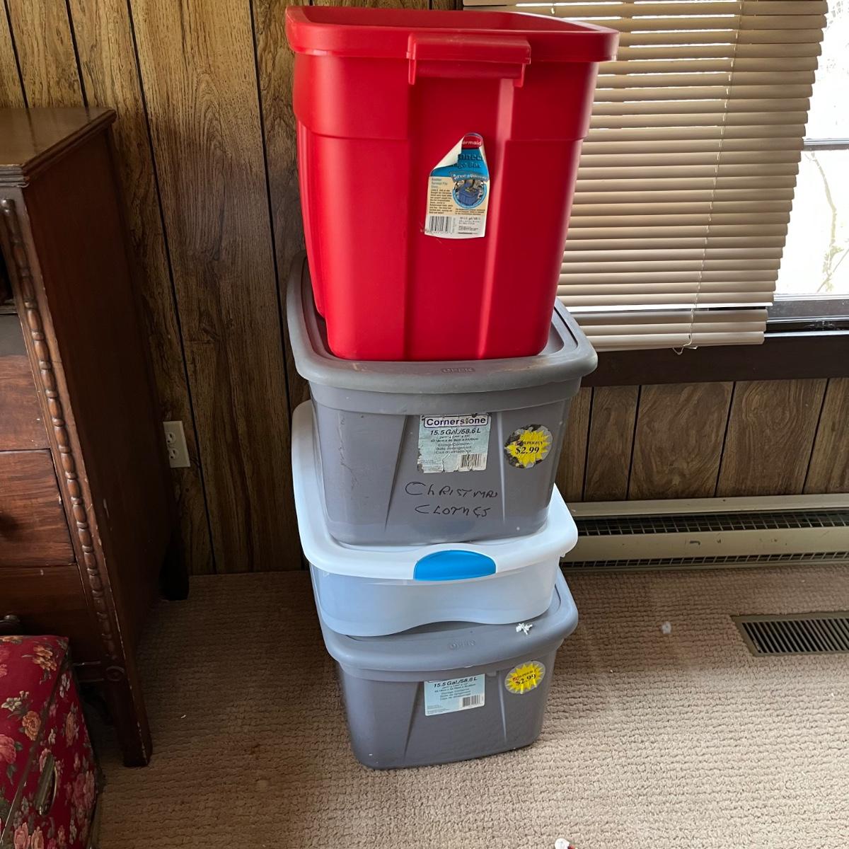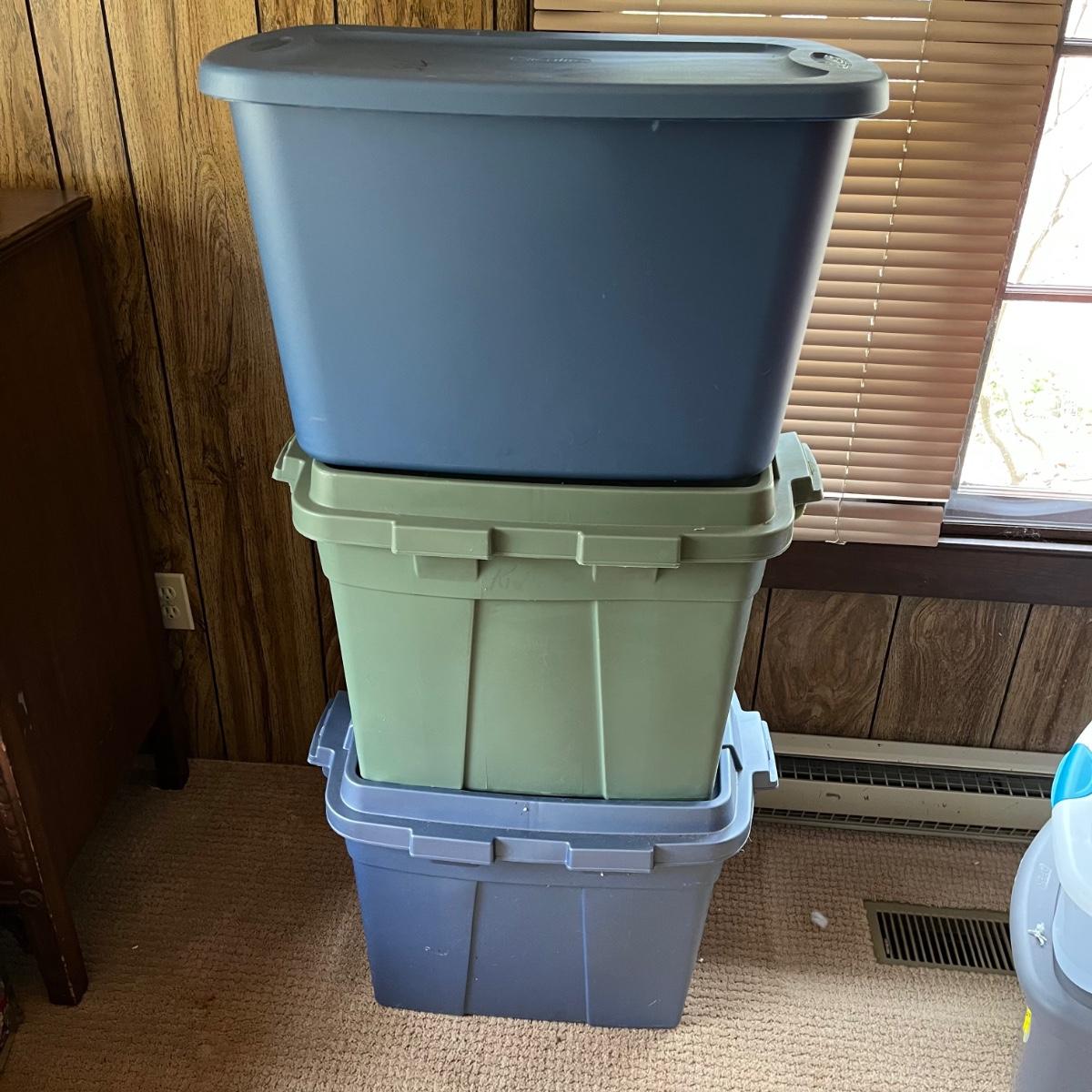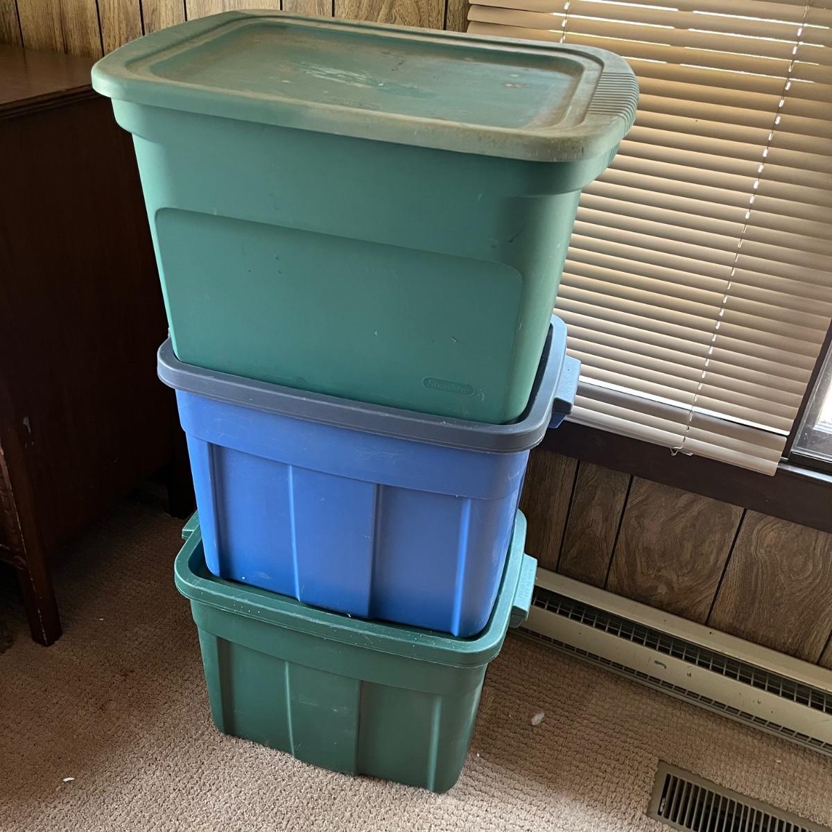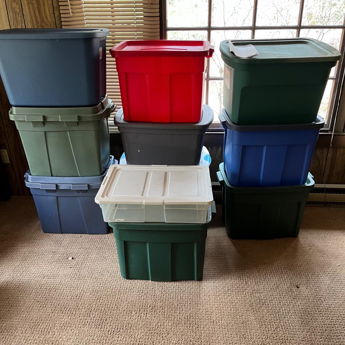 This lot contains eleven storage containers in a variety of sizes and colors. Brands include Sterilite, Rubbermaid and Cornerstone. Largest container measures 17” x 25” x 16”.