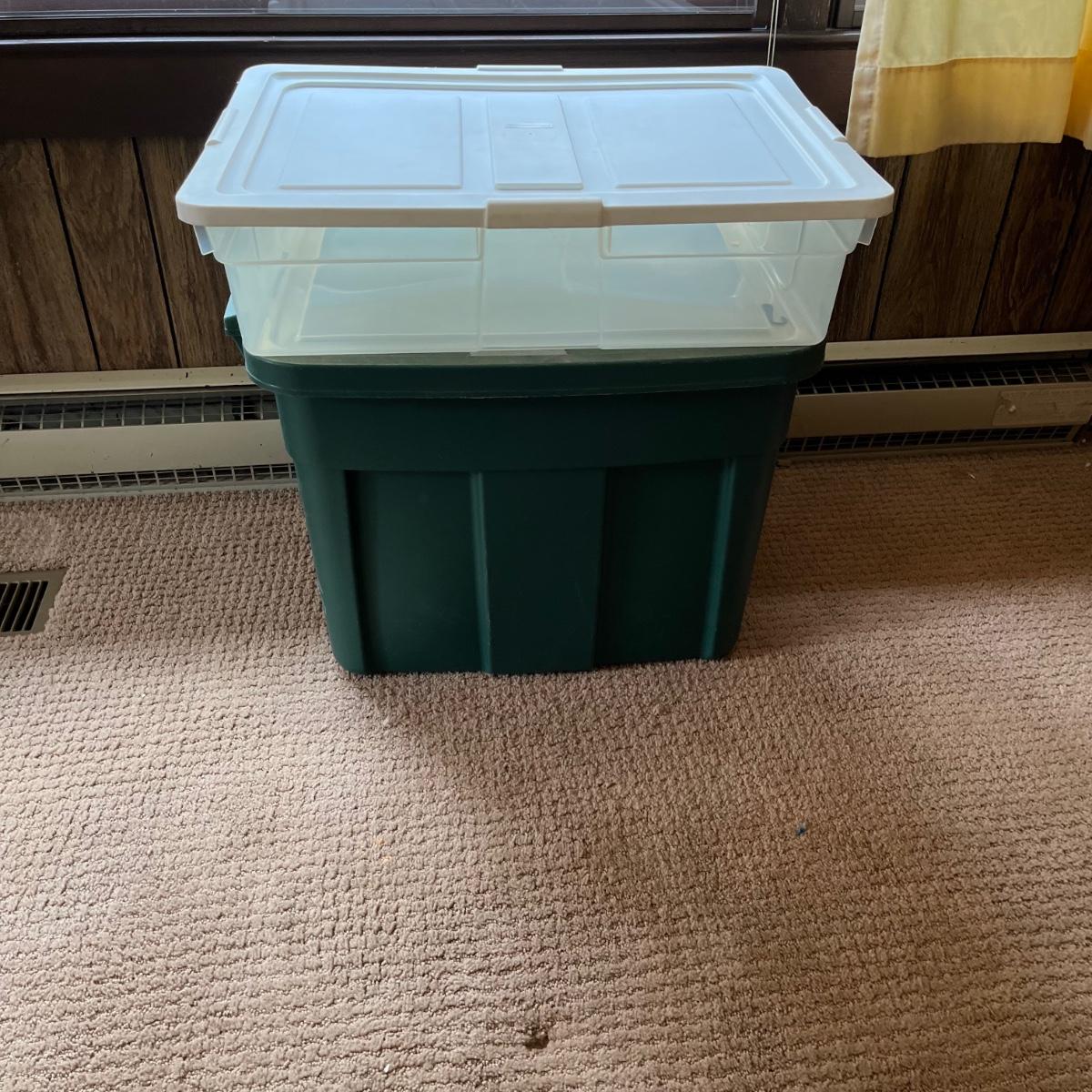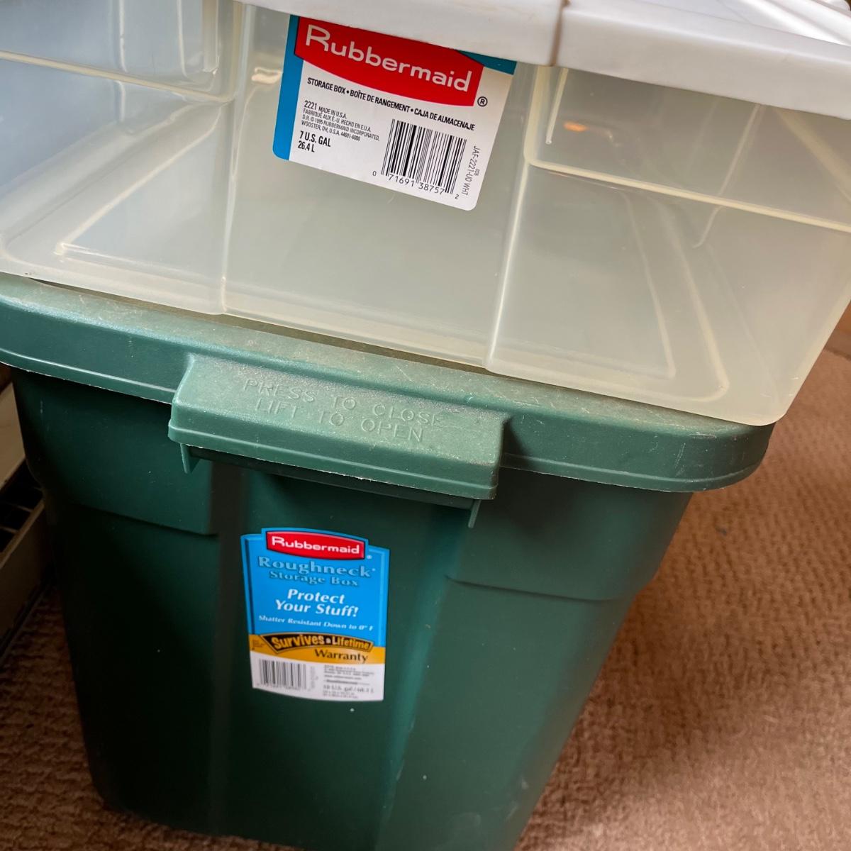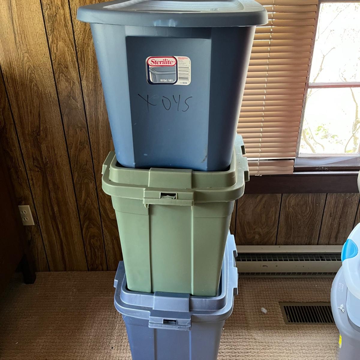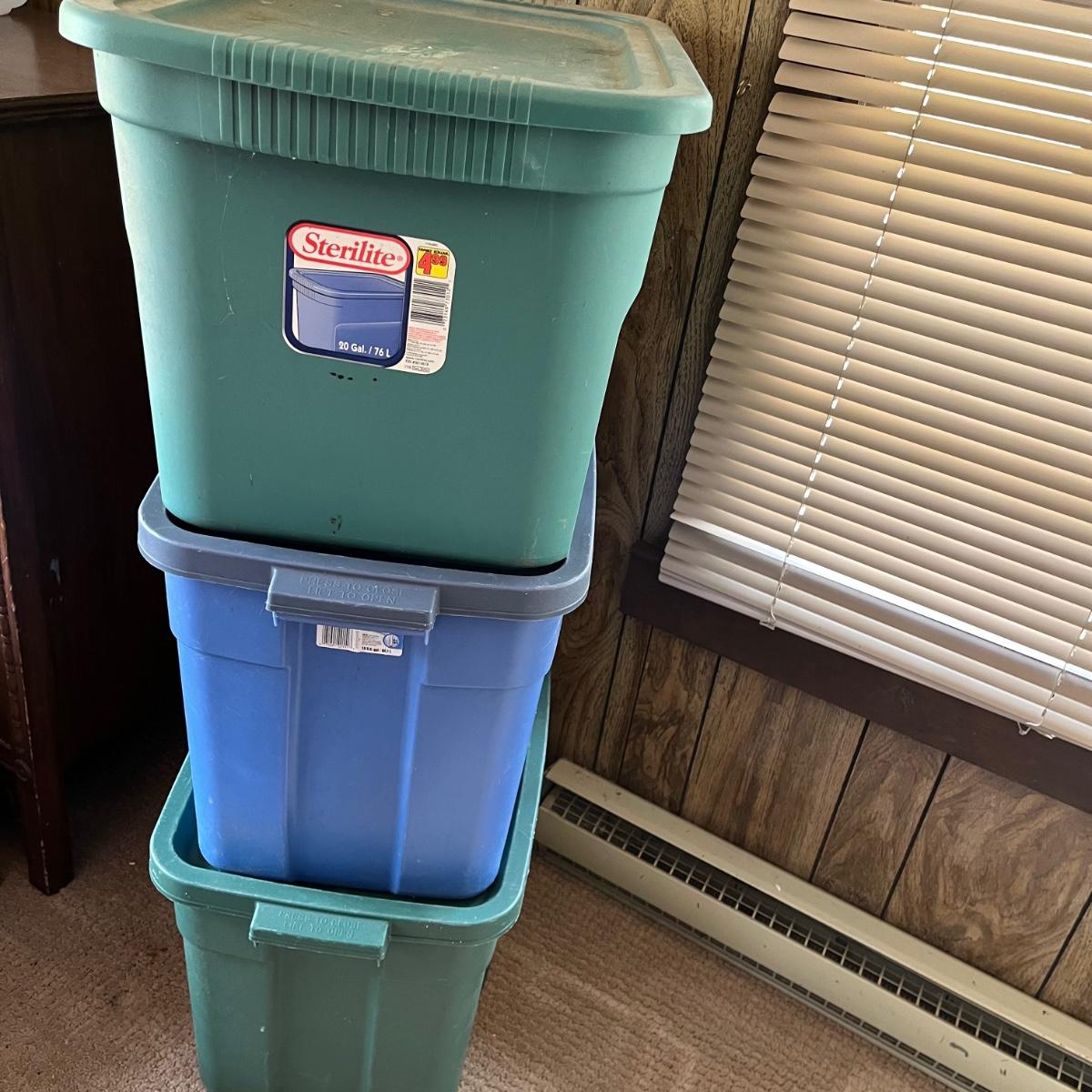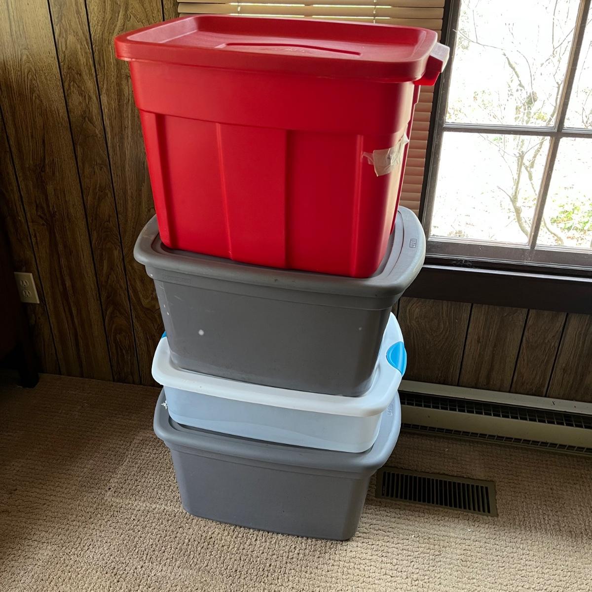 This lot contains eleven storage containers in a variety of sizes and colors. Brands include Sterilite, Rubbermaid and Cornerstone. Largest container measures 17” x 25” x 16”.
