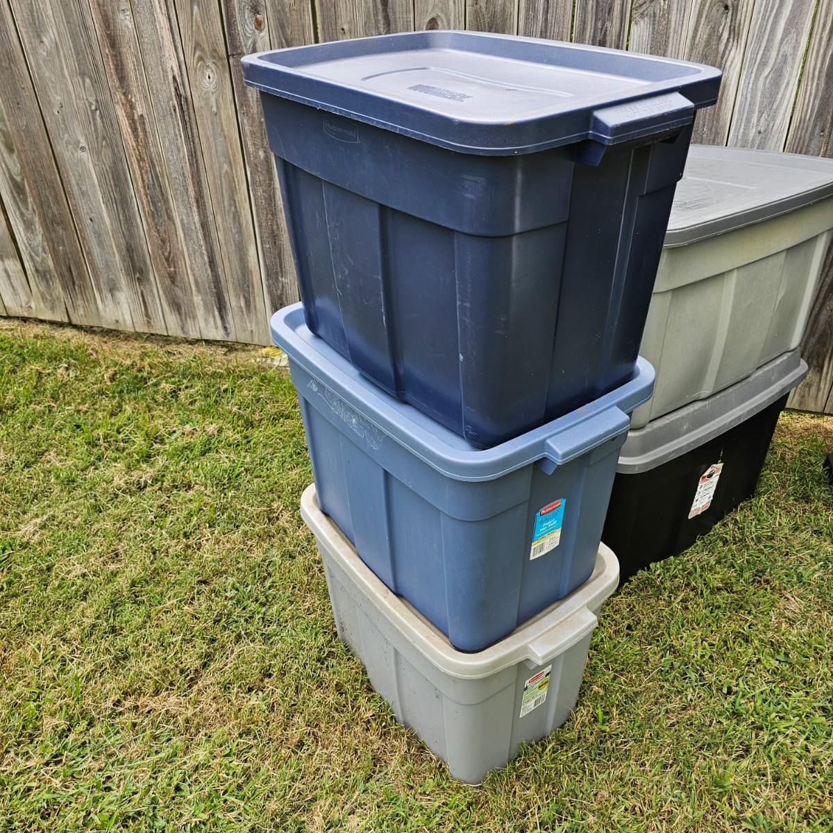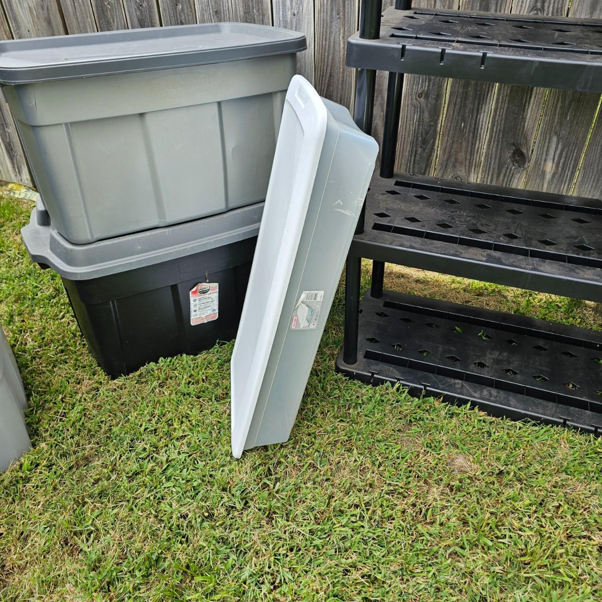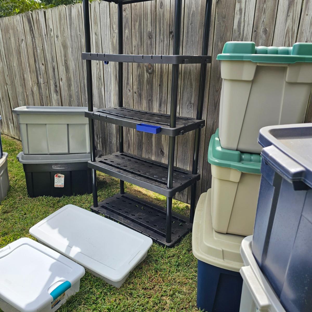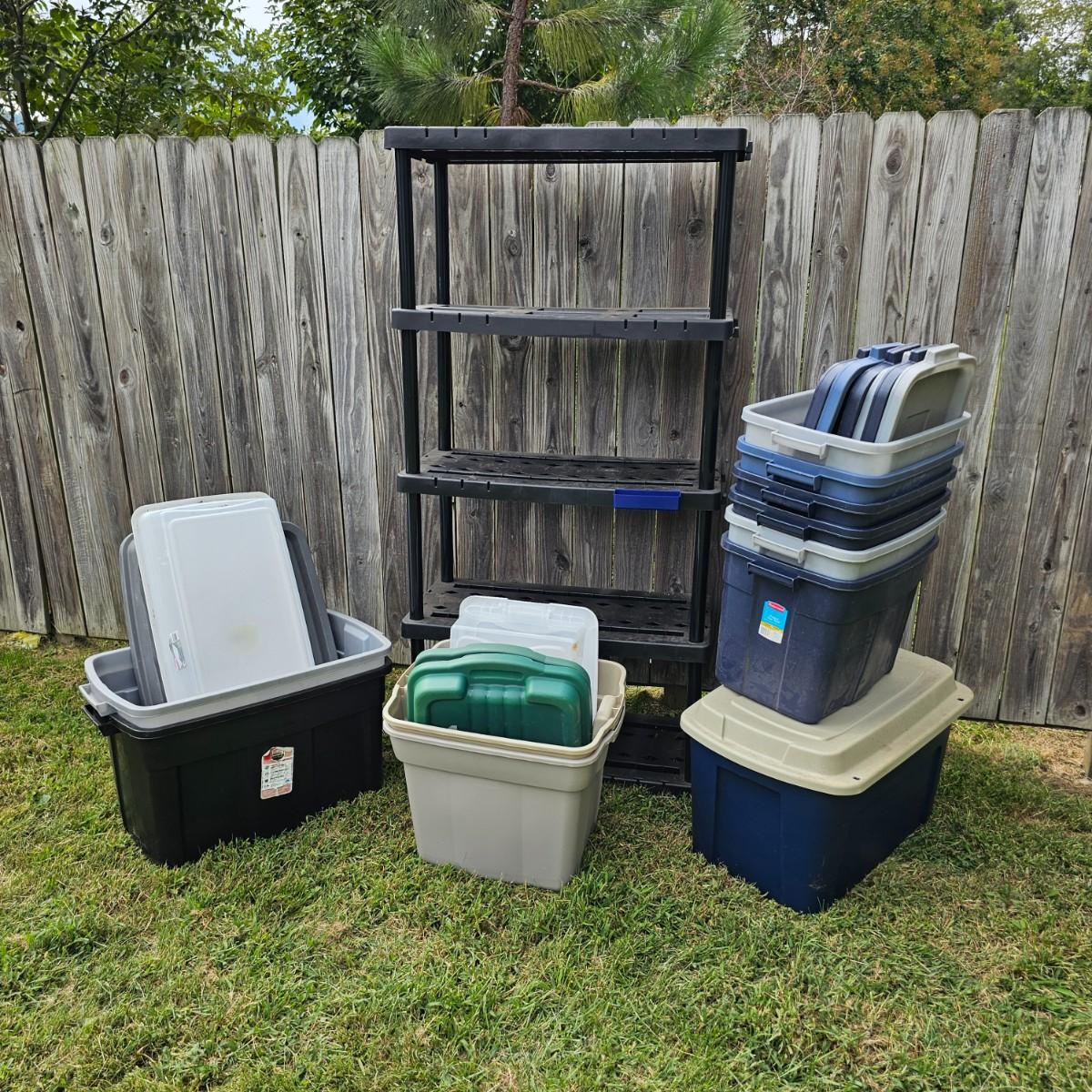 Thirteen assorted sizes of storage bins with lids, mostly Rubbermaid and Sterlite brands. Lids and sides on some need cleaning. Also one five shelf unit with wall brackets, measures 36" x 18" x 72"H. Wall brackets have been removed by seller, they are shown installed. See photos for details. Local pickup only. This lot is located in the shed. There is a step down to ground level. Will need to walk items through the yard. There is no driveway access to this location.