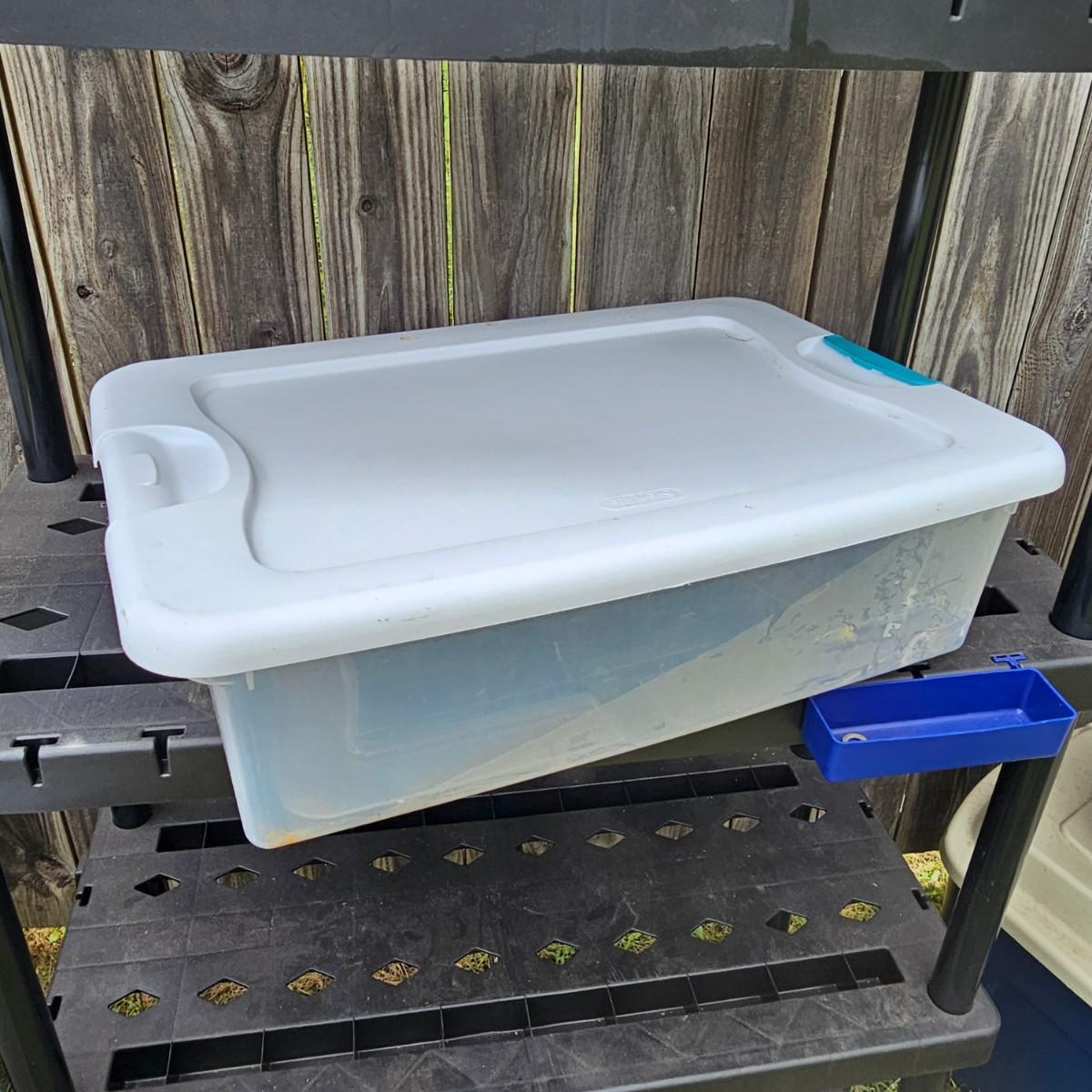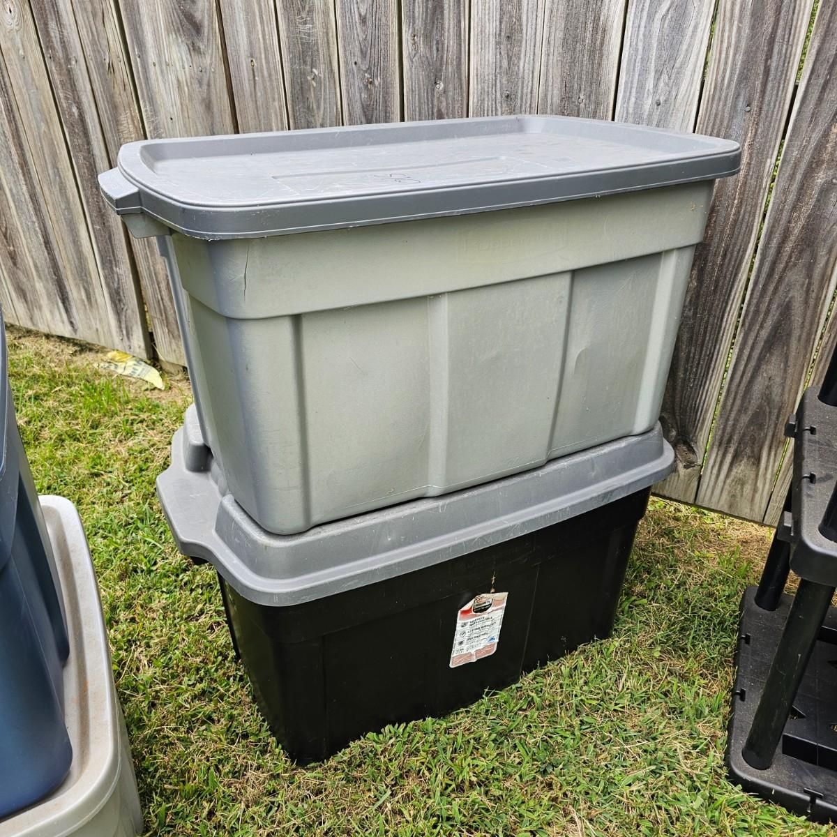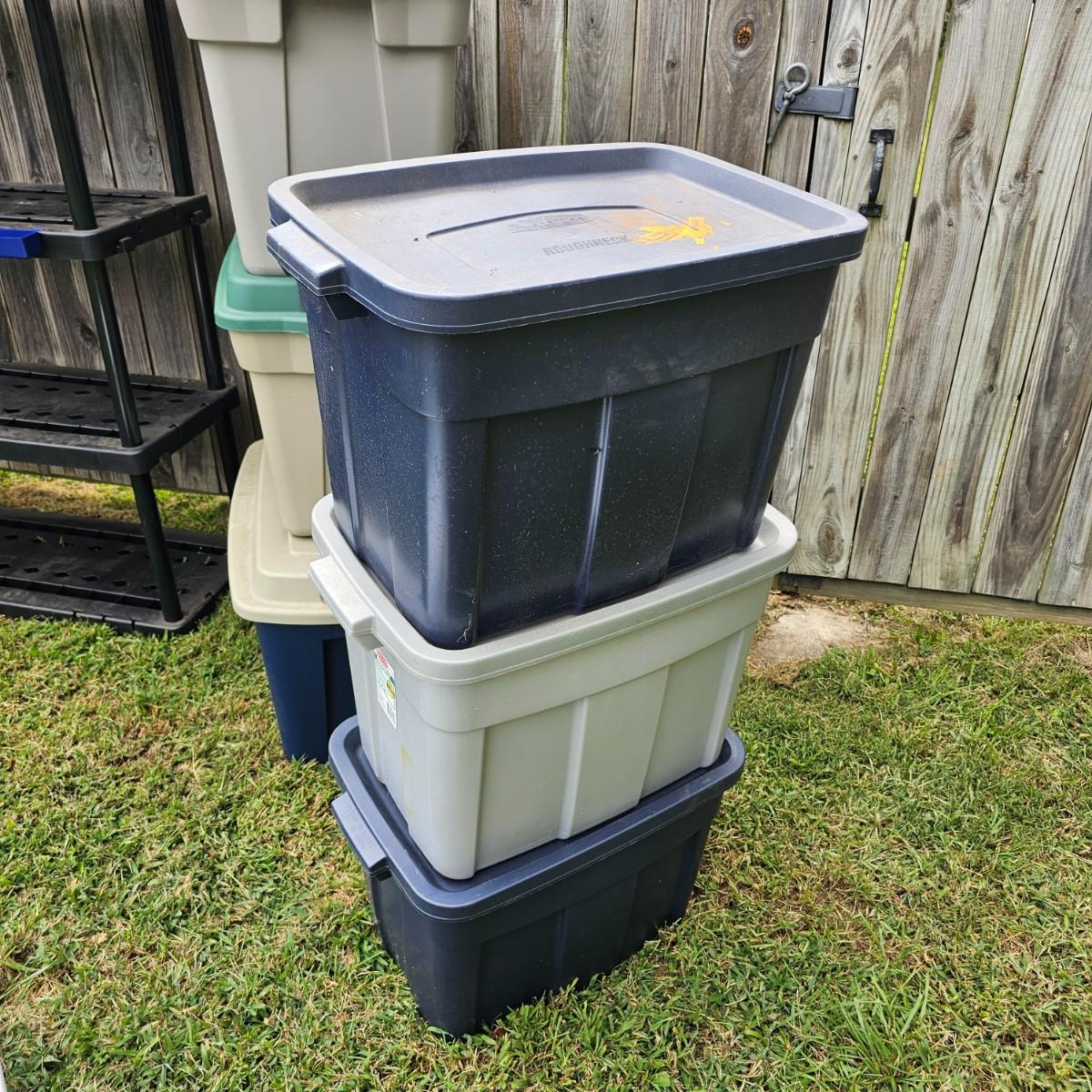 Thirteen assorted sizes of storage bins with lids, mostly Rubbermaid and Sterlite brands. Lids and sides on some need cleaning. Also one five shelf unit with wall brackets, measures 36" x 18" x 72"H. Wall brackets have been removed by seller, they are shown installed. See photos for details. Local pickup only. This lot is located in the shed. There is a step down to ground level. Will need to walk items through the yard. There is no driveway access to this location.