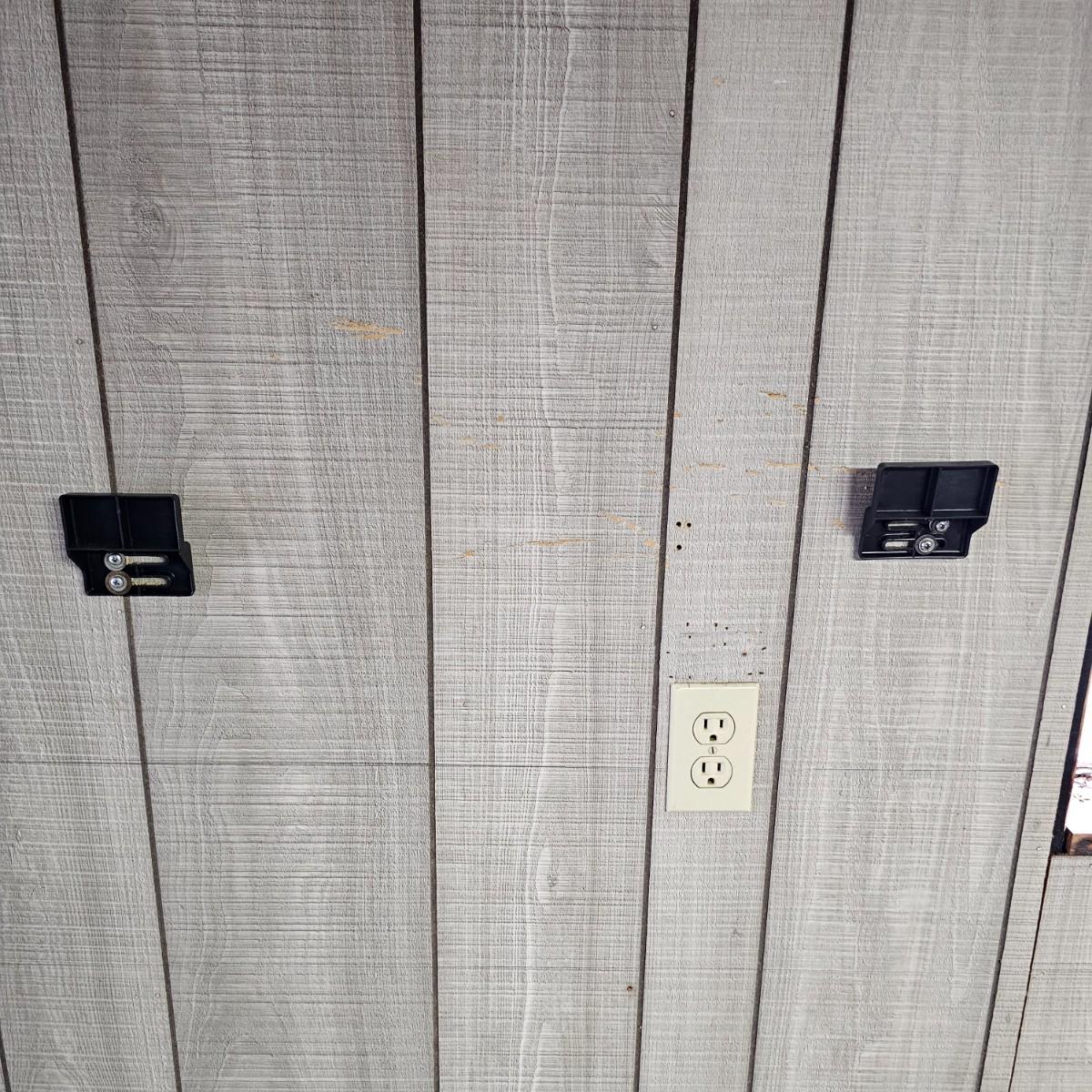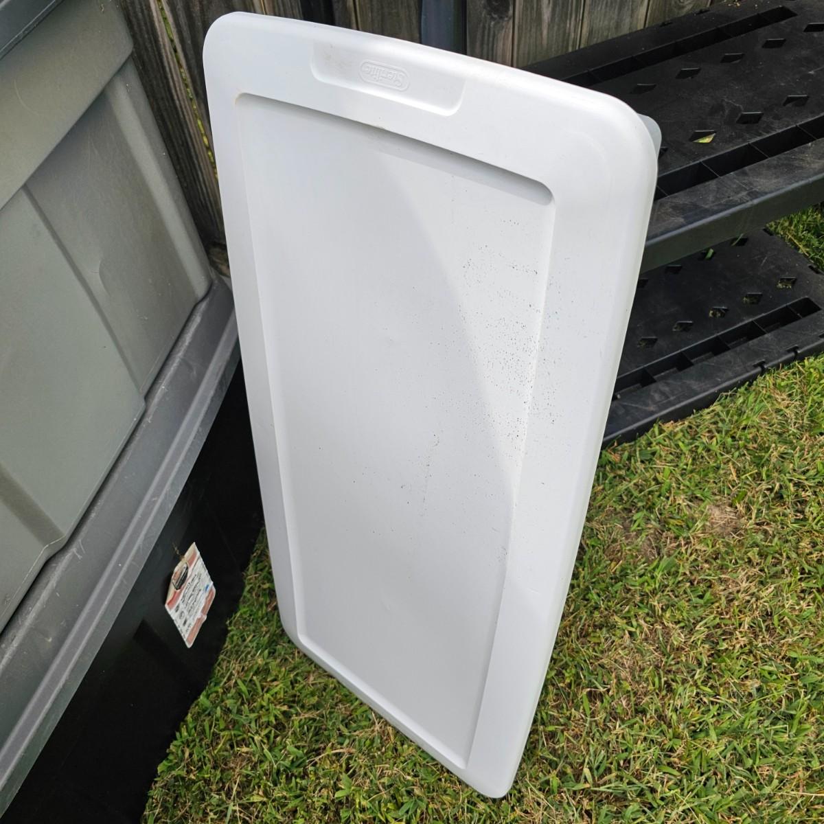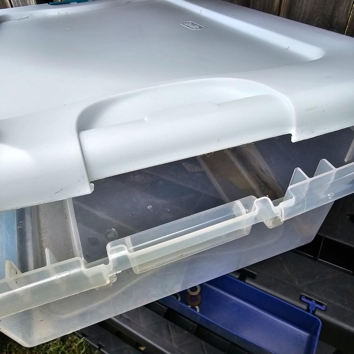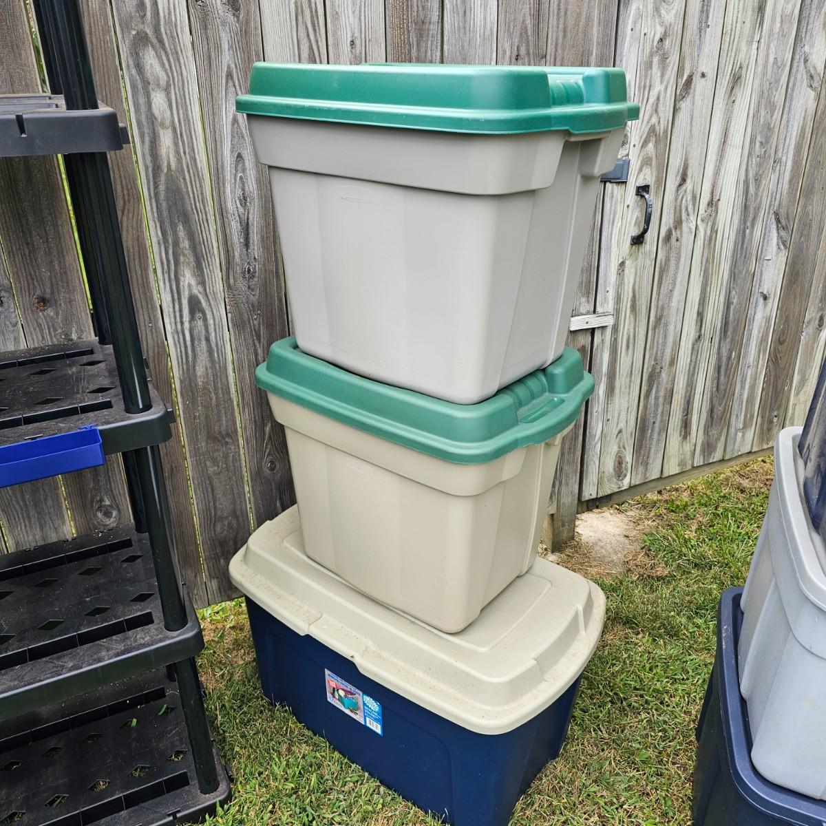 Thirteen assorted sizes of storage bins with lids, mostly Rubbermaid and Sterlite brands. Lids and sides on some need cleaning. Also one five shelf unit with wall brackets, measures 36" x 18" x 72"H. Wall brackets have been removed by seller, they are shown installed. See photos for details. Local pickup only. This lot is located in the shed. There is a step down to ground level. Will need to walk items through the yard. There is no driveway access to this location.